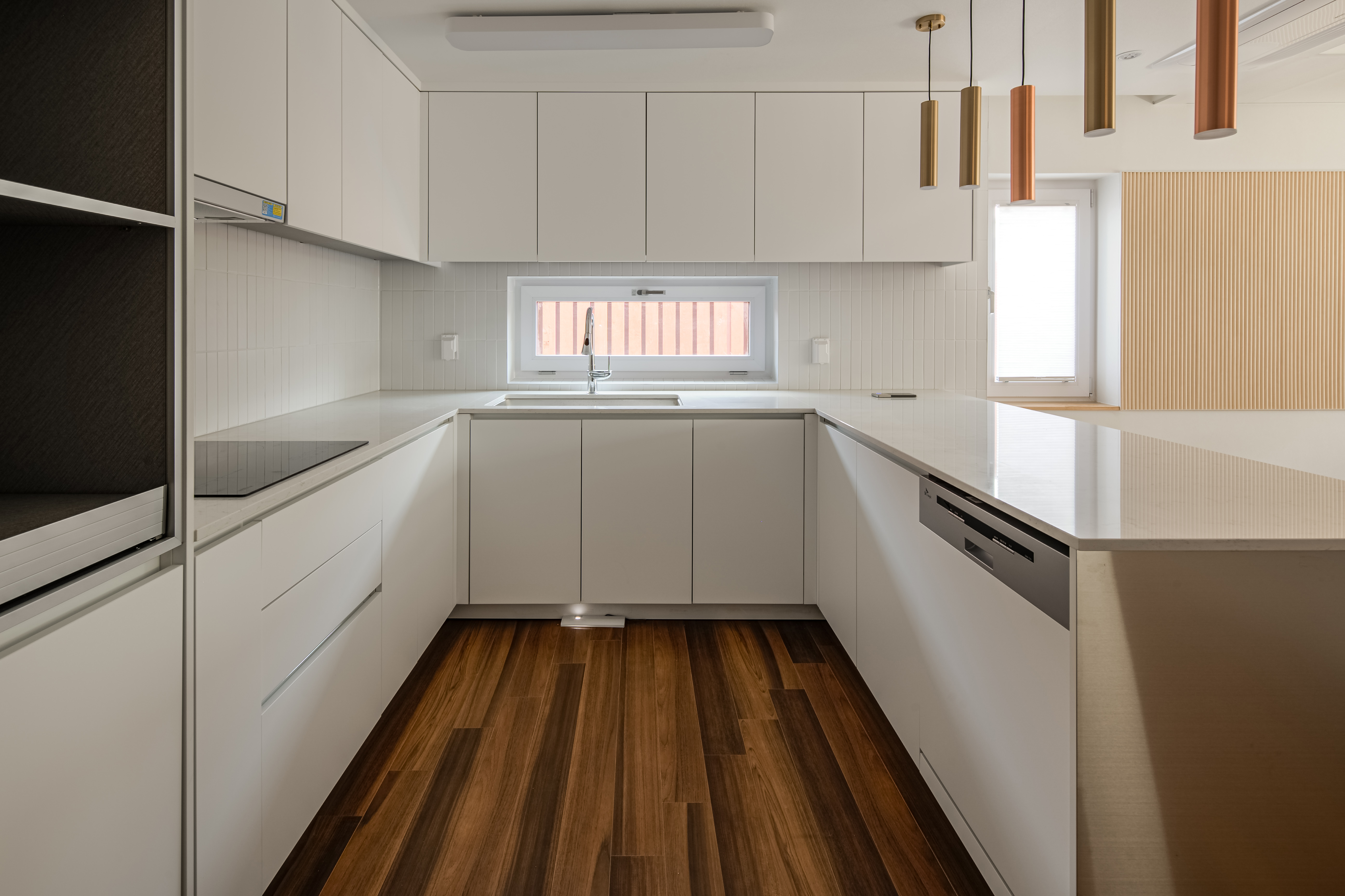 As for the floor plan, all rooms were connected by placing a corridor in the middle, but on one side, the sub-spaces such as the bathrooms, kitchen, and supplementary kitchen were placed, and on the other side, the living room, master bedroom, and children’s bedroom were arranged to allow them to have better natural lighting. In the attic space, the height of the ceiling was raised in the part where the circulation leads, and cabinet furniture was planned on the other side considering space utilization. The rooftop terrace was designed in a spacious way to enhance the usability of exterior space.