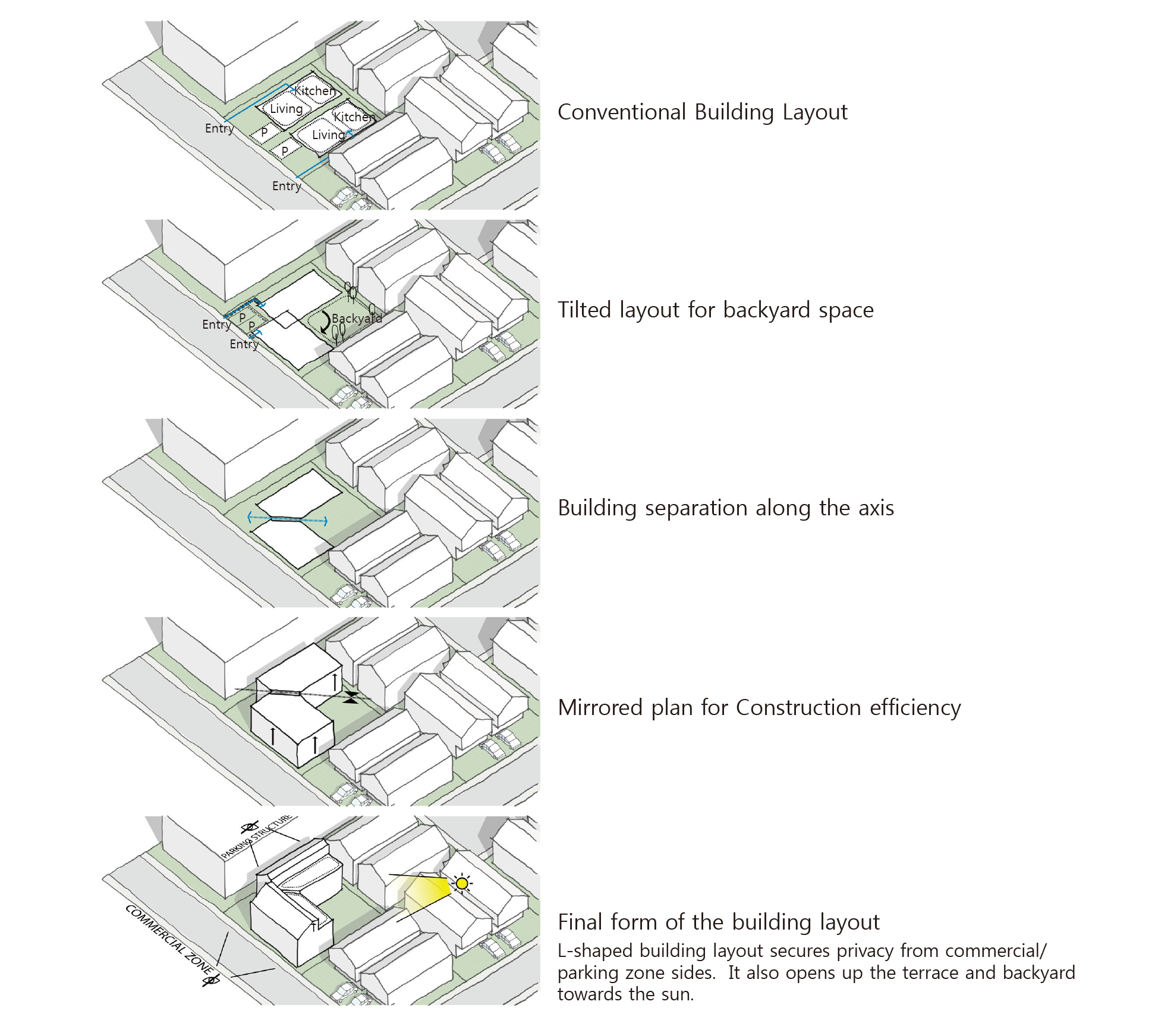 대부분 땅콩주택(듀플렉스 하우스)은 벽을 공유하는 똑같은 형태로 공사비 절감 등의 효과를 기대한다. 대지 안에 2동의 똑같은 단독주택을 계획하다 보면 11자 형태로 나란히 배치되는 경우가 많고, 이 경우 전면의 충분한 주차공간을 마련하고 인접 대지 경계에서 이격하여 주택을 배치하다 보면 마당이라고 할 수 있는 공간이 없다. 주택의 진입구가 양 측면에 위치하며, 거실이 전면 도로 방향으로, 주방이 후면으로 배치되는 경우가 많았다. 도로변으로 열린 거실은 행인들의 시선 때문에 집 안에서의 대부분 시간을 커튼이나 블라인드를 치고 살게 한다. 운양동 주택은 시공효율성은 높이되, 생활을 위한 배치가 중점이 되어야 했다.