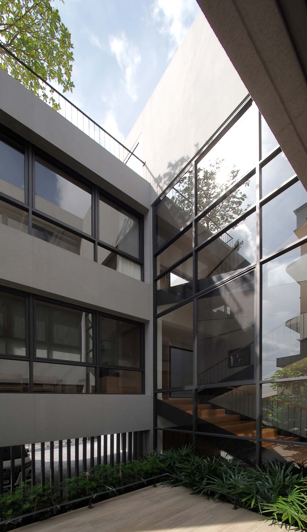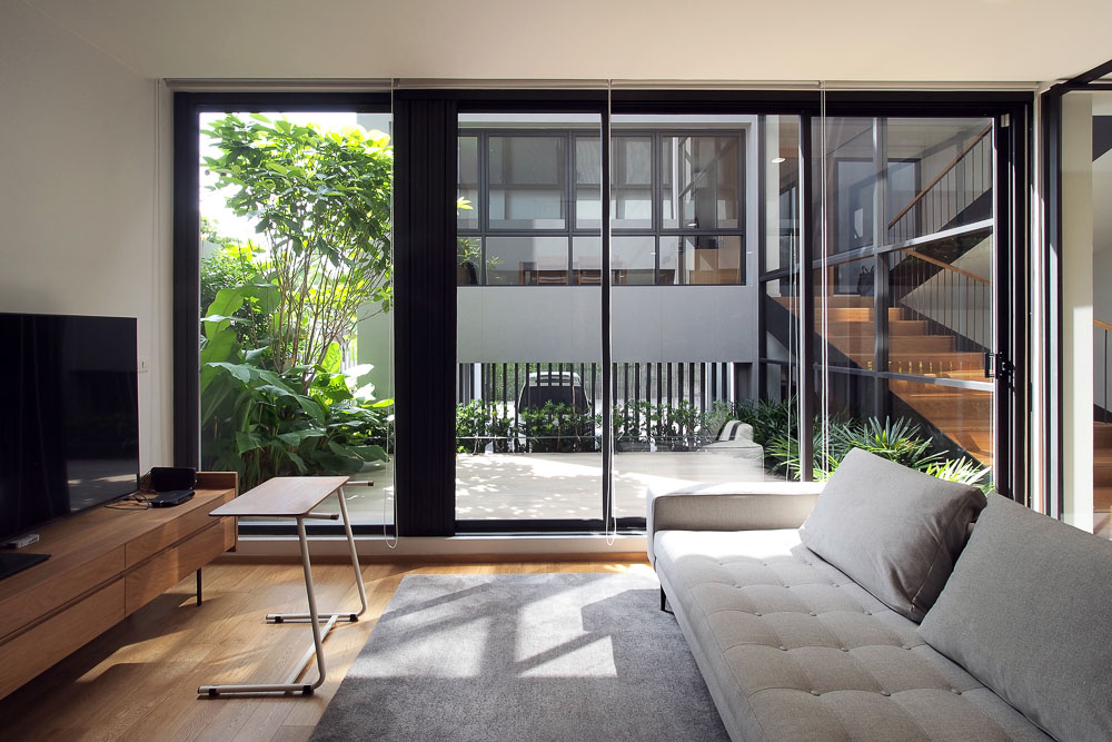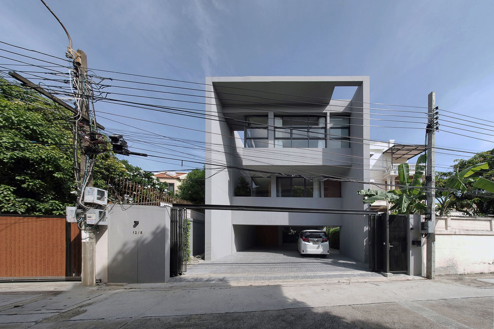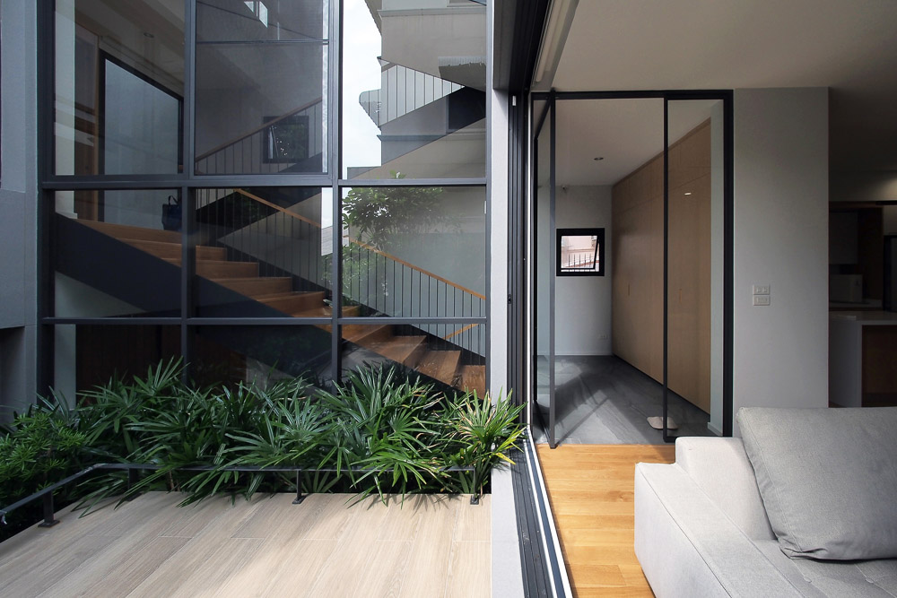 The exterior of this three-leveled house has a recessed stepped facade with the building frame and the vertical void, which allows the natural light to play a leading role in casting the shadow from the opening skylight. At the same time, the recessed facade can provide shading for the floor below. The ground level starts with six parking lots, partitioned for the living area's privacy by a raised courtyard of 4 x 5 square meters with a green boundary to separate the privacy of the living area from the street level. At the same time, the half flight of a staircase divides functions from the front and back of a building. The main entrance leads to a central living area in the back part of the house, which is elevated between parking lots and the study room on its opposite side - the front, the space between two sides located in a central courtyard which provides privacy for each function. While this split level concept is applied to the whole building on level 2 for the study room, guest bedroom, level 2.5 for the master bedroom, level 3 for two bedrooms, level 3.5 for the exercise area, and the stair leads to a rooftop garden. The smaller vertical void with the green space on levels 2 and 3 in the front part fulfills the natural light and ventilation for the guest bedroom on level 2 and the bedroom on level 3, which do not connect with the central court.