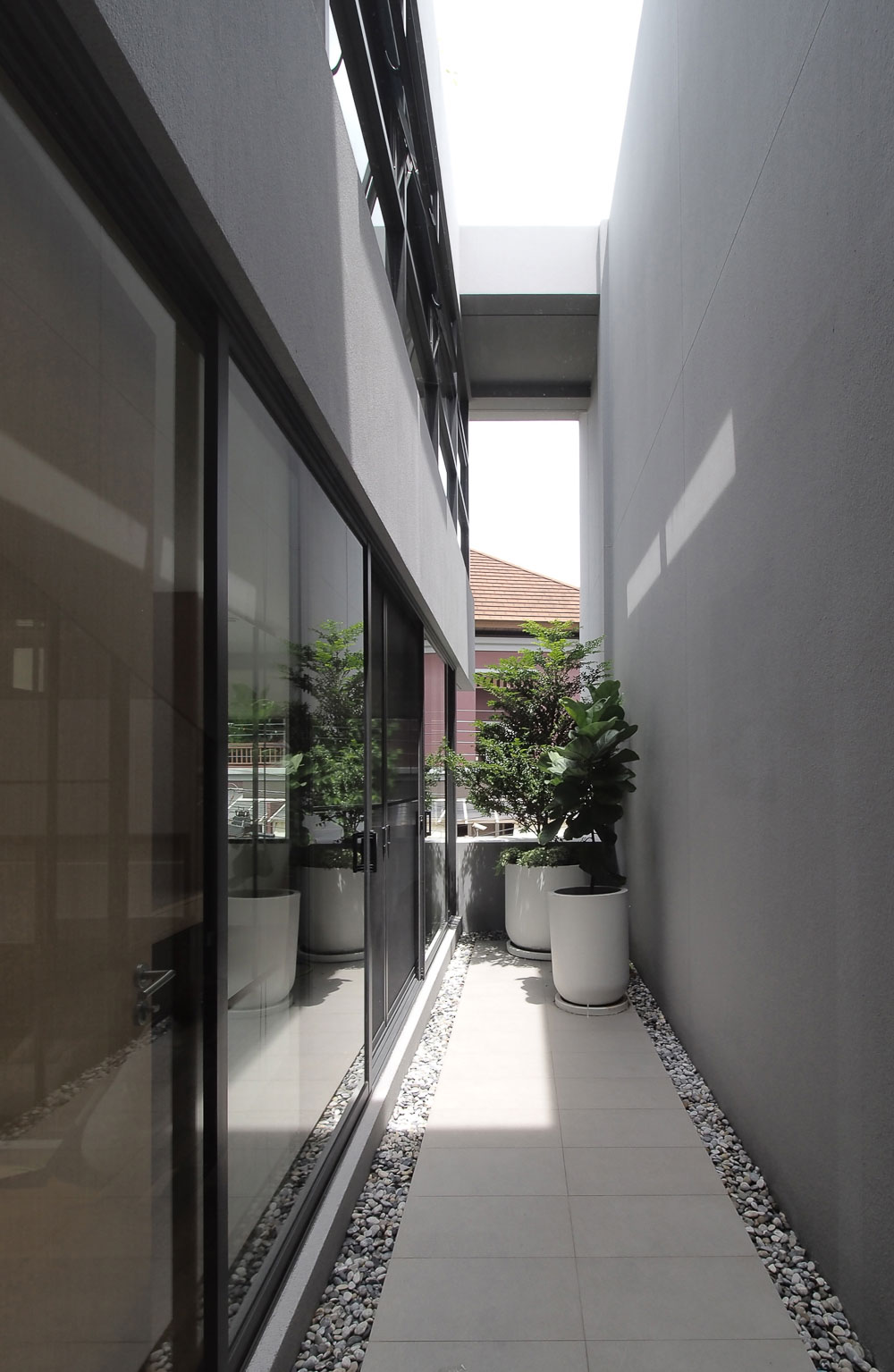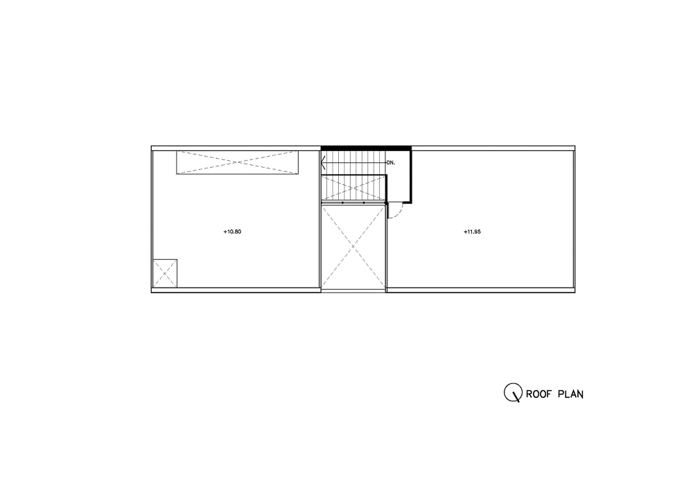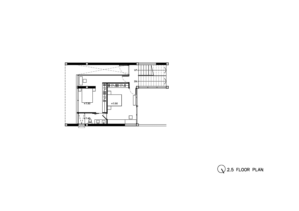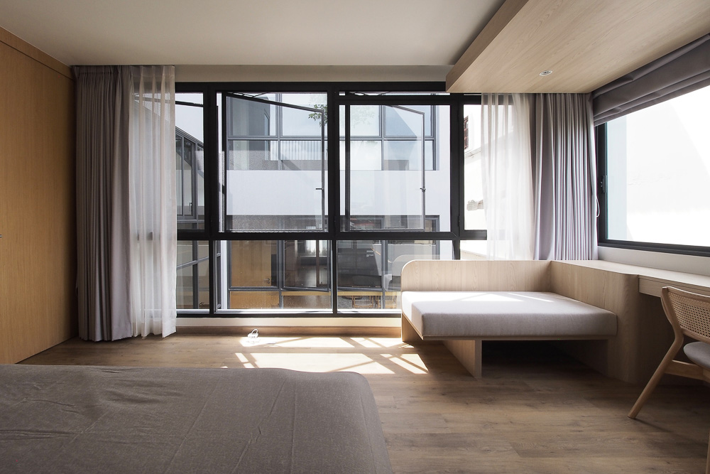 The exterior of this three-leveled house has a recessed stepped facade with the building frame and the vertical void, which allows the natural light to play a leading role in casting the shadow from the opening skylight. At the same time, the recessed facade can provide shading for the floor below. The ground level starts with six parking lots, partitioned for the living area's privacy by a raised courtyard of 4 x 5 square meters with a green boundary to separate the privacy of the living area from the street level. At the same time, the half flight of a staircase divides functions from the front and back of a building. The main entrance leads to a central living area in the back part of the house, which is elevated between parking lots and the study room on its opposite side - the front, the space between two sides located in a central courtyard which provides privacy for each function. While this split level concept is applied to the whole building on level 2 for the study room, guest bedroom, level 2.5 for the master bedroom, level 3 for two bedrooms, level 3.5 for the exercise area, and the stair leads to a rooftop garden. The smaller vertical void with the green space on levels 2 and 3 in the front part fulfills the natural light and ventilation for the guest bedroom on level 2 and the bedroom on level 3, which do not connect with the central court.