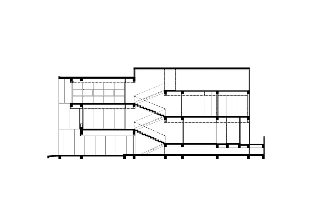 The exterior design tends to be a simple mass cut out of voids with a textured gray wall selected as the primary material to express a monotone look for the outer atmosphere to reflect an atmosphere by casting a shadow of the landscape on the wall.