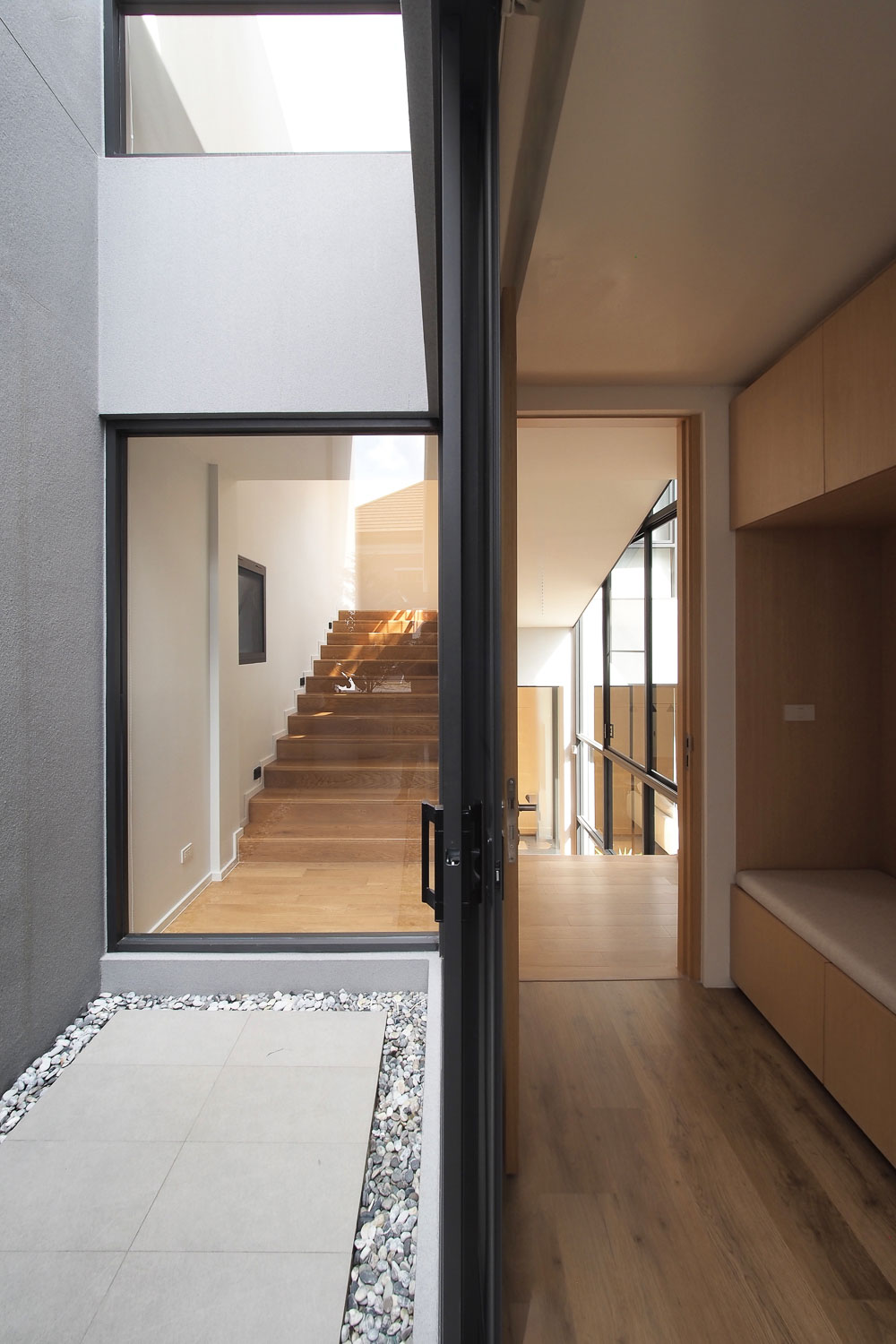 ASWA designed a split-level house divided by its staircase in the middle of the house to create a central courtyard for privacy between spaces and another smaller court in the front of the house to offer every room a court view.