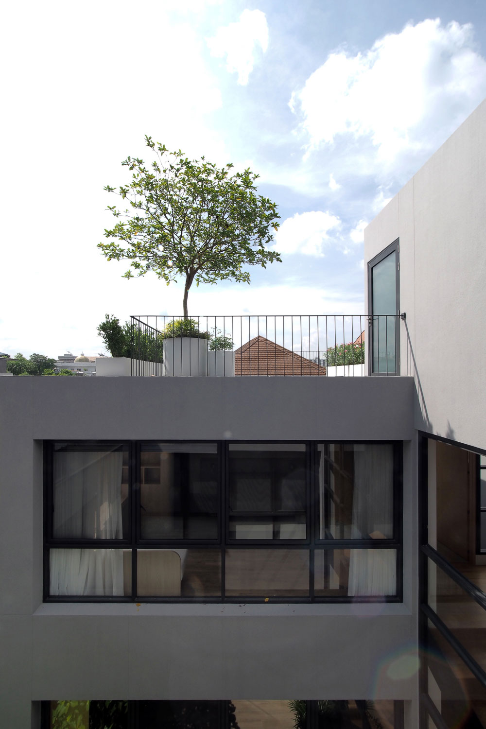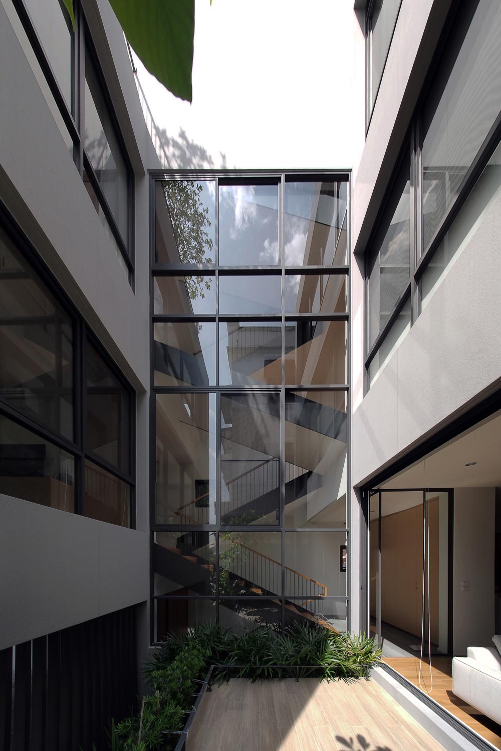 이 3층 주택의 외관은 건물 프레임과 수직 공간이 있는 오목한 계단식 파사드를 가지고 있어 자연광이 개구부 천창에서 그림자를 드리우는 주도적인 역할을 할 수 있다. 동시에, 움푹 들어간 정면은 아래 바닥에 음영을 제공한다. 1층은 6개의 주차장으로 시작하며, 거실 공간의 프라이버시를 위해 4 x 5㎡ 높이의 안뜰로 구분되며, 녹지 경계가 있어 거실 공간과 거리의 레벨을 분리한다. 동시에 계단의 반쪽이 건물의 전면과 후면의 기능을 나눈다. 주 출입구는 주택 뒤편의 중앙 거실로 이어지며 반대편의 주차장과 서재 사이에 위치한다. 전면, 양쪽 사이 공간은 중앙 안뜰에 위치하여 각각의 프라이버시를 제공한다. 스플릿 레벨 개념은 건물 전체에 적용되는데 서재와 게스트 침실이 2층에 있고, 마스터 침실의 경우 2.5층에, 두개의 다른 침실은 3층에, 그리고 운동실은 3.5층에 위치하며 여기에서 옥상정원으로 이어지는 계단이 있다. 정면에 있는 2층과 3층의 녹지 공간의 작은 수직 보이드는 중앙 안뜰과 연결되지 않은 2층의 게스트 침실과 3층의 침실을 위한 자연 채광과 환기를 충족시킨다.