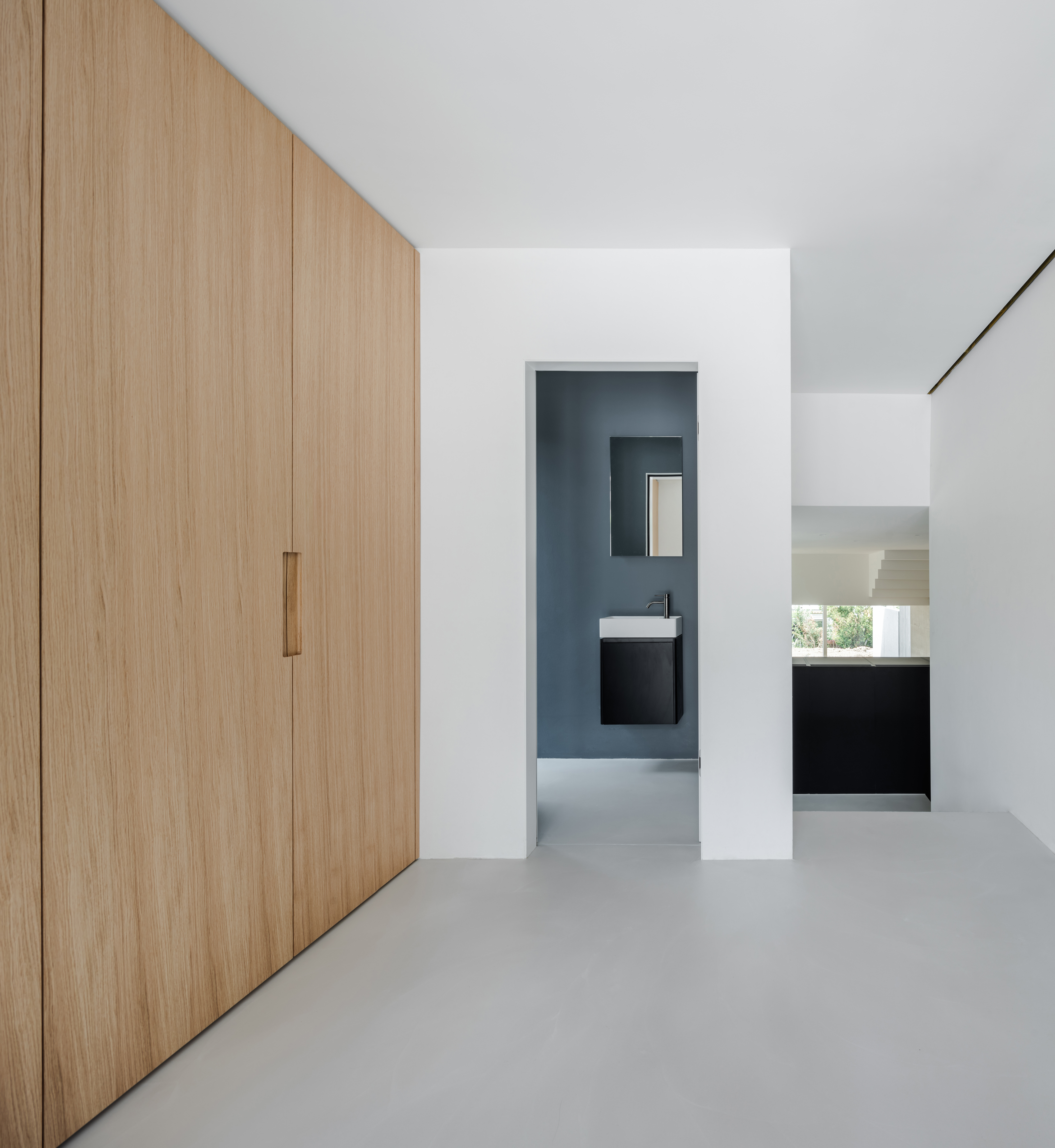 The entrance volume detaches the main building from the street, offering a private space for the living area. This way the residents enjoy an intimate living space with a secluded environment from the street. Following the trail of existing terrain, the half-story staircase directs towards the open kitchen and living area which includes large glass openings with a tall and elevated design of the floor producing transparency that brings light into the interiors. These peculiar design features allow a bright and spacious kitchen and living area that allures residents to a more inviting, and multi-dimensional space.