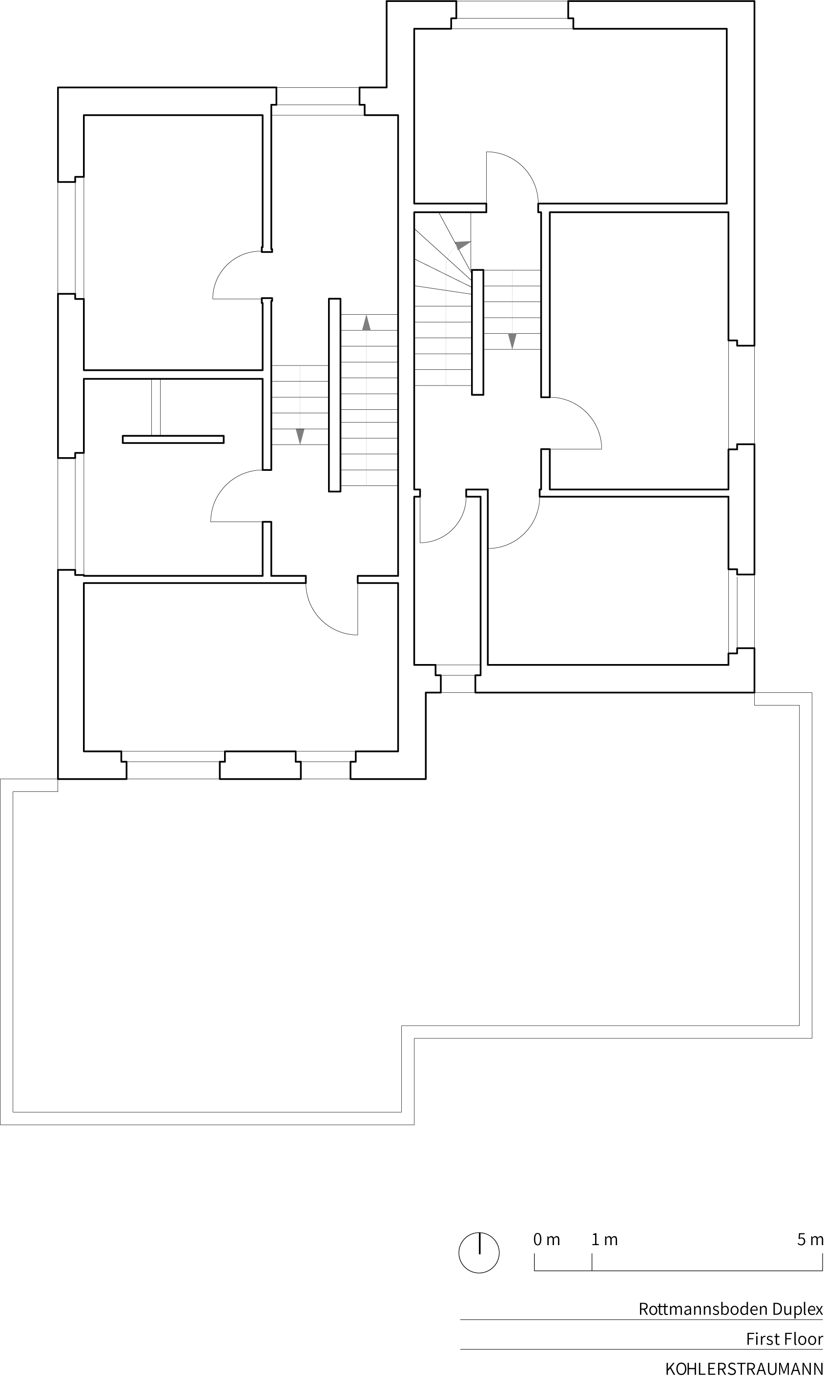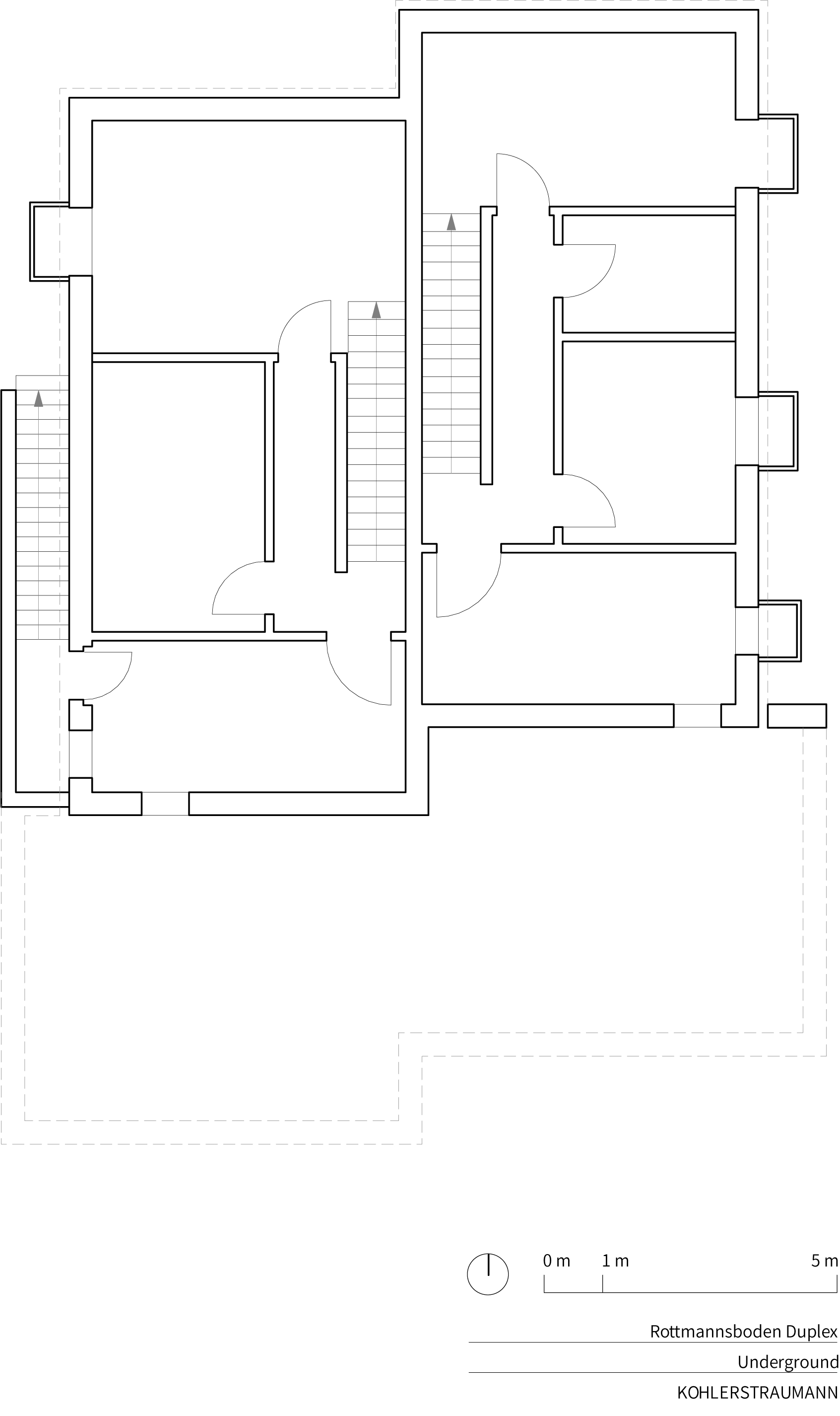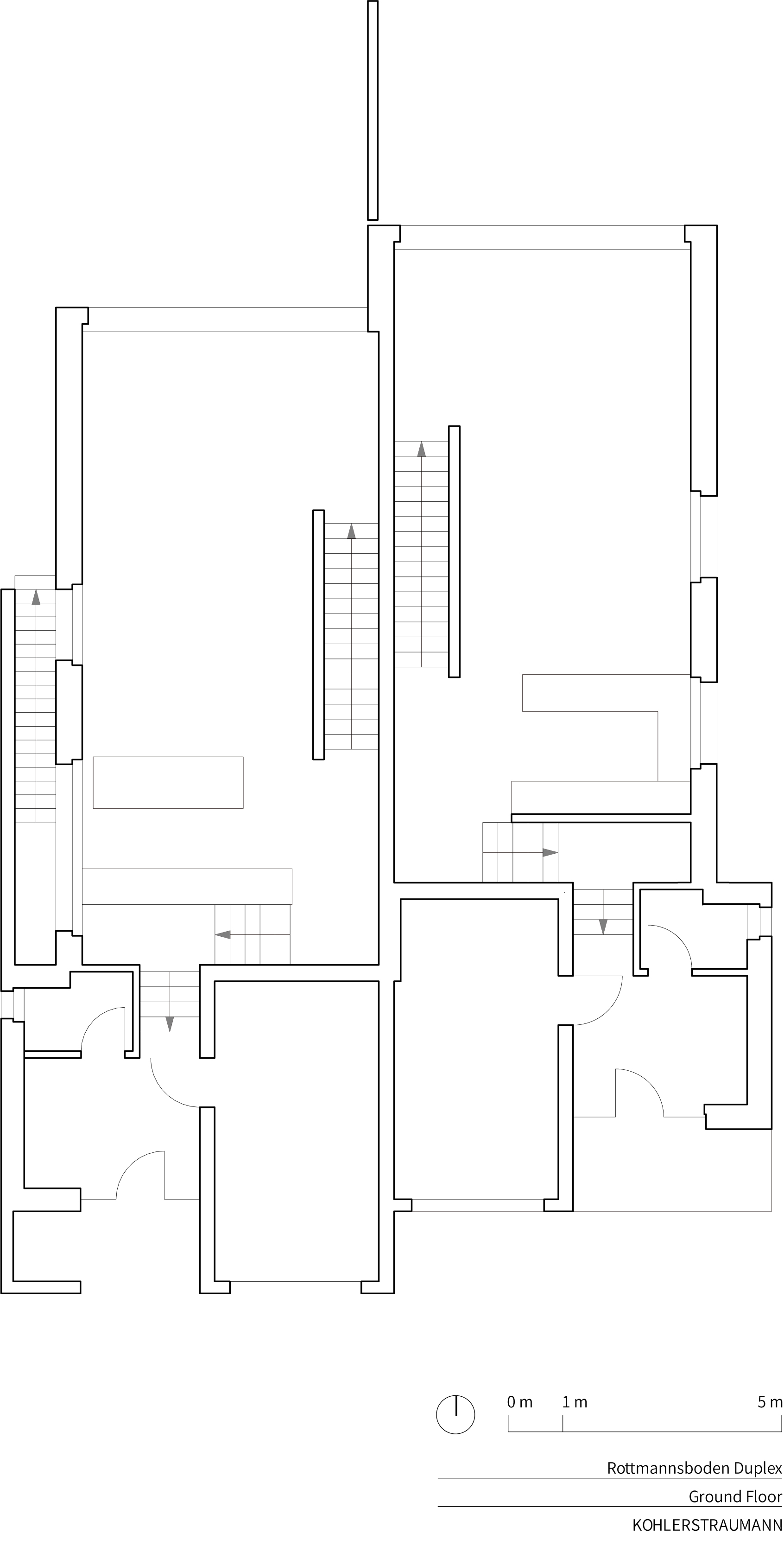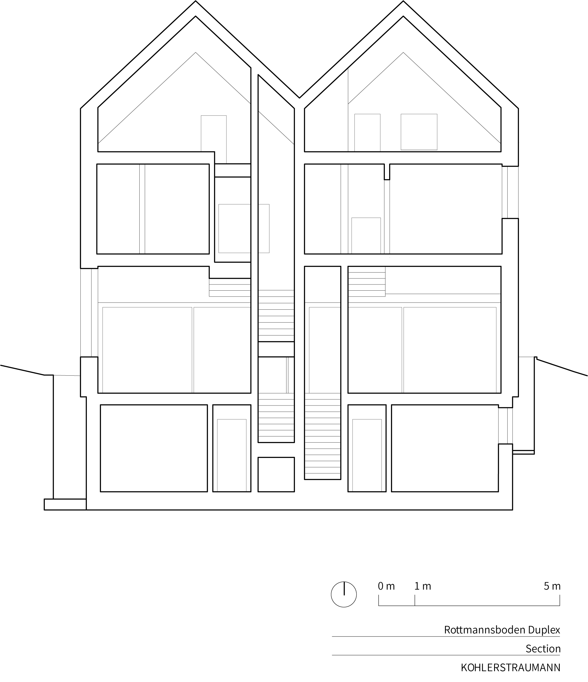 로트만스보덴 듀플렉스하우스는 스위스 비닝엔의 한적한 동네에 세워진 두 세대를 위한 집이다. 건물의 형태는 단독주택 같지만 차이점을 가지고 있다. 기존의 지형 조건에 따라 건설해야 하는 어려움을 해결하기 위해 건물은 비슷한 형태의 스플릿 플로어로 분리된다. 모든 공간을 효율적으로 사용하여 최적의 방 높이를 얻을 수 있는 공간을 가진다. 까다로운 지형적 조건을 가졌음에도 건축가는 거주자의 요구를 충족시키는 공간들을 적절히 배치하여, 혁신적인 설계 환경을 제공한다. 입구 볼륨은 본관을 거리에서 분리하여 생활 공간에 프라이버시를 제공한다. 이를 통해 거주자는 거리에서 단절된 환경과 친밀한 생활 공간을 즐길 수 있다. 기존 지형의 흔적을 따라가는 반 층 계단은 큰 유리창과 높은 바닥 디자인을 포함한 개방형 주방과 거실로 향하며, 이는 내부에 빛을 들이는 투명성을 생성한다. 이러한 독특한 디자인 기능은 밝고 넓은 주방과 거실 공간을 제공하여 거주자들을 보다 매력적이고 다차원적인 공간으로 끌어들인다. 샌드블라스트 처리된 콘크리트 재료의 노출된 표면은 특징적인 열 보호 기능으로 실내를 보호하는 역할을 한다. 또한, 우수한 단열 및 기후 차폐 특성을 통해 주택의 에너지 사용을줄인다. 이 재료는 집의 남쪽에 사용하여 무더운 날씨가 지속되는 혹독한 여름 동안 방과 공간을 보호한다.