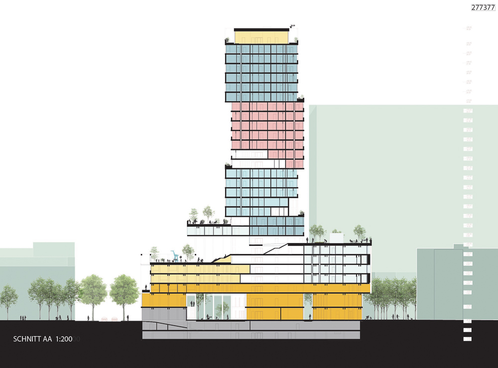 Multifunctionality The high rise is intended to house a wide range of activities and function. These include, residential functions comprising of a wide array of typologies and apartment sizes; social functions such as kindergartens, culture functions, neighbourhood restaurants and commercial functions such as offices, workshops, bakeries and cafes. The remaining programming is planned to be developed further in close cooperation with developers, authorities and the local community itself, in an active participation process, supporting the social profile of the overall concept.