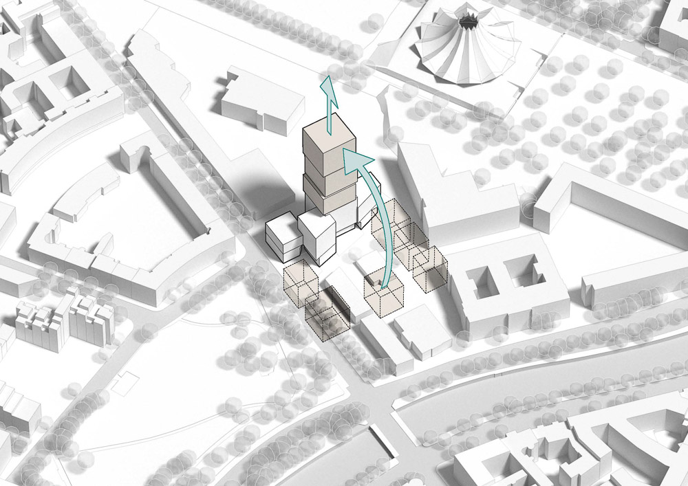 The plot is situated in the German capitals central Kreuzberg district. Kreuzberg is unconventional and diverse, and our goal has been to reflect this in our proposal for the high-rise. Our concept is therefore intended as a vertical interpretation of a typical Kreuzberg block.