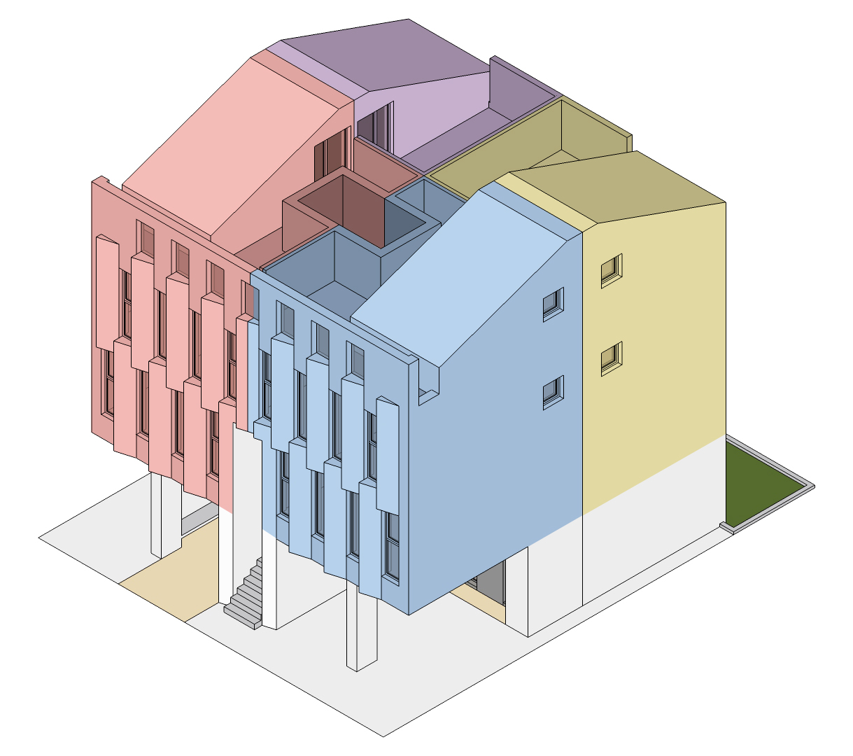 복층으로 구성된 네쌍둥이 같은 4가구는 4개의 집 모두 2층에서 출입하게 되어 엘리베이터 배제가 합리적 선택지가 되었고 모두 다락과 옥상정원을 가질 수 있어 임대인과 임차인의 위계를 지우고 동등한 거주 환경의 물리적 조건을 만족하게 했다.