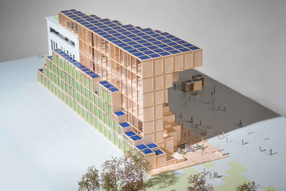 The Energy Plug is an adaptable prototype that can be clipped onto any ex-industrial building. Based on a prefabricated modular timber structure, its design defines interior comfort through allowing natural lighting and ventilation, limiting heat loss and controlling solar gain. A vertical greenhouse integrated in the south facade not only produces food, but also supports a pleasant indoor climate almost all year round and with no additional air conditioning. The building is protected from solar gain by the world’s first “solar canopy” that has a 4-fold utility: electricity and heat production; rainwater recovery and thermal protection.