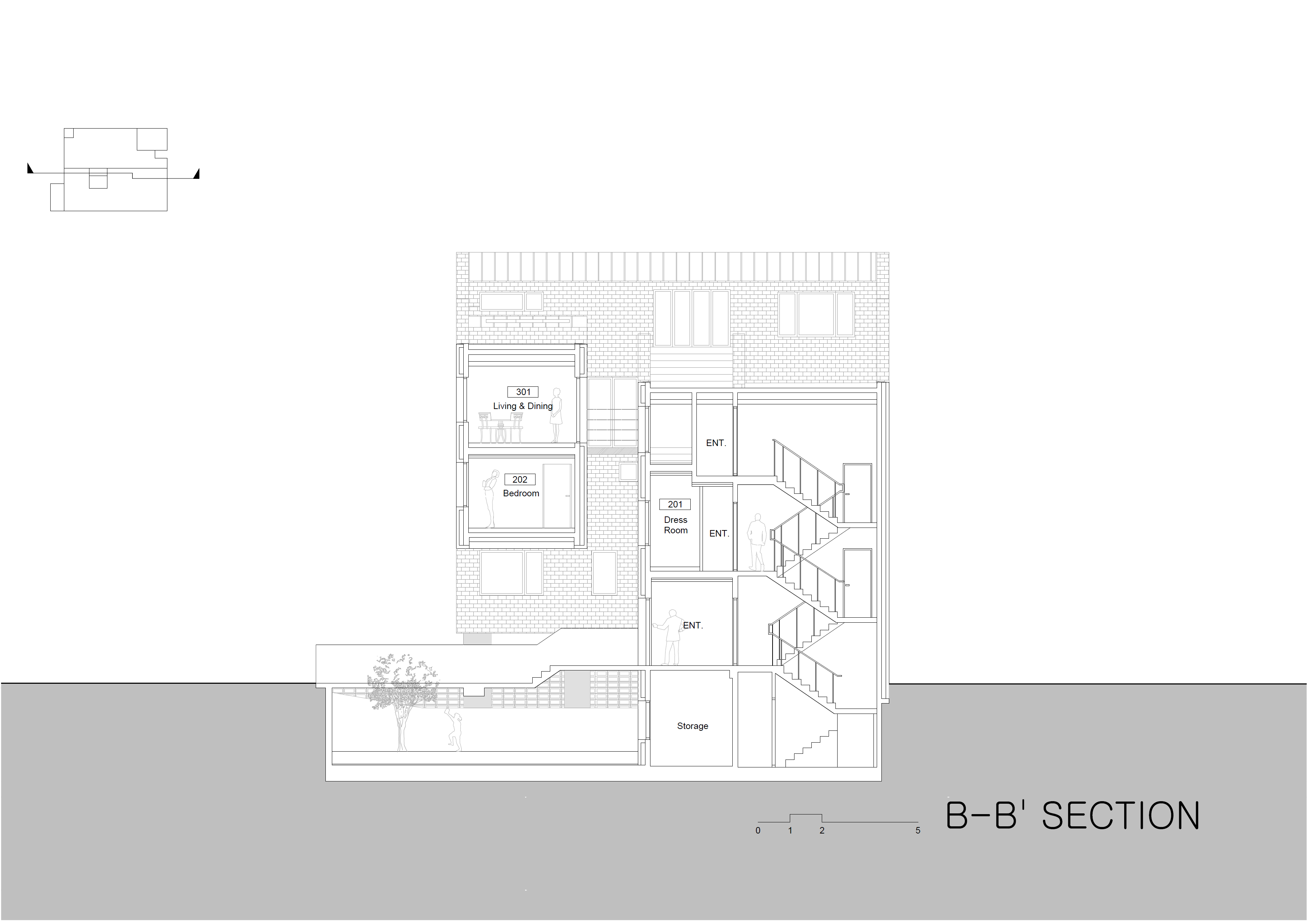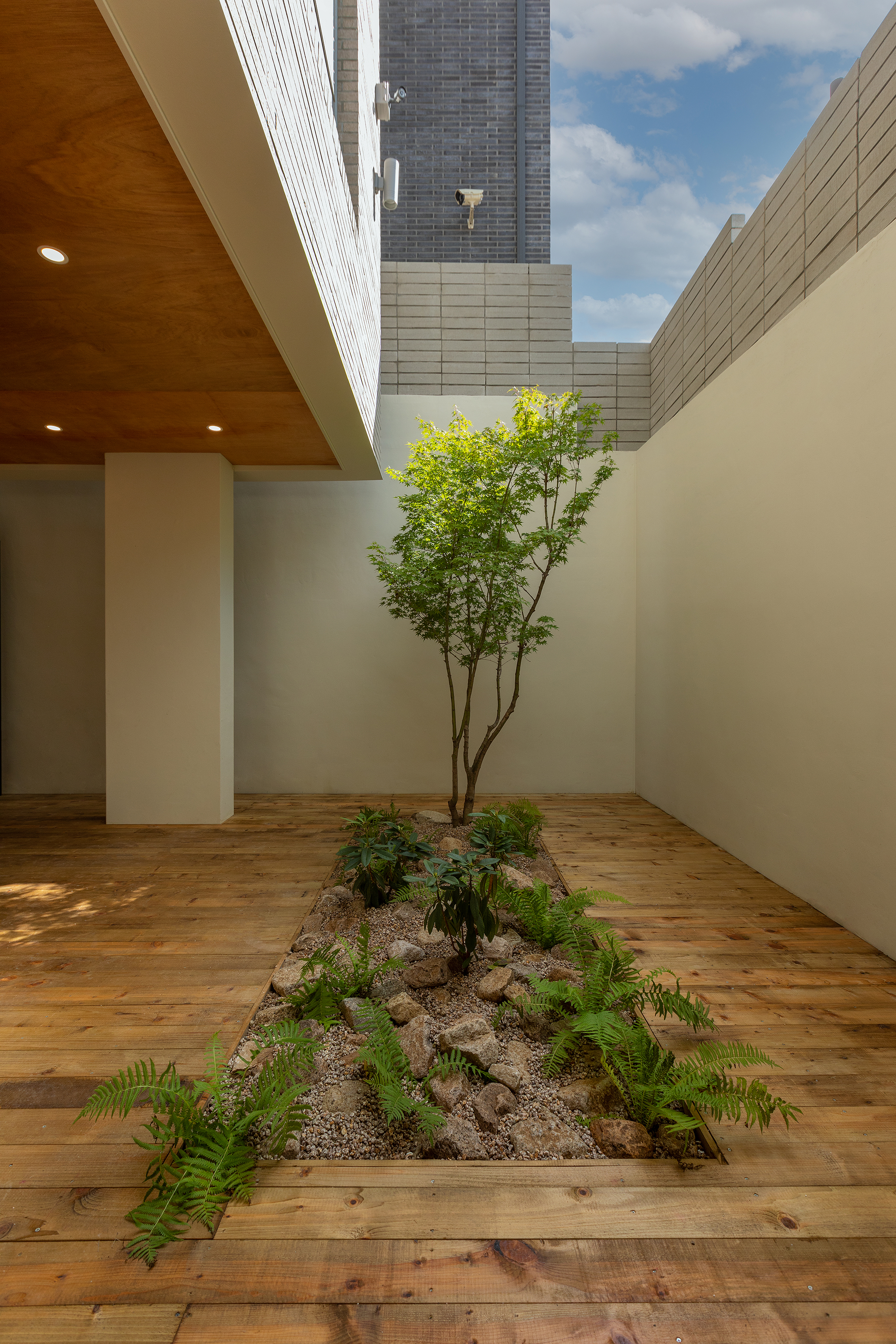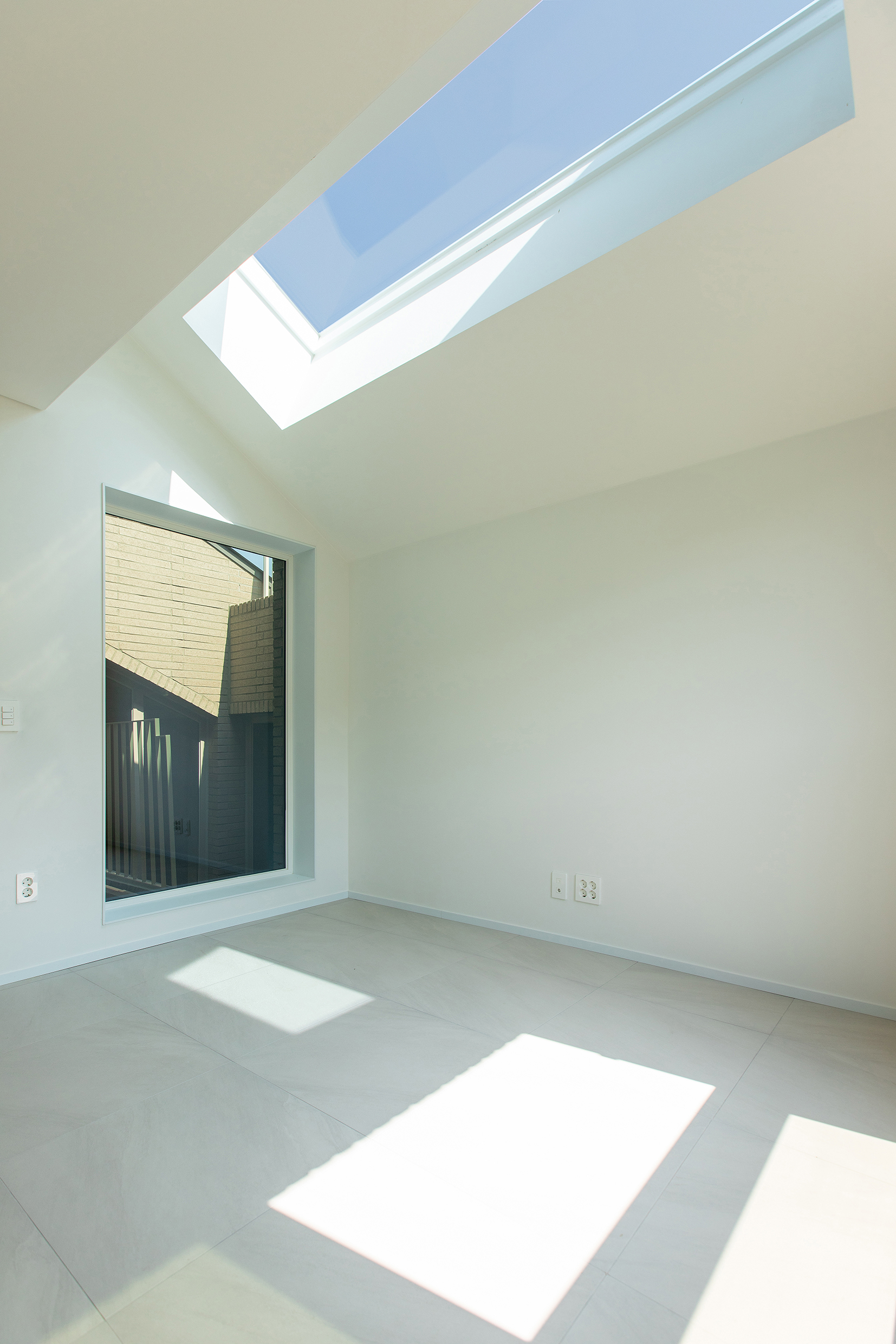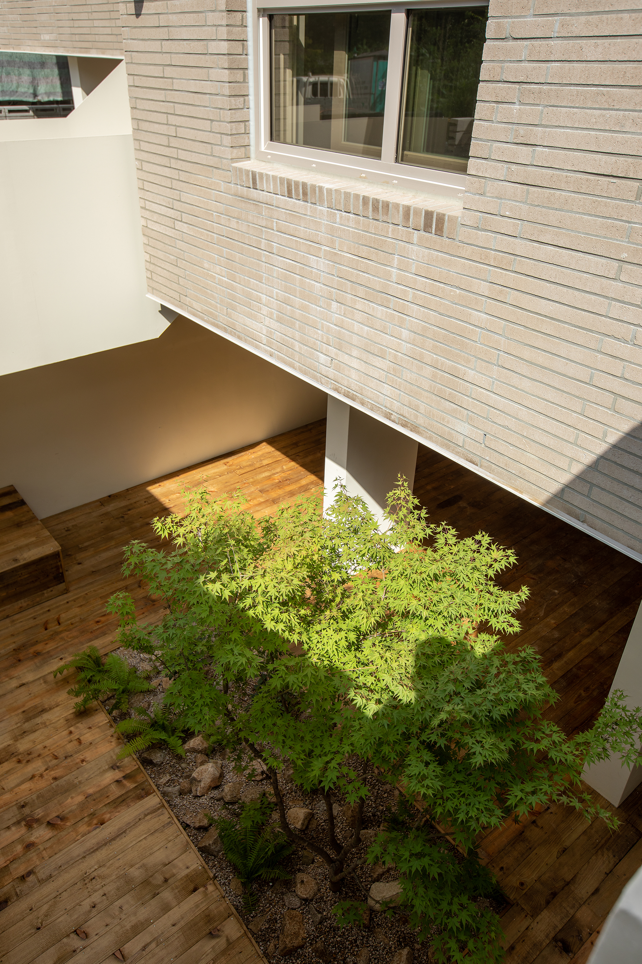 The access road is floating above the sunken garden, and while walking towards the door as if being sucked in, When you reach the front door, there is a courtyard facing the sky. Each house has windows and balconies facing each other through the courtyard. The light from the south is brought in through this small courtyard. The difference in elevation of the land naturally creates a skip floor, so the entrances of the 5th houses are all on different levels. Both living room and dining room are mainly arranged to the west with an open view to the pocket park. When entering the 3rd floor master's entrance hall, the master bedroom and a small room are arranged east to west, and when you go up the stairs facing the courtyard, the kitchen, dining and living room are placed in a row to bring in the west view and light into the house. A higher floor height is formed at the location of the sofa and a skylight is placed so that you can feel the change of seasons.