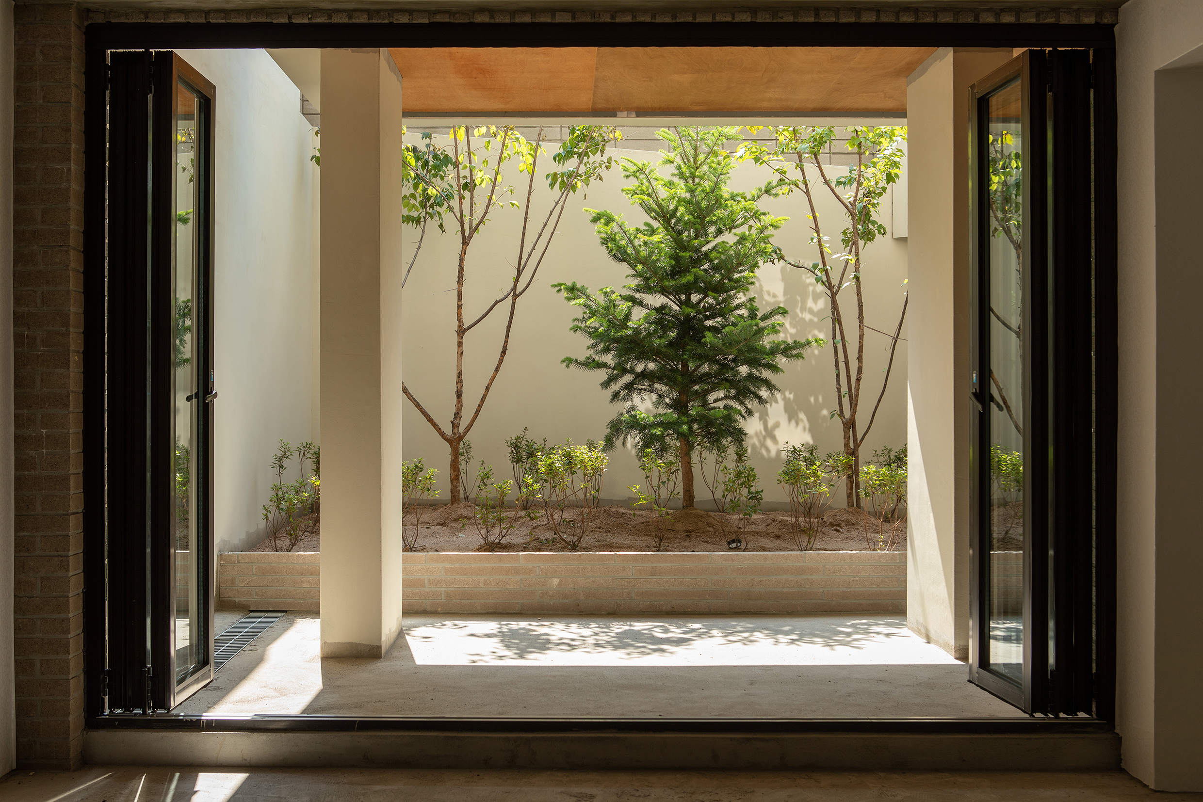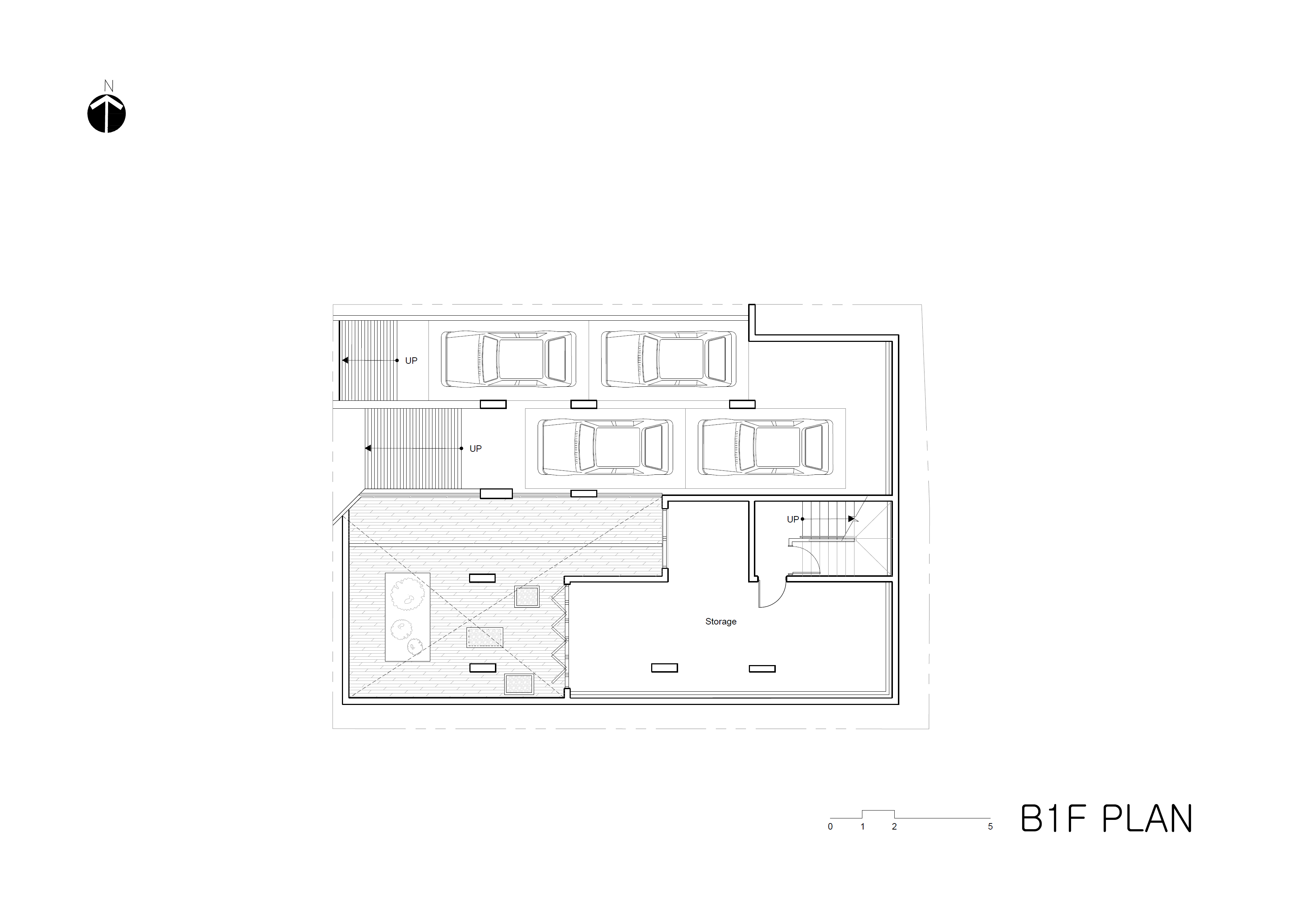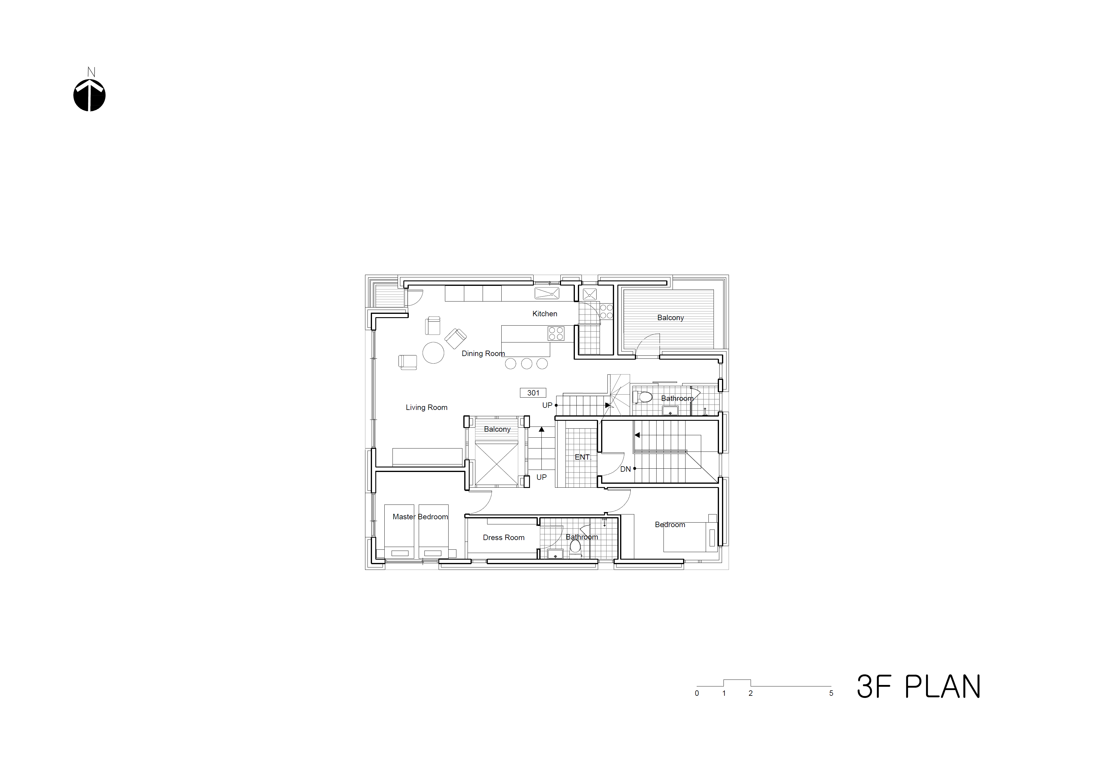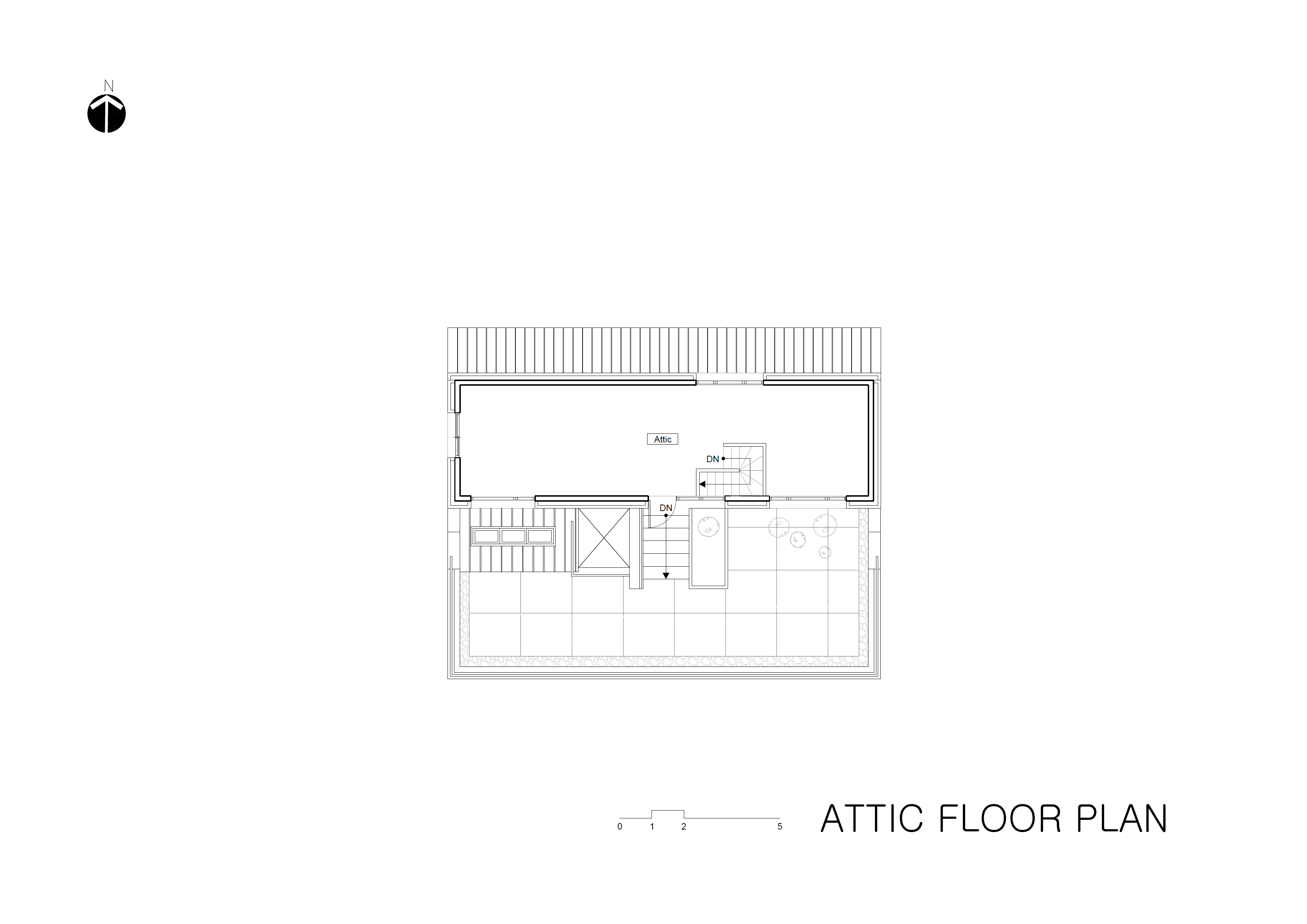 The access road is floating above the sunken garden, and while walking towards the door as if being sucked in, When you reach the front door, there is a courtyard facing the sky. Each house has windows and balconies facing each other through the courtyard. The light from the south is brought in through this small courtyard. The difference in elevation of the land naturally creates a skip floor, so the entrances of the 5th houses are all on different levels. Both living room and dining room are mainly arranged to the west with an open view to the pocket park. When entering the 3rd floor master's entrance hall, the master bedroom and a small room are arranged east to west, and when you go up the stairs facing the courtyard, the kitchen, dining and living room are placed in a row to bring in the west view and light into the house. A higher floor height is formed at the location of the sofa and a skylight is placed so that you can feel the change of seasons.
