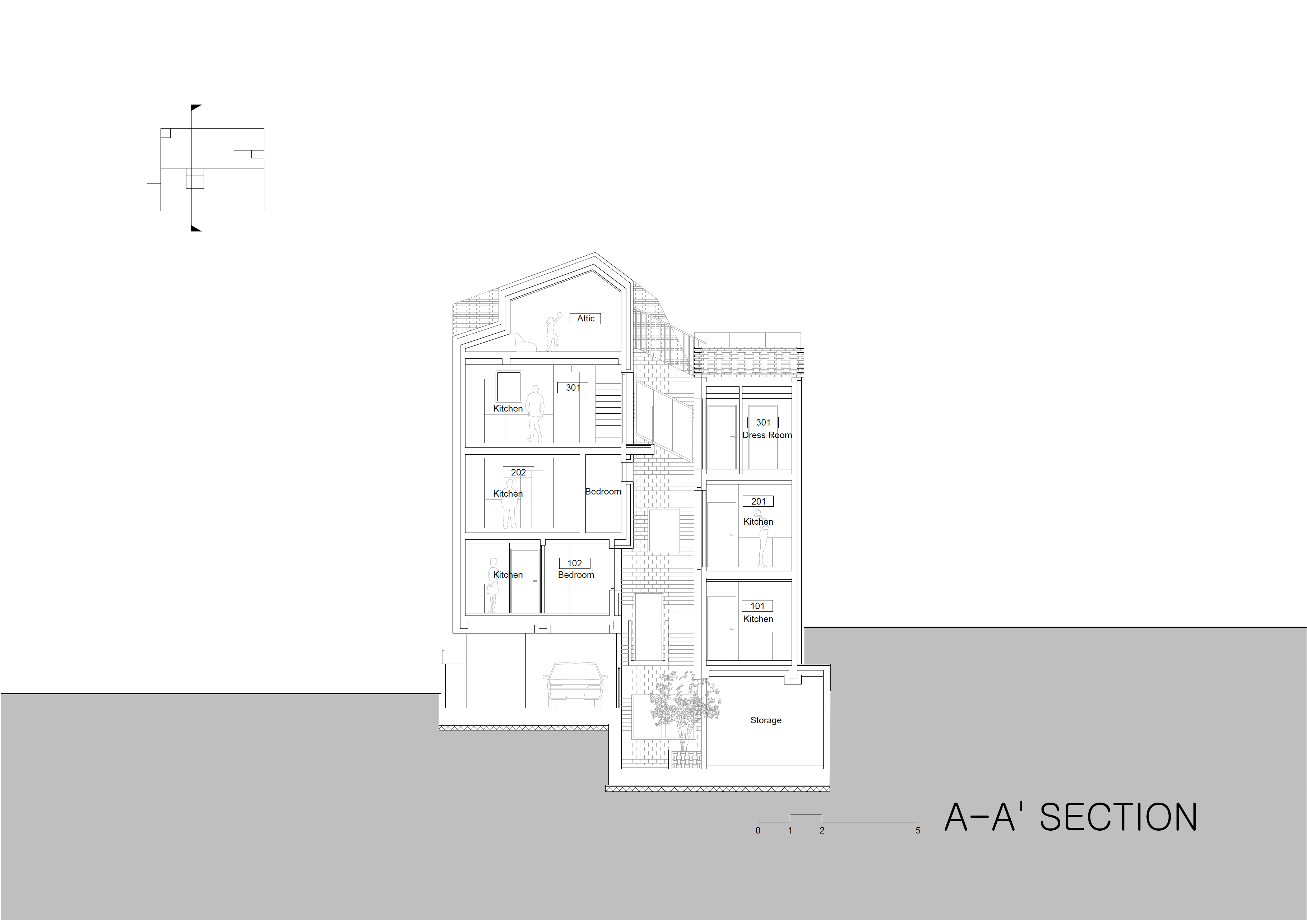 별내 다가구주택은 별내신도시 작은 공원 앞 경사지에 위치한다. 남북으로 약 1.2 미터 가량의 대지의 레벨차이를 활용해서 스킵 플로어의 구성으로 서쪽의 공원 뷰를 다섯 세대 모두 거실에서 즐길 수 있다. 공원 앞 건물로 들어가는 길은 산책로가 된다. 진입로는 선큰정원 위에 떠 있다. 진입로를 따라 들어가 현관 앞에 서면 하늘을 향한 중정이 있고, 각각의 집들이 마주한 창과 발코니가 있다. 이 작은 중정을 통해 남쪽의 빛을 끌어온다. 대지의 등고 차는 자연스럽게 스킵 플로어를 만들어 5세대의 입구들은 모두 다른 레벨에 놓이는데, 포켓공원으로 열린 뷰를 갖는 서쪽으로 주로 거실을 배치한다. 3층 주인세대의 현관으로 들어서면 안방과 작은 방을 동서로 배치하고 중정을 바라보며 계단을 오르면 주방과 거실을 연속적으로 놓아 서쪽의 뷰와 채광을 집 안쪽으로 끌어들인다. 소파의 위치에 약 1.5미터 높은 층고를 형성하며 천창을 두어 수직적인 공간 속에서 사계절의 변화를 느낄 수 있다. 옥상에서는 직접 길러 먹을 수 있는 작은 텃밭과 옥상 조경, 그리고 파고라를 배치해서 계절별로 야외활동을 할 수 있다.