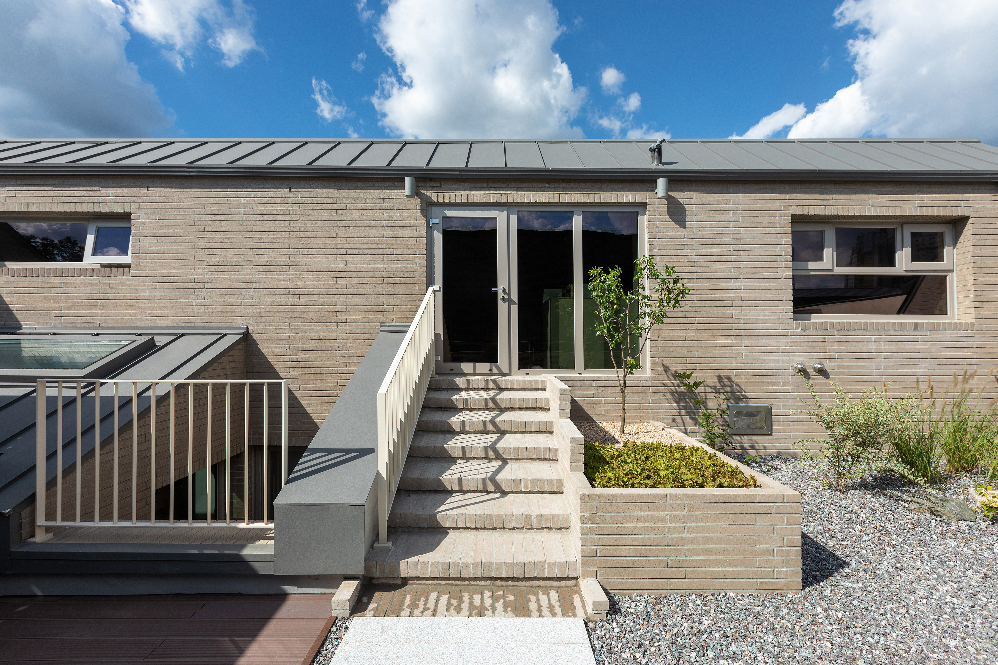 The access road is floating above the sunken garden, and while walking towards the door as if being sucked in, When you reach the front door, there is a courtyard facing the sky. Each house has windows and balconies facing each other through the courtyard. The light from the south is brought in through this small courtyard. The difference in elevation of the land naturally creates a skip floor, so the entrances of the 5th houses are all on different levels. Both living room and dining room are mainly arranged to the west with an open view to the pocket park. When entering the 3rd floor master's entrance hall, the master bedroom and a small room are arranged east to west, and when you go up the stairs facing the courtyard, the kitchen, dining and living room are placed in a row to bring in the west view and light into the house. A higher floor height is formed at the location of the sofa and a skylight is placed so that you can feel the change of seasons.