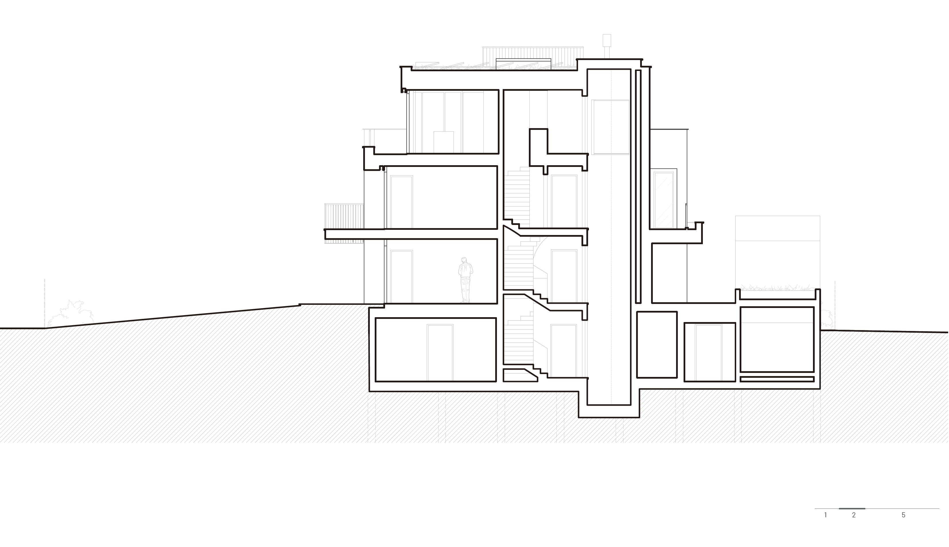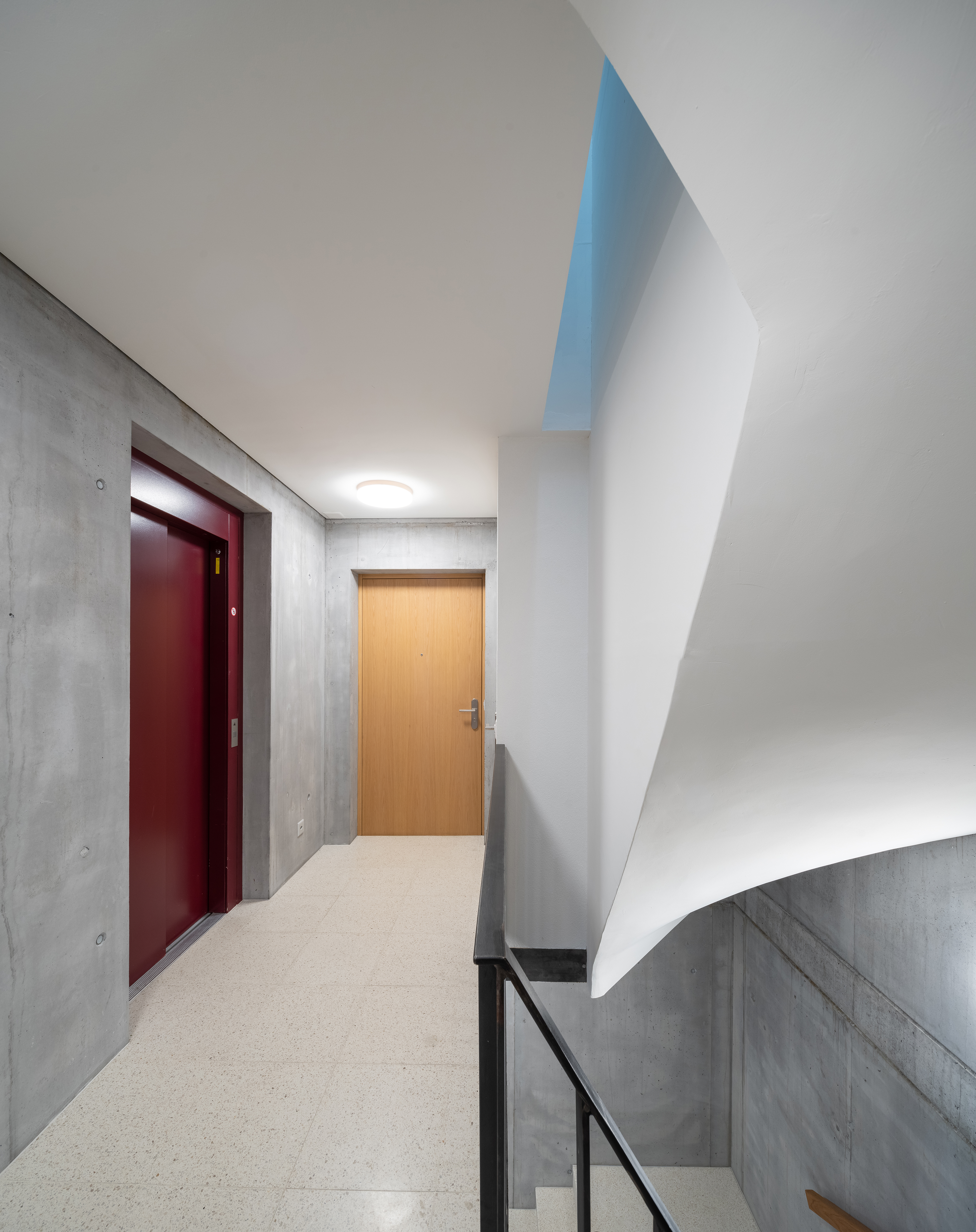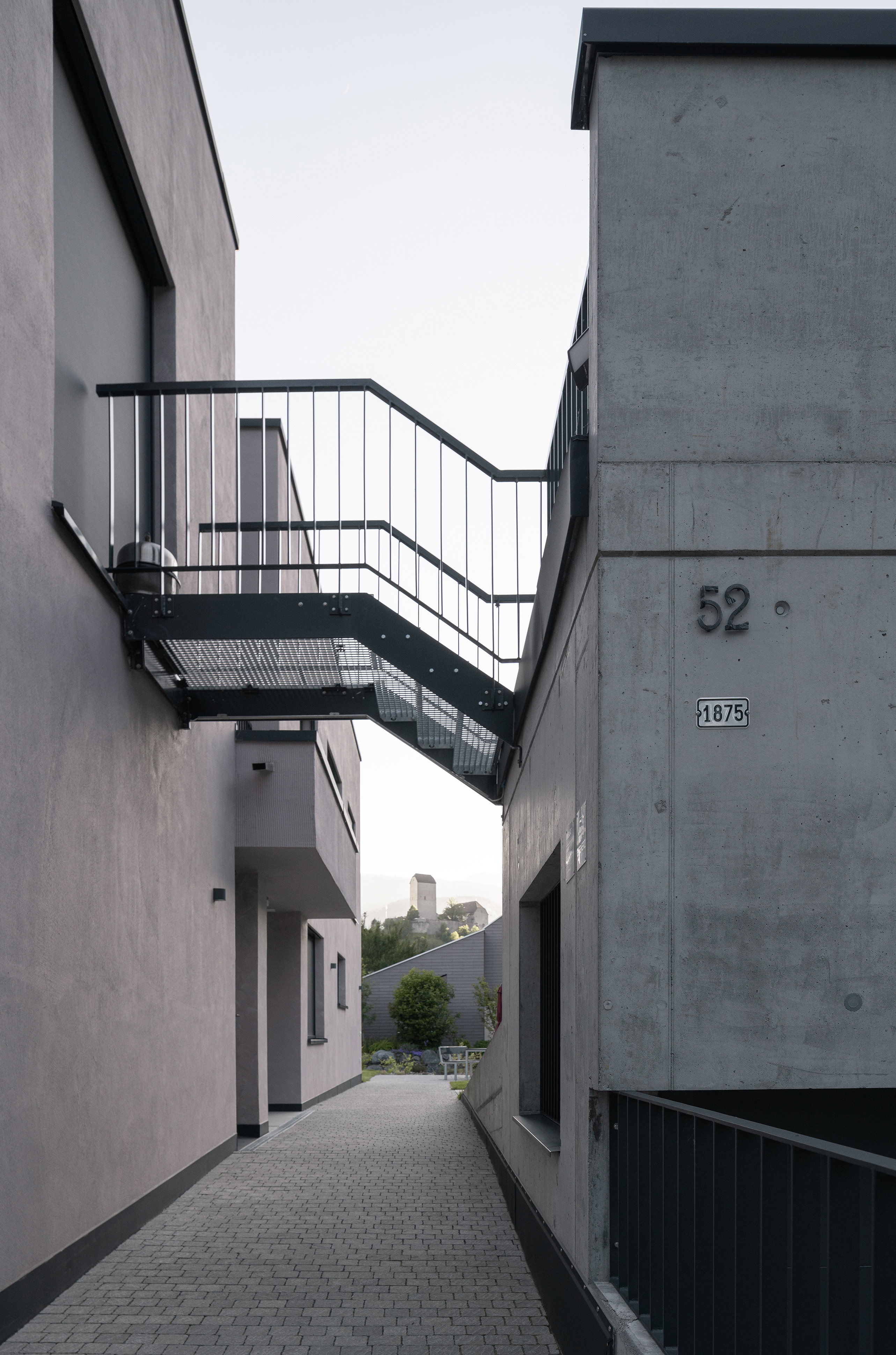 The surrounding mountains have become one of the main principles, which shaped the project and the design. Their peaks are important points at which the views from the rooms were oriented and thus forming the proportions and floor plans of the house. The pinkish Verrucano-Schiefer stone, which is found in the local mountains, has become a reference for the materialization of the facade and interior spaces. With regard to sustainability and ecology, a very compact envelope of the whole house was designed. The house is cut as a carved stone, different parts of the facades are defined by unique plaster surfaces and enjoy the play of light and shadow. The colour of the house changes during the day from light grey at dawn to pink at sunset. The other concept of the house was its housing specifics - rental apartment housing. The materials used in the project had to be of high quality, durable and neutral in order to meet the expectations of a different spectrum of potential tenants.