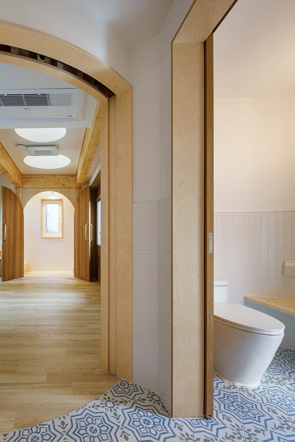 On the longest side of the triangular-shaped plane, a staircase leading from the entrance to the third floor was placed. The first floor is a space where they can interact with local residents and is connected from the window of the parking lot to the small deck space on the south side. The second floor, which is the first space you encounter when you go up the stairs, is centered on the ‘study room’, with a room for the son and daughter arranged on the left and right, and the bathroom space placed between them. The round door and space in the children’s space were borrowed from the image of the house in Germany where the client stayed.