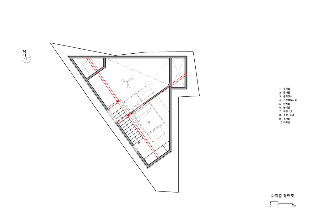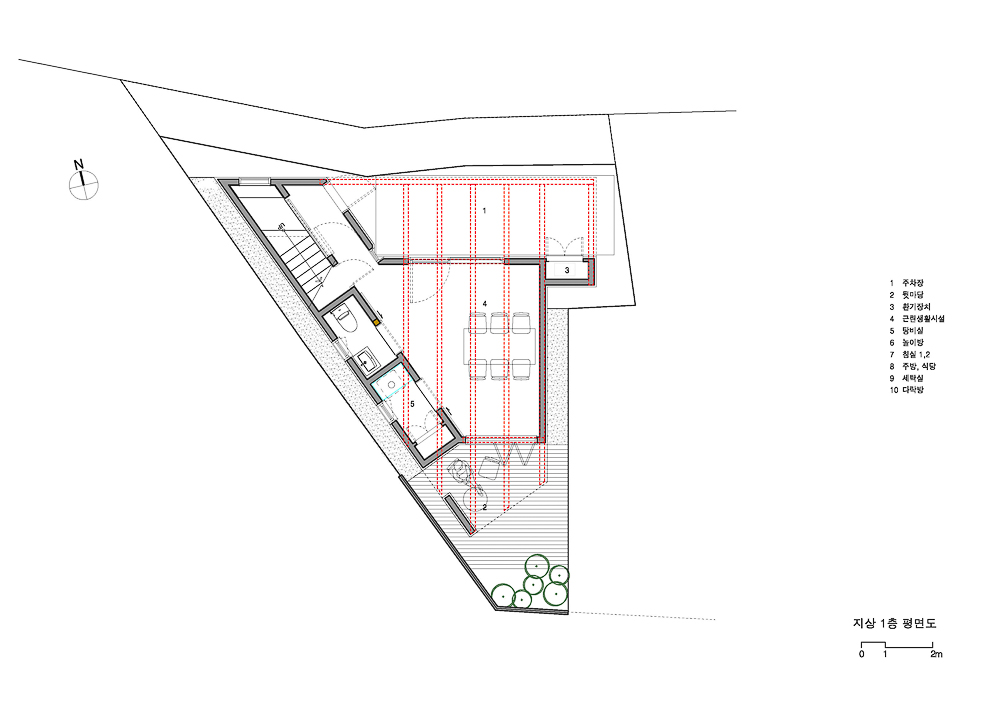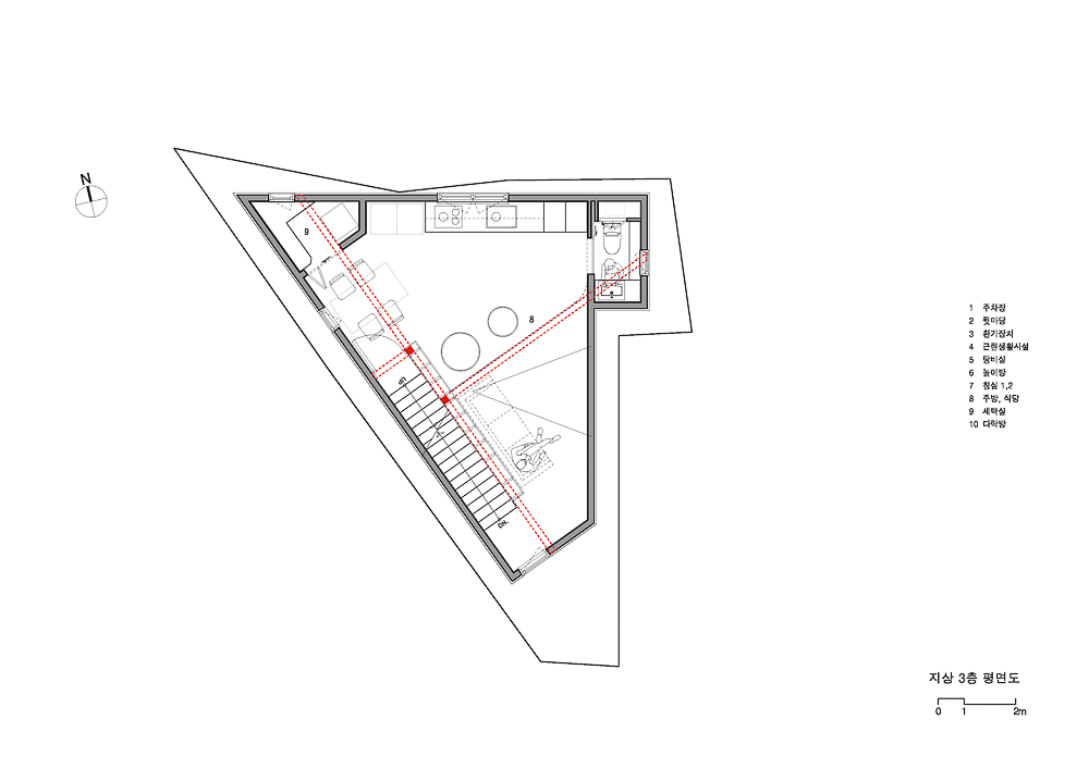 삼각형 모양의 평면에서 가장 긴 변에는 현관으로부터 3층까지 연결된 계단을 배치됐다. 1층은 지역주민과 교류할 수 있는 공간으로 주차장의 통창으로부터 남쪽의 작은 데크 공간까지 연결된다. 계단을 한 층 올라와 처음 만나는 2층은 ‘공부방’을 중심으로 아들과 딸을 위한 각각의 방을 좌우로 배치하고 욕실 공간을 그 사이에 배치했다. 2층 아이들 공간에서 보이는 둥근 형태의 문과 공간은 건축주가 머물던 독일 주택의 이미지에서 차용했다.