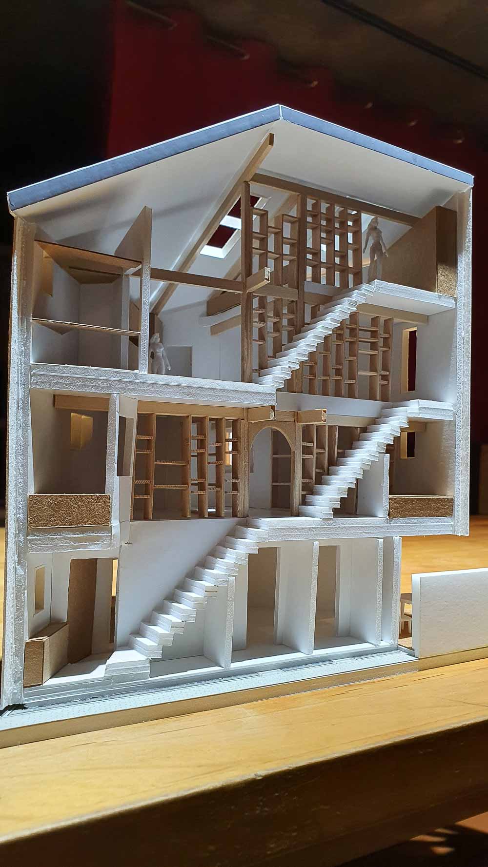 도심 협소 주택의 특징인 주변 건물과 밀착된 배치 때문에 불편해진 큰 창 대신 기능적인 작은 창들을 적절히 배치하여 주변 집들과의 간섭이 거의 없는 상태를 만들었다. 창이 작은 어두운 1층의 현관을 지나 주택에 들어서면 중문에서 3층까지 연결되는 기다란 계단과 계단을 따라 이어지는 ‘가족서가家族書架’가 가장 먼저 보인다. ‘가족서가家族書架’는 책을 위한 역할 뿐 아니라 책상, 옷장, 장식장 등 여러 용도로 쓰이는데 계단과 각각의 공간을 분리해주는 역할도 하고 있다. 계단을 따라 위층으로 이동하면서 층마다 바뀌고 확장되는 공간의 변화를 감상할 수 있다.