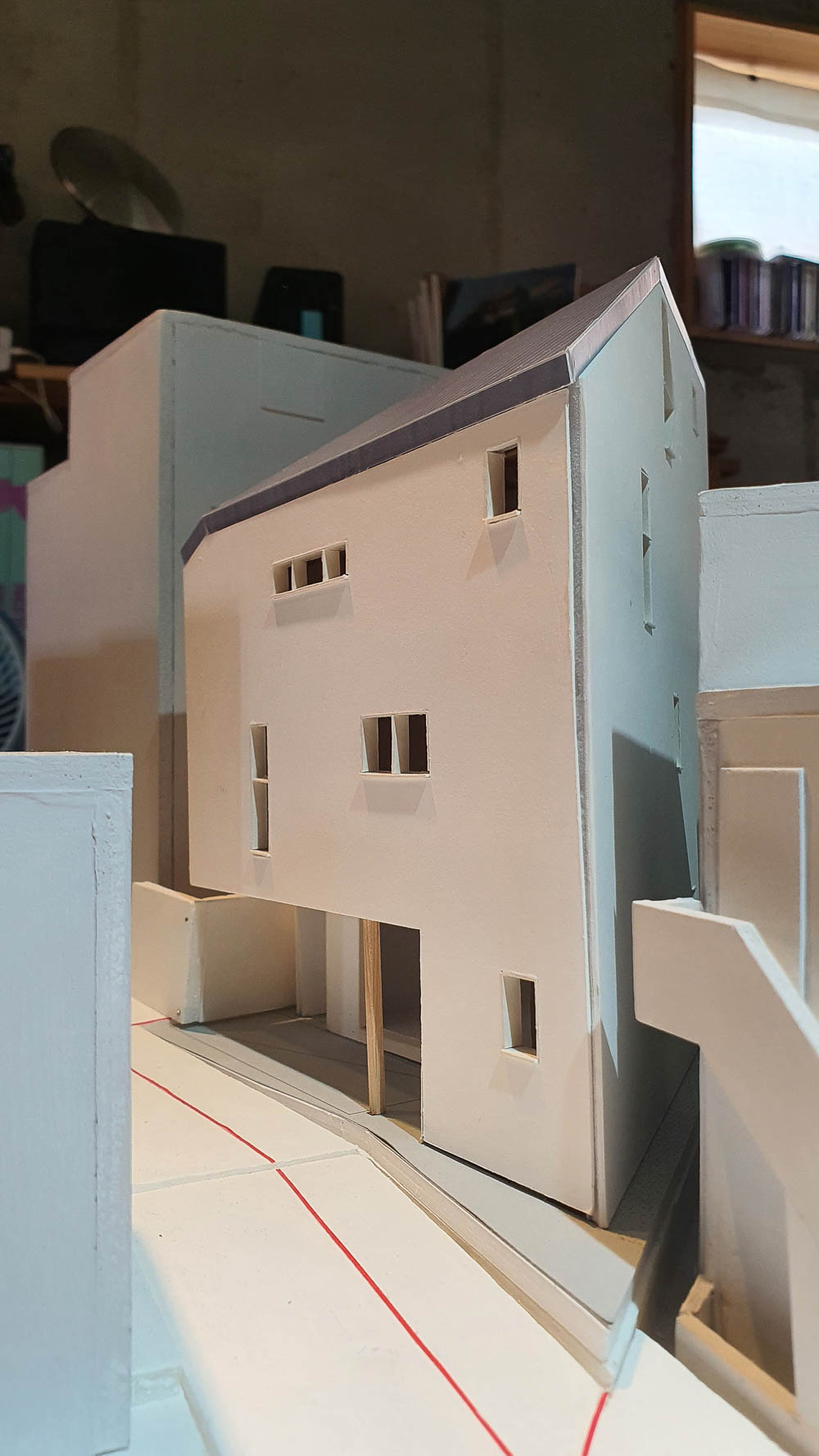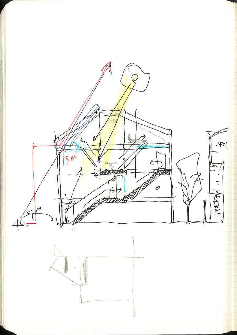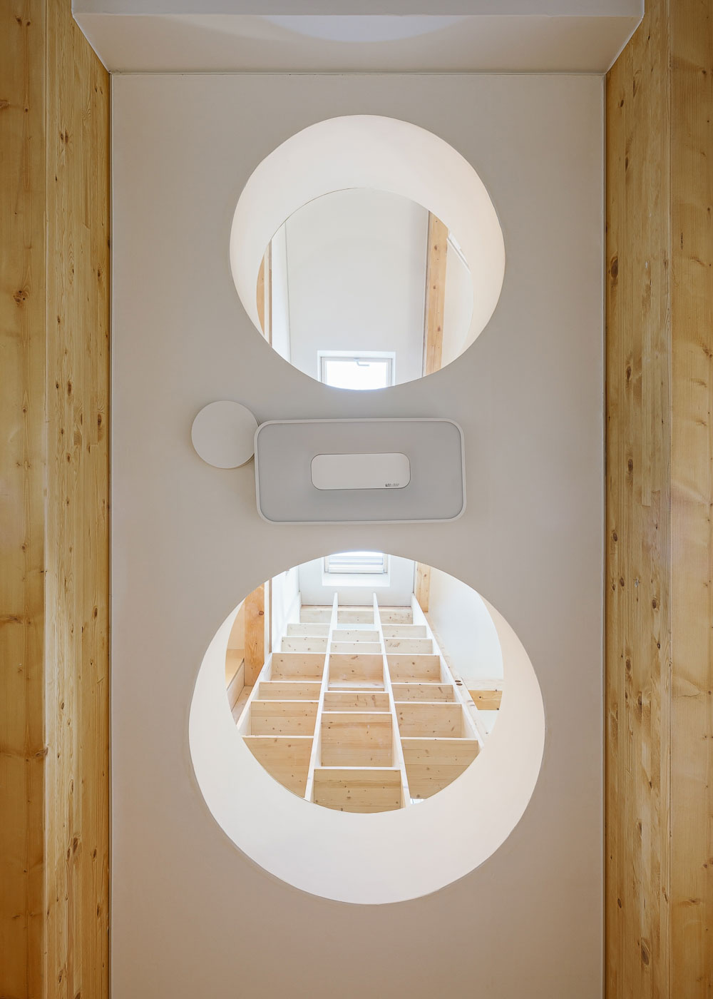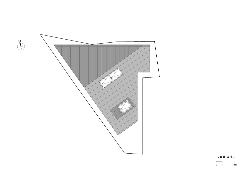 삼각형 모양의 평면에서 가장 긴 변에는 현관으로부터 3층까지 연결된 계단을 배치됐다. 1층은 지역주민과 교류할 수 있는 공간으로 주차장의 통창으로부터 남쪽의 작은 데크 공간까지 연결된다. 계단을 한 층 올라와 처음 만나는 2층은 ‘공부방’을 중심으로 아들과 딸을 위한 각각의 방을 좌우로 배치하고 욕실 공간을 그 사이에 배치했다. 2층 아이들 공간에서 보이는 둥근 형태의 문과 공간은 건축주가 머물던 독일 주택의 이미지에서 차용했다.