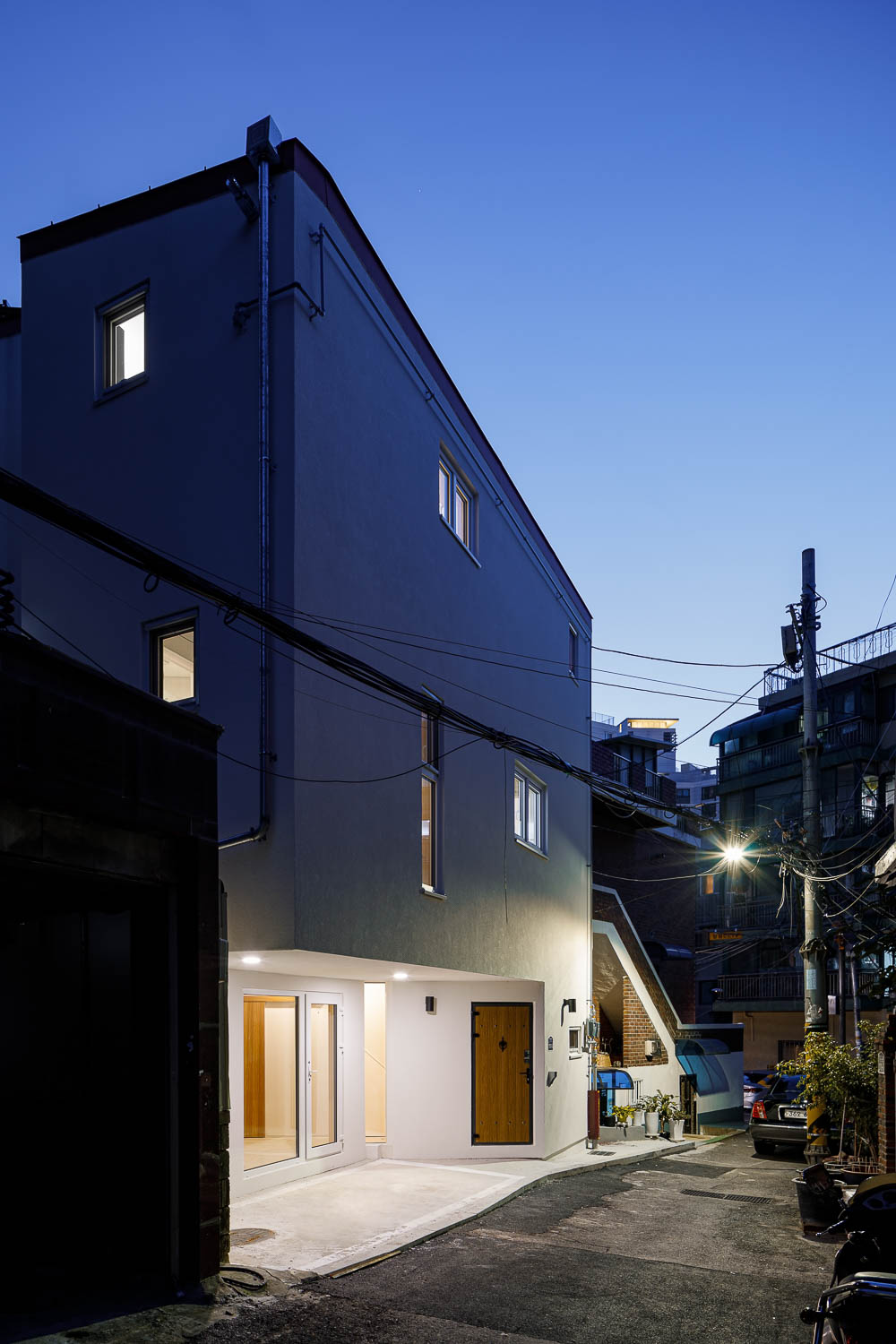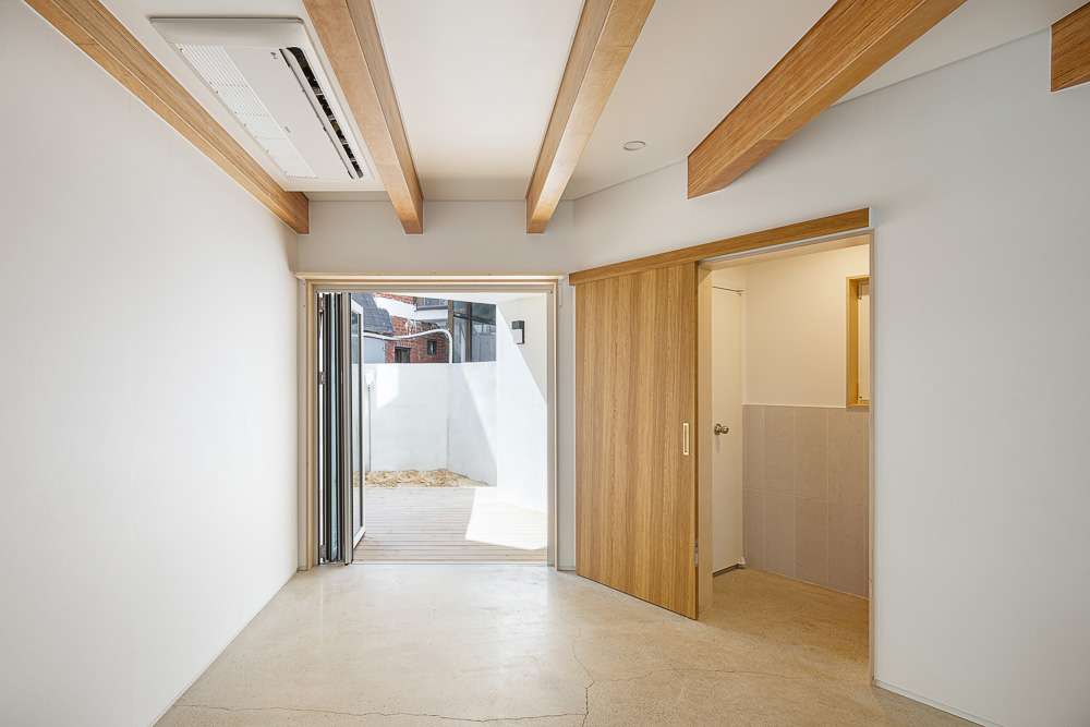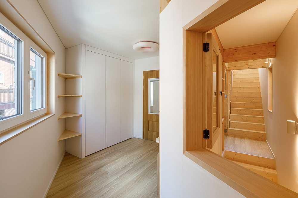 Kelk house is built with a wooden structure. Built on a narrow triangular-shaped site in Jung-gu, Seoul, the house is surrounded by houses on all sides, with no place to look, like any other small house. In the center of a city, connected with narrow alleyways, construction speed is critical. The construction period was shortened by using a factory-produced heavy timber structure for the entire structure, and with wood structure it’s possible to make the walls thin, which is also effective for space utilization. In order to secure one parking space necessary in a house construction, the end of the building is treated with a column-less cantilever, which creates a distinct feature of economical spatial use. In a wooden structure, this cantilever structure causes sagging and the building becomes prone to deformation in the long term. To prevent this, the structure was reinforced using engineered wood with structural calculations.