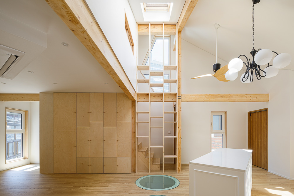 Continue up the stairs and you are on the third floor, where there is a living room and kitchen for the whole family. This is the largest and highest space of ‘Kelk House’, and you can feel the abundance of light and openness through two skylights and pentagonal windows. The light falling from the skylight is extended to the study room on the second floor through the circular floor window. Up the stairs from the kitchen is the attic area. A protruding skylight was designed to overcome the low floor height. This space is used as the couple’s bedroom.