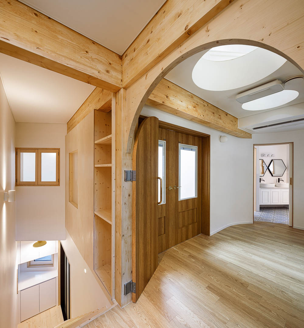 On the longest side of the triangular-shaped plane, a staircase leading from the entrance to the third floor was placed. The first floor is a space where they can interact with local residents and is connected from the window of the parking lot to the small deck space on the south side. The second floor, which is the first space you encounter when you go up the stairs, is centered on the ‘study room’, with a room for the son and daughter arranged on the left and right, and the bathroom space placed between them. The round door and space in the children’s space were borrowed from the image of the house in Germany where the client stayed.