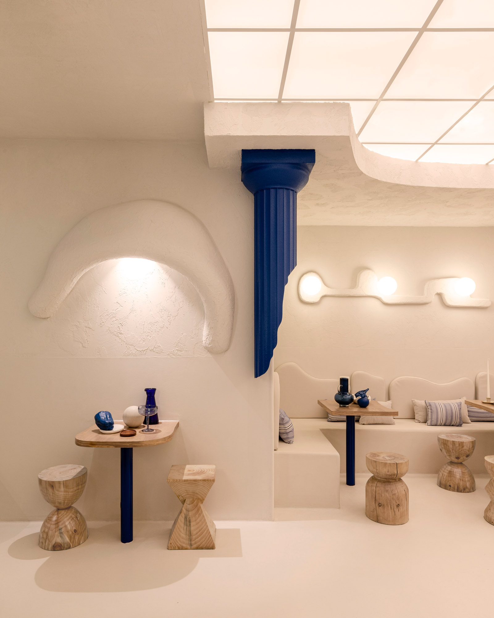 고대 그리스 주택에 전형적인 시멘트 재료의 아름다움을 적용했다. 아나 밀레나 에르난데스 : "우리는 보통의 흰색과 파란색 팔레트를 사용하는 것보다 더 멀리, 우주에서 그리스를 구체화하려고 노력했습니다." 위의 벽들은 공간으로부터 가장 두드러진 특징들 중 하나로 유기적인 형태를 가진 볼륨들을 통합하고, 그리스 건축의 본질을 나타내기 위한 탐색을 계속했다. 이 디자인에서 가장 눈에 띄는 요소는 열화된 상태의 그리스 기둥들이 여기 파란색으로 칠해져 있지만 말이다. 아나 밀레나 에르난데스: 우리가 기둥을 소개하면서 자문했던 것은 전 세계 그리스 식당에서 그의 고전적 상태로 대표되는 그리스 건축의 전통적인 요소를 어떻게 현대화할 것인가 하는 것이었습니다." 현대판 기둥을 재현하기 위해 파란색이 사용되었지만 3D 프린터로 제작되었고, 동시에 유도된 튜브가 구조물에 추가되었다. 생산기술에 이어 일반 색상에 도전해 21세기 기술로 제작된 현대적 요소가 됐다. 마지막으로, 주문 바는 마치 그리스 시장 한복판에 있는 모바일 키오스크에서 수블라키를 주문하는 것처럼 번화한 환경을 재현할 목적으로 공간 한 가운데에 자리 잡았다.