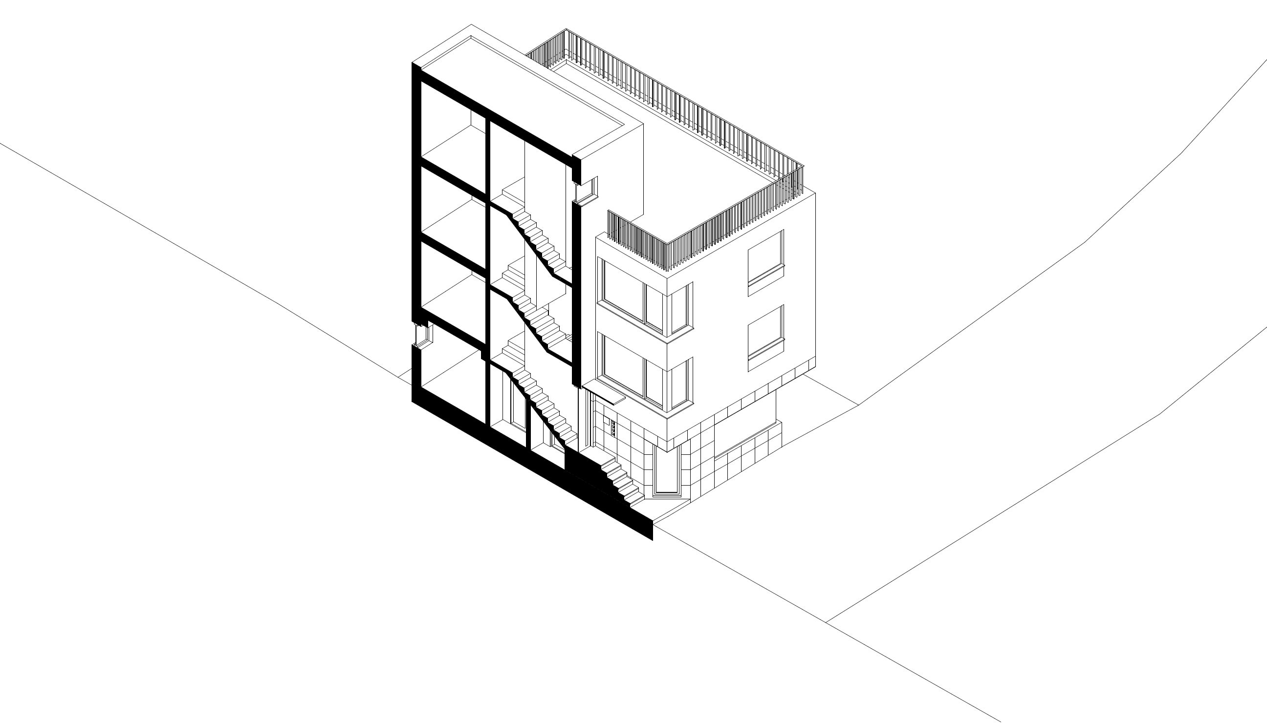 1층은 상업용도에 적합하게 도로에 면하게 배치하고 밝은 타일로 마감하여 인지성을 높이고 골목을 환하게 밝혀줄 수 있게 했다. 좁은 전면도로에서 자칫 혼잡할 수 있는 방문자의 동선을 고려하여, 1층의 출입구는 건물 코너 부분에 사선을 만들어 넣었다. 밝은 흰색 타일 마감으로 반석처럼 단단하게 자리 잡은 1층 위에는 골목을 구성하는 벽돌건물들과 어우러지는 부드러운 붉은색 집을 올려놓았다. 평생을 단독주택에서 살아온 건축주 어머니를 위해 주택의 주출입구는 외부계단으로 분리해 도로에서 약간의 전이공간을 거쳐 들어가는 동선을 구성했다. 주출입문 통해 들어선 내부에는 계단을 따라 2층과 3층에 두 가구가 위치한다. 두 개 층으로 구성된 3층 세대의 내부계단을 통해 옥상 테라스로 나갈 수 있다. 옥상에서는 조금씩 개발되고 있는 동네의 낮은 지붕선들을 같은 눈높이에서 바라볼 수 있다.