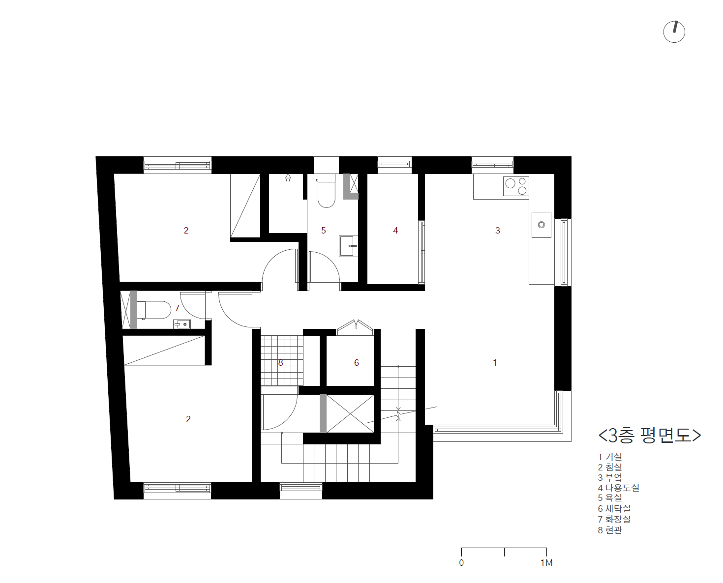 The first floor was placed facing the road suitable for commercial use and finished with bright tiles to increase awareness and brighten the alley. In consideration of the traffic flow of visitors, which may be congested on the narrow front road, the entrance on the first floor has a diagonal line at the corner of the building. On the first floor, which is solidly positioned like a rock with a bright white tile finish, a soft red house is placed that harmonizes with the brick buildings that make up the alley. For the mother of the owner, who has lived in a detached house all her life, the main entrance of the house is separated by an external staircase to form a movement line that goes through a small transition space from the road. Entering through the main entrance, two households are located on the 2nd and 3rd floors along the stairs. You can go out to the roof terrace through the internal stairs of the third-floor household, which consists of two floors. From the rooftop, you can see the low rooflines of the neighborhood, which are being developed little by little, from the same eye level.