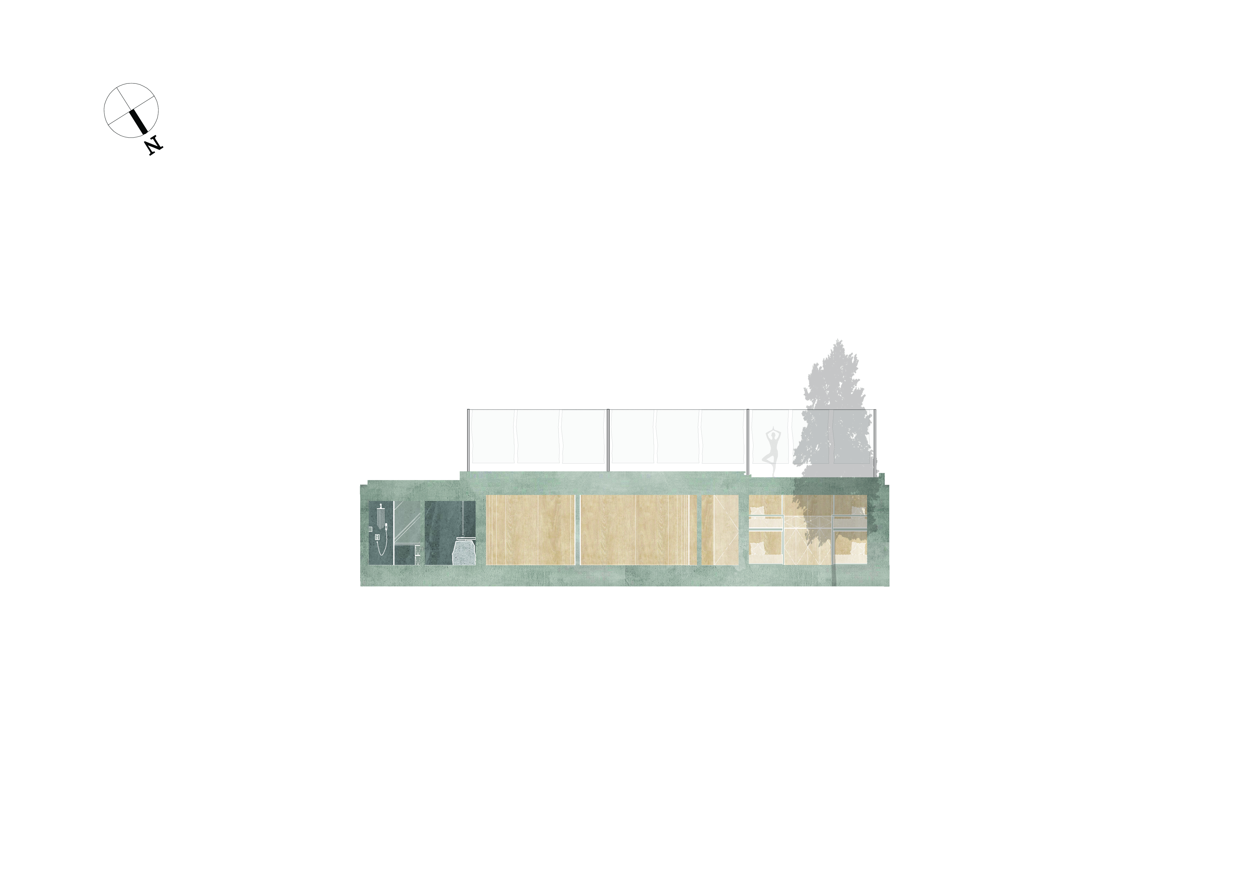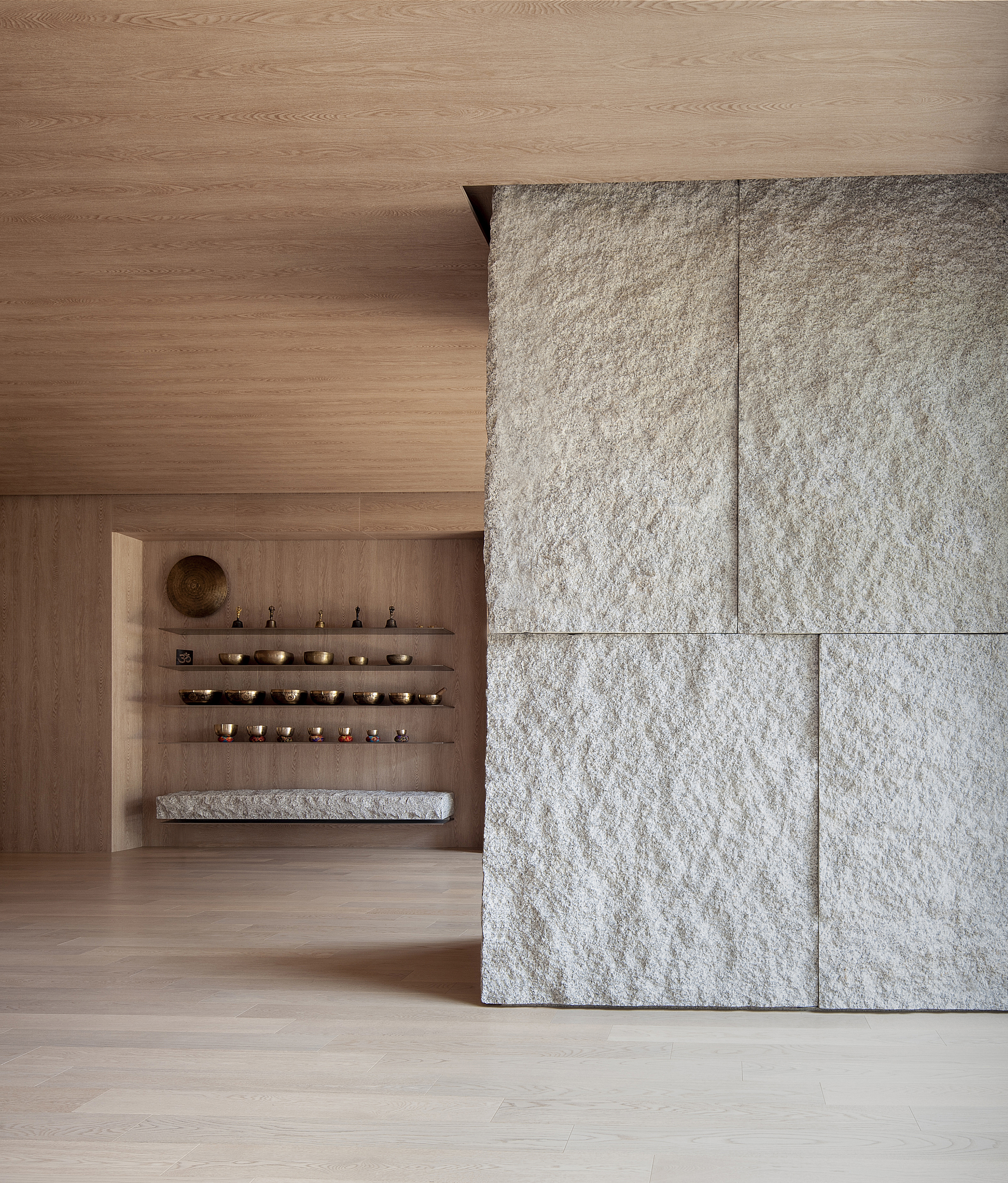 육체적 단계의 공간은 감각을 조절(Asana, Pranayama, Pratayahara)하는 단계를 의미한다. 이 공간은 자아의 결합과 교감에 집중할 수 있도록 차분히 가다듬은 木의 물성을 반영하고, 구심적인 역할을 부여하기 위해 石으로 그 에너지를 발현했다. 부드러운 요소와 묵직한 물체, 그리고 자연이 상호작용하는 경계의 유연함은 신체의 유연해짐과 감정의 열림을 경험할 수 있도록 돕는다.