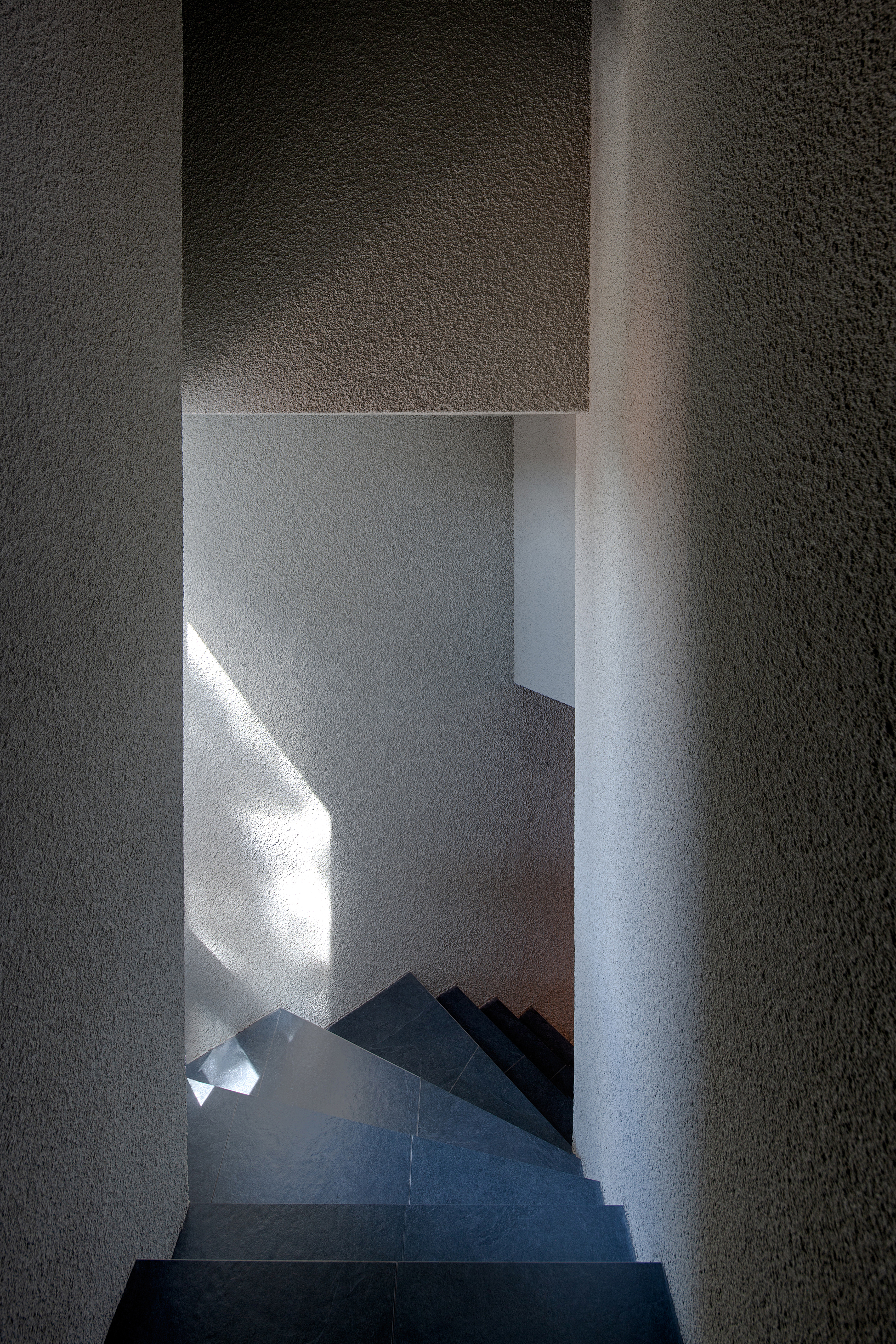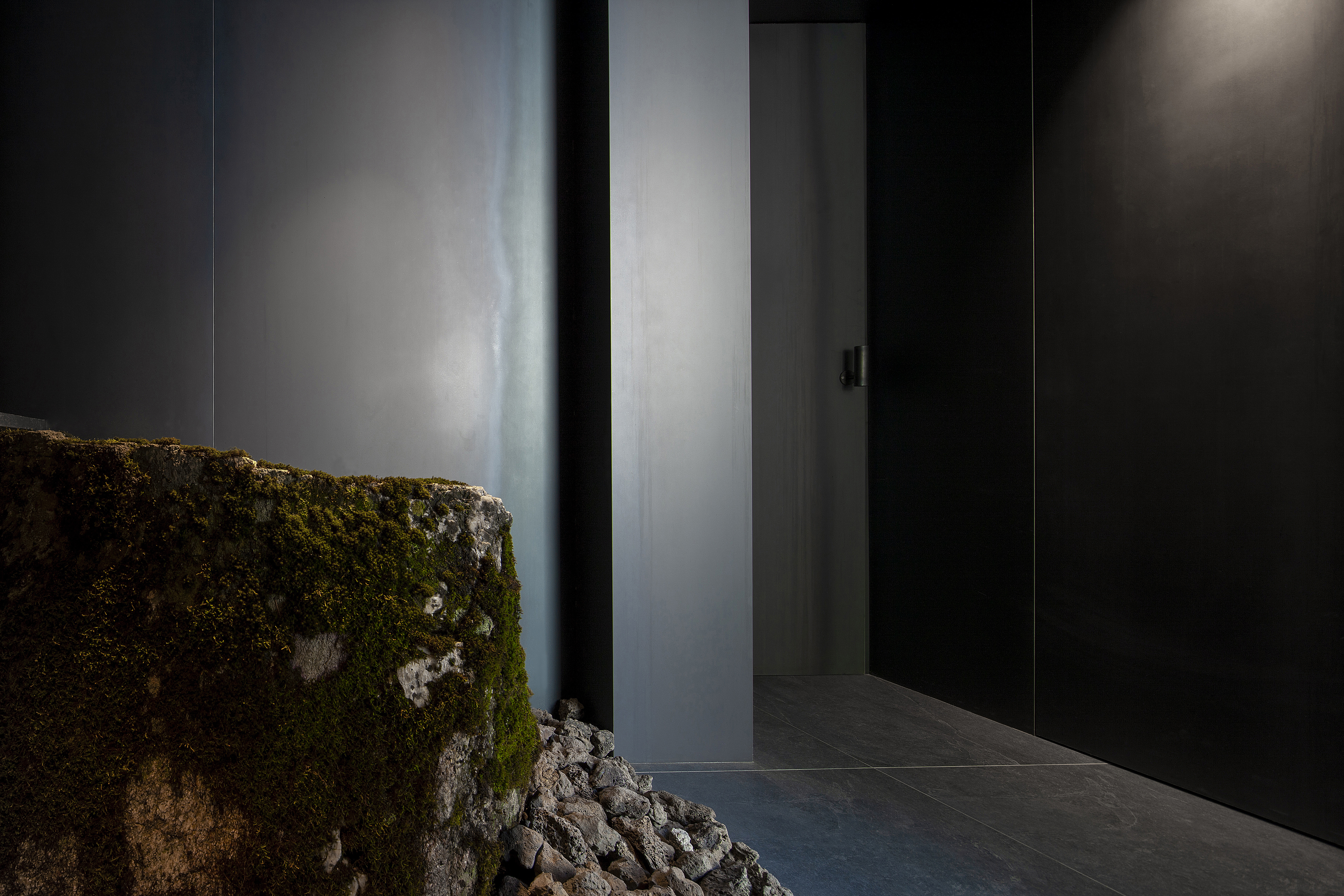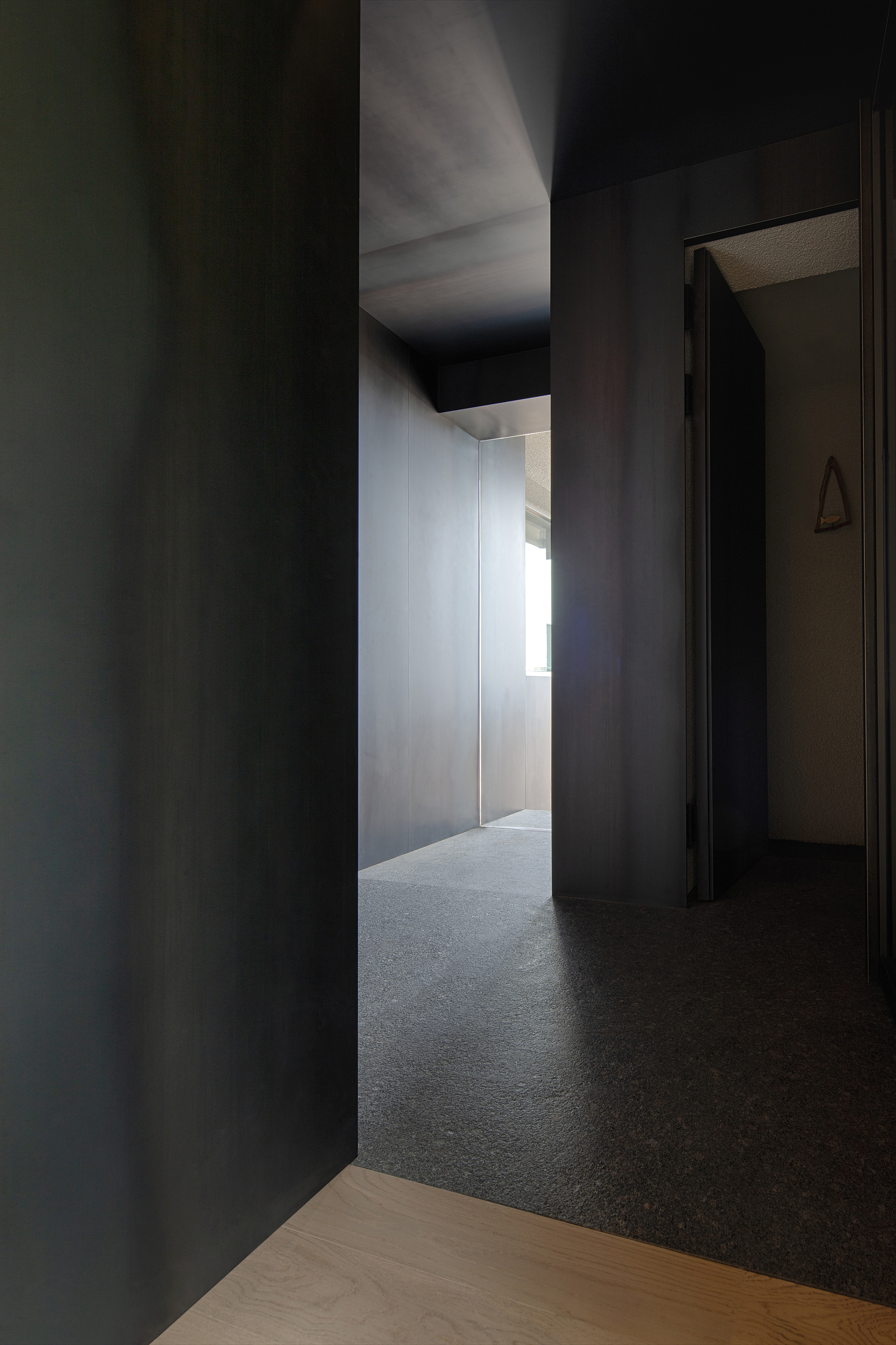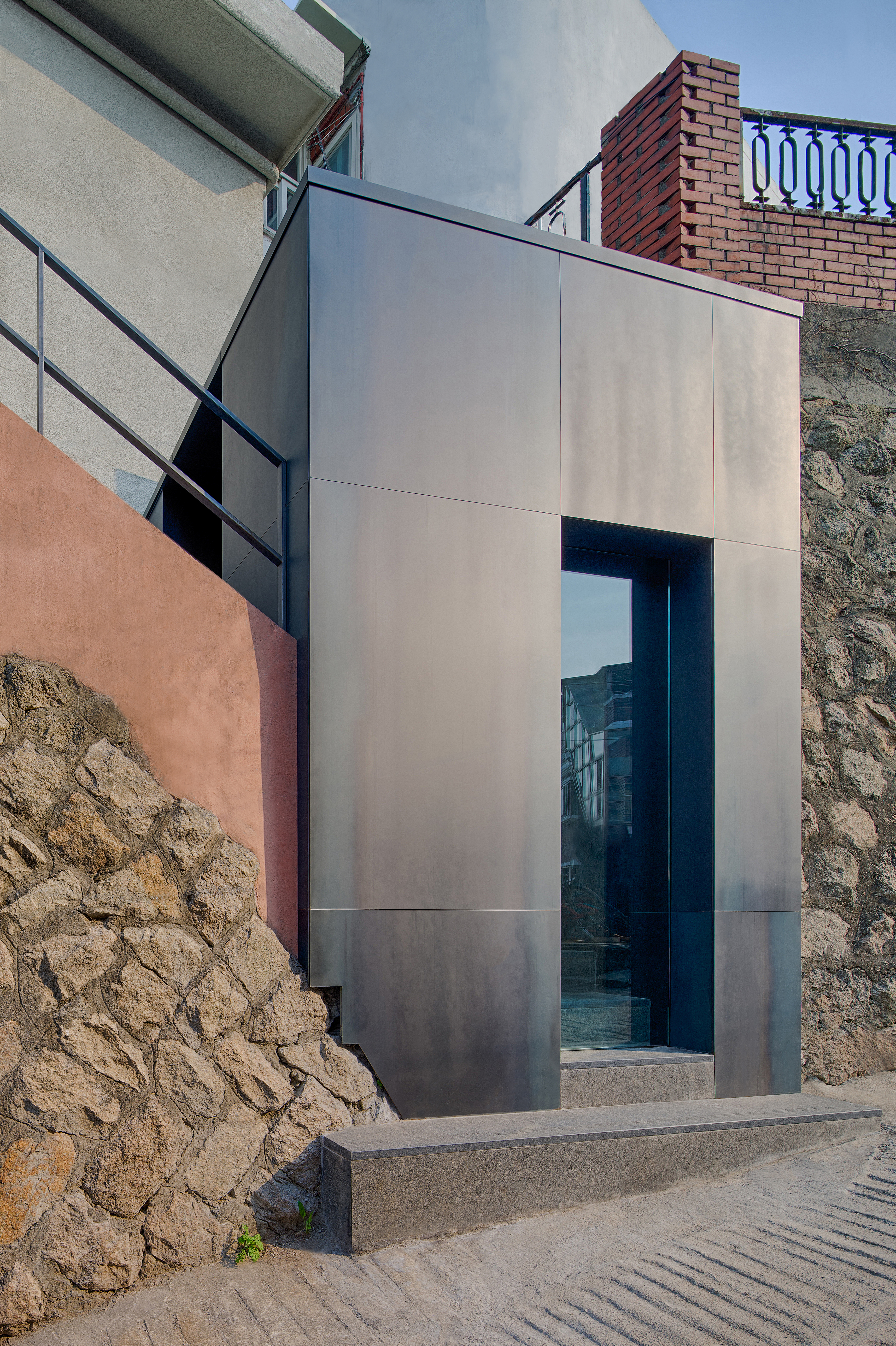 윤리적 단계는 이 장소로 향하는 고단한 발걸음, 골목의 끝자락에서 공간을 목격하고 진입하는 정화(Yama, Nyama)의 단계를 의미한다. 가파른 경사와 무질서한 건물들 사이에서 목격되는 곧은 형태의 금속덩어리는 ‘I’자 벽체와 함께 긴 동선을 이끈다. 이 금속덩어리는 외부에서 내부로 연결되며, 발걸음에 따라 도시의 풍경을 지워나가고 빛과 그림자의 윤곽의 깊이로 고요하게 공간으로 진입하도록 유도한다. 이는 실내공간의 초입까지 이어지는데 내부와 외부를 동질화함으로써 그 경계를 지워 서로 투과되고 반영됨에 의미가 있다.