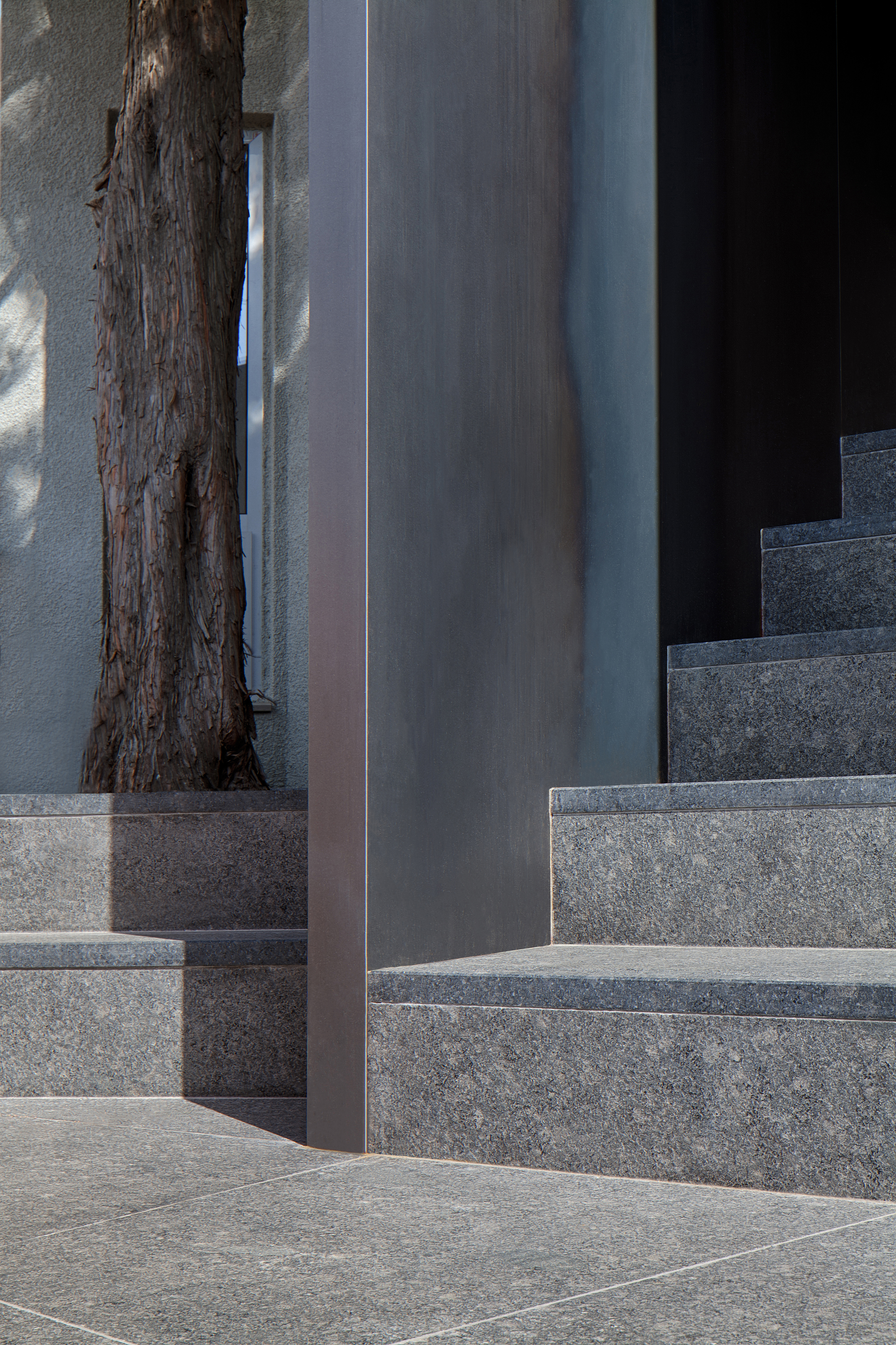 윤리적 단계는 이 장소로 향하는 고단한 발걸음, 골목의 끝자락에서 공간을 목격하고 진입하는 정화(Yama, Nyama)의 단계를 의미한다. 가파른 경사와 무질서한 건물들 사이에서 목격되는 곧은 형태의 금속덩어리는 ‘I’자 벽체와 함께 긴 동선을 이끈다. 이 금속덩어리는 외부에서 내부로 연결되며, 발걸음에 따라 도시의 풍경을 지워나가고 빛과 그림자의 윤곽의 깊이로 고요하게 공간으로 진입하도록 유도한다. 이는 실내공간의 초입까지 이어지는데 내부와 외부를 동질화함으로써 그 경계를 지워 서로 투과되고 반영됨에 의미가 있다.