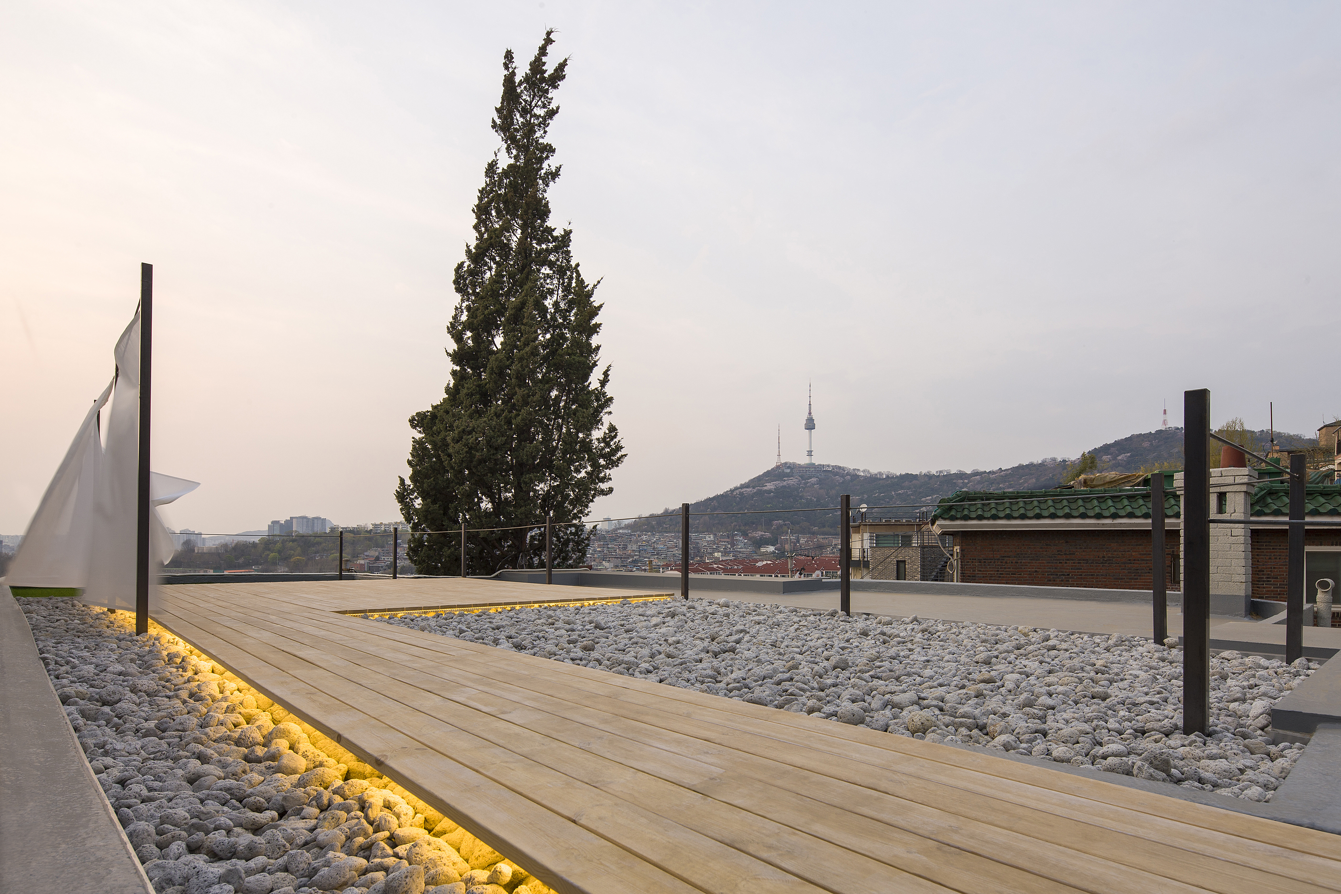 The ethical stage refers to the difficult step toward this place, the stage of purification (Yama, Nyama) that witnesses and enters the space at the end of the alley. A straight block of metal seen between steep slopes and disordered buildings leads to a long line of movement with an 'I' shaped wall. The metal blocks are connected from the outside to the inside, erasing the city's landscape with steps and inducing it to enter the space quietly with the depth of the outline of light and shadow. This leads to the entrance of the indoor space, and by homogenizing the inside and the outside, it is meaningful to erase the boundary and penetrate and reflect each other.