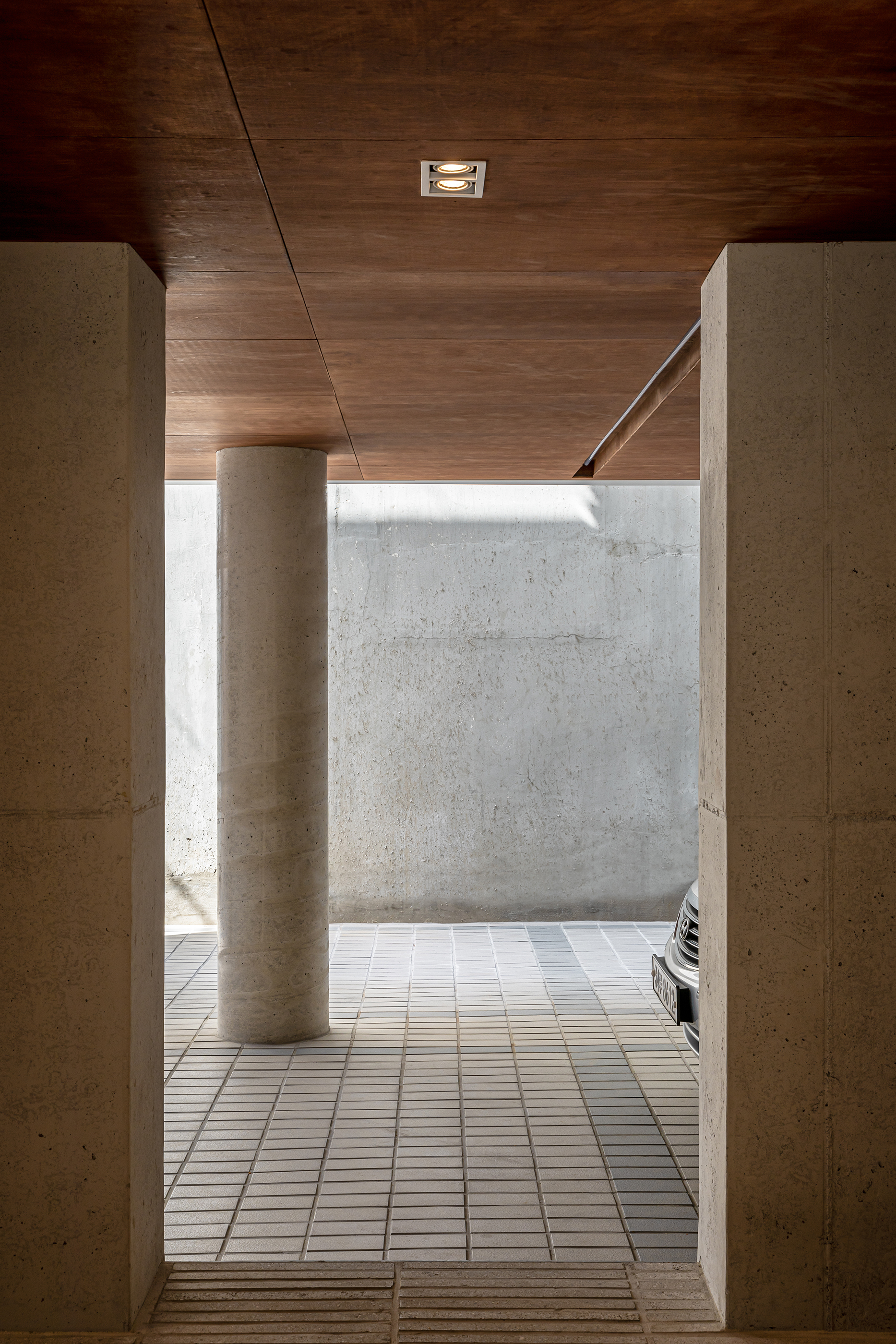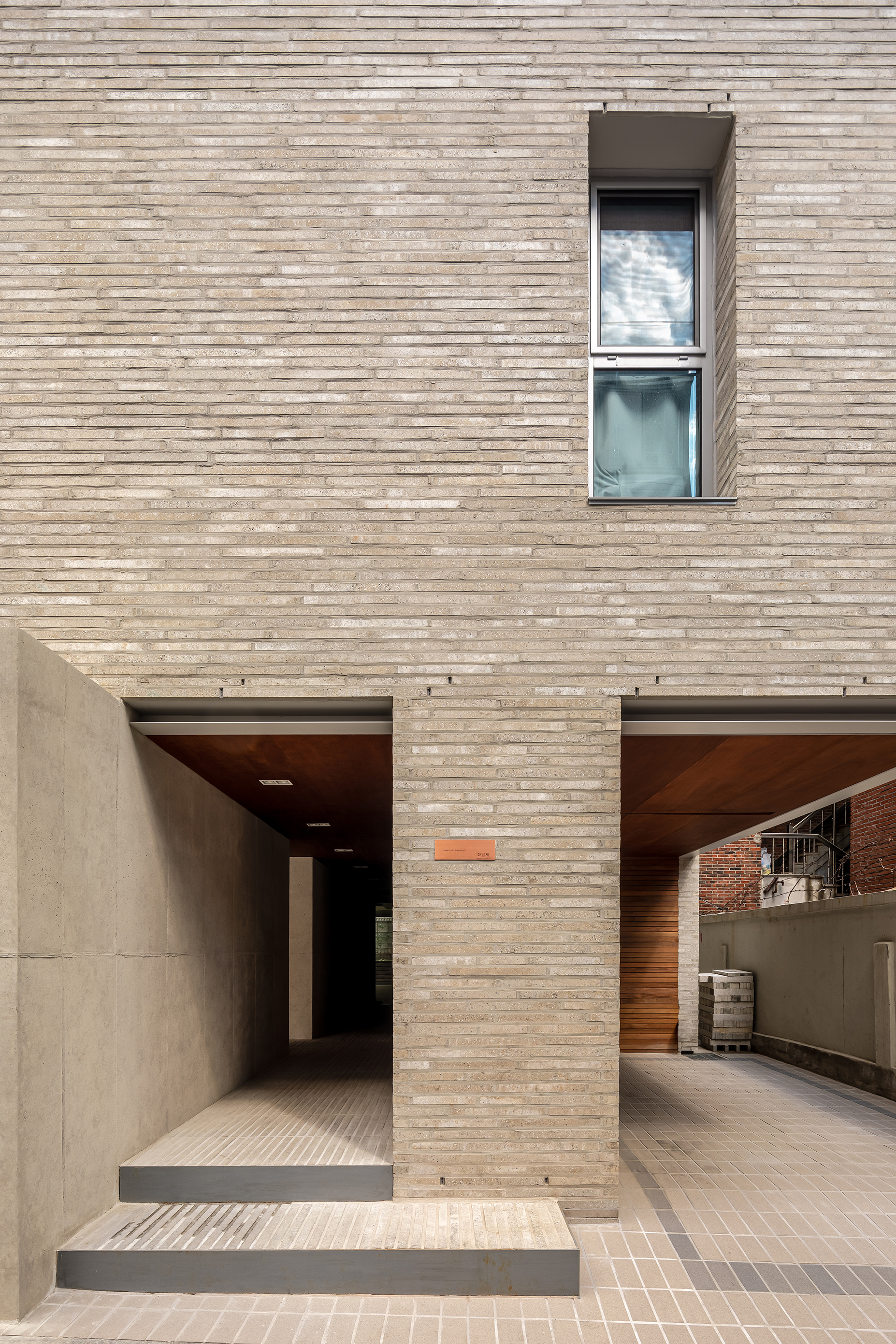 외부의 마감재 선택은 상기에서도 언급했듯이 대지 주변의 혼돈에 기인하며, 그 구축방식이나 색상의 선택에 있어 오랜 시간이 걸리지 않았다. 여러 요소가 다양한 형태와 색상으로 자리 잡고 있는 동네의 풍경 가운데 배경으로 건축이 되기를 바랬으며, 이에 정리된 수직, 수평의 볼륨과 무채색의 마감재를 전체를 구성했다. 형상은 조금씩 다르지만, 그 물성이나 색감이 유사한 노출 콘크리트, 콘크리트 벽돌, 홈벽돌을 적용하여 단조로우면서 지루하지 않은 표정을 갖도록 했다.