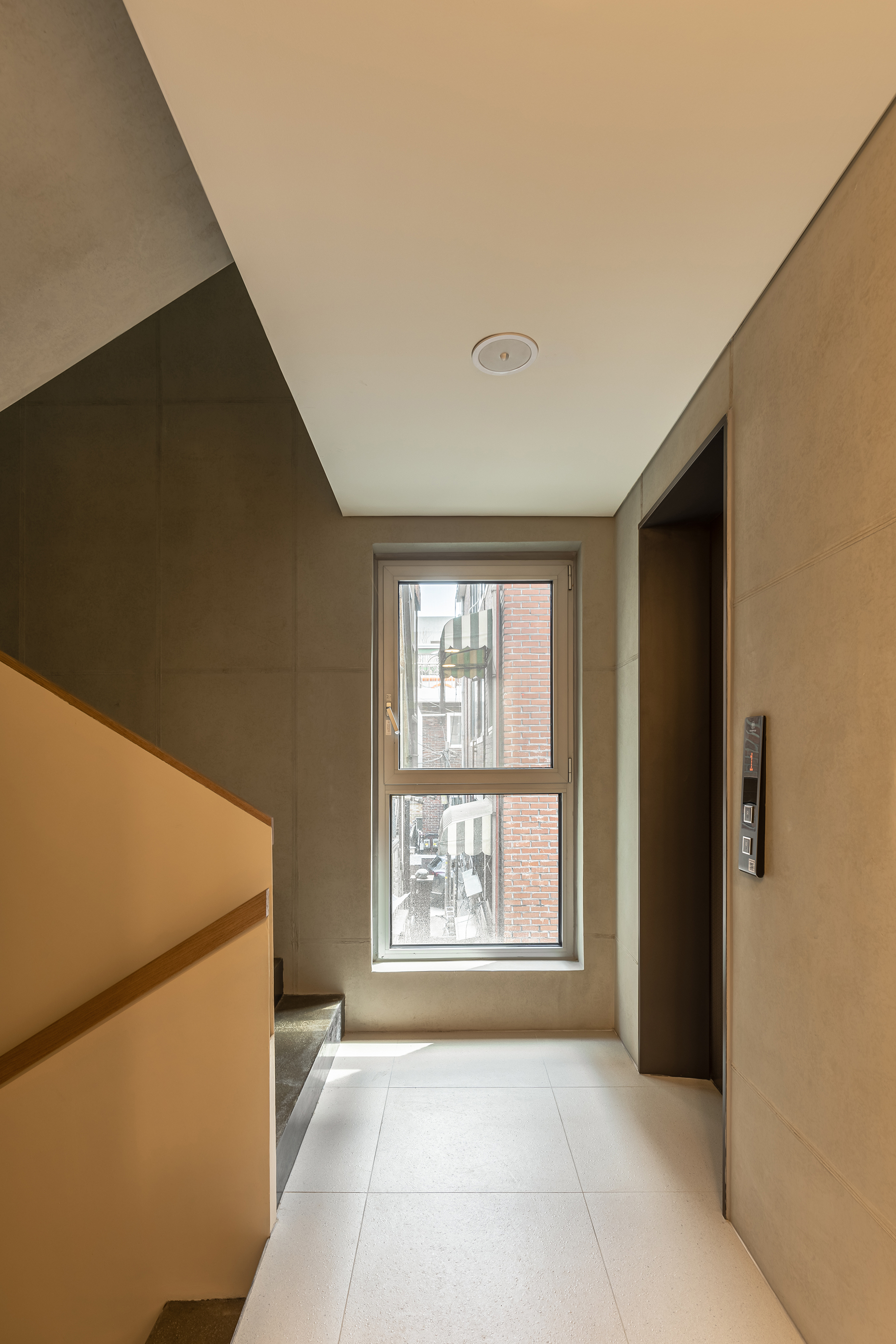 Hwadamjae locates at an alley of old market in Myeonmok-dong. The day when we first visited the site, people were bustling in the market street and was full of energy, the smell of many foods stimulated nose. Also, various colors of signboards were filling the street as various stores are standing along both side of the street. I came to think that it would be awkward to build a new multi-family house right next to the market road and that it would not go well with the local atmosphere. However, we’ve proceeded the plan by organizing experiences of site visit and deciding some directions. It was hoped that it would become a more neat and solid-faced building in the bustling old market roads, various floating populations, unorganized street landscapes and residential environments. In the process of setting the volume of the building and selecting the materials, these standards were maintained, and the constructed results tried to face the distance with a more neutral expression.
