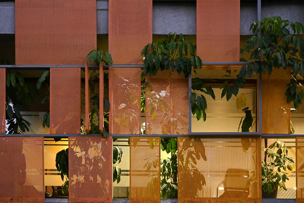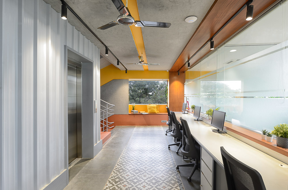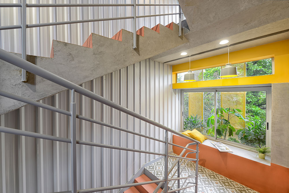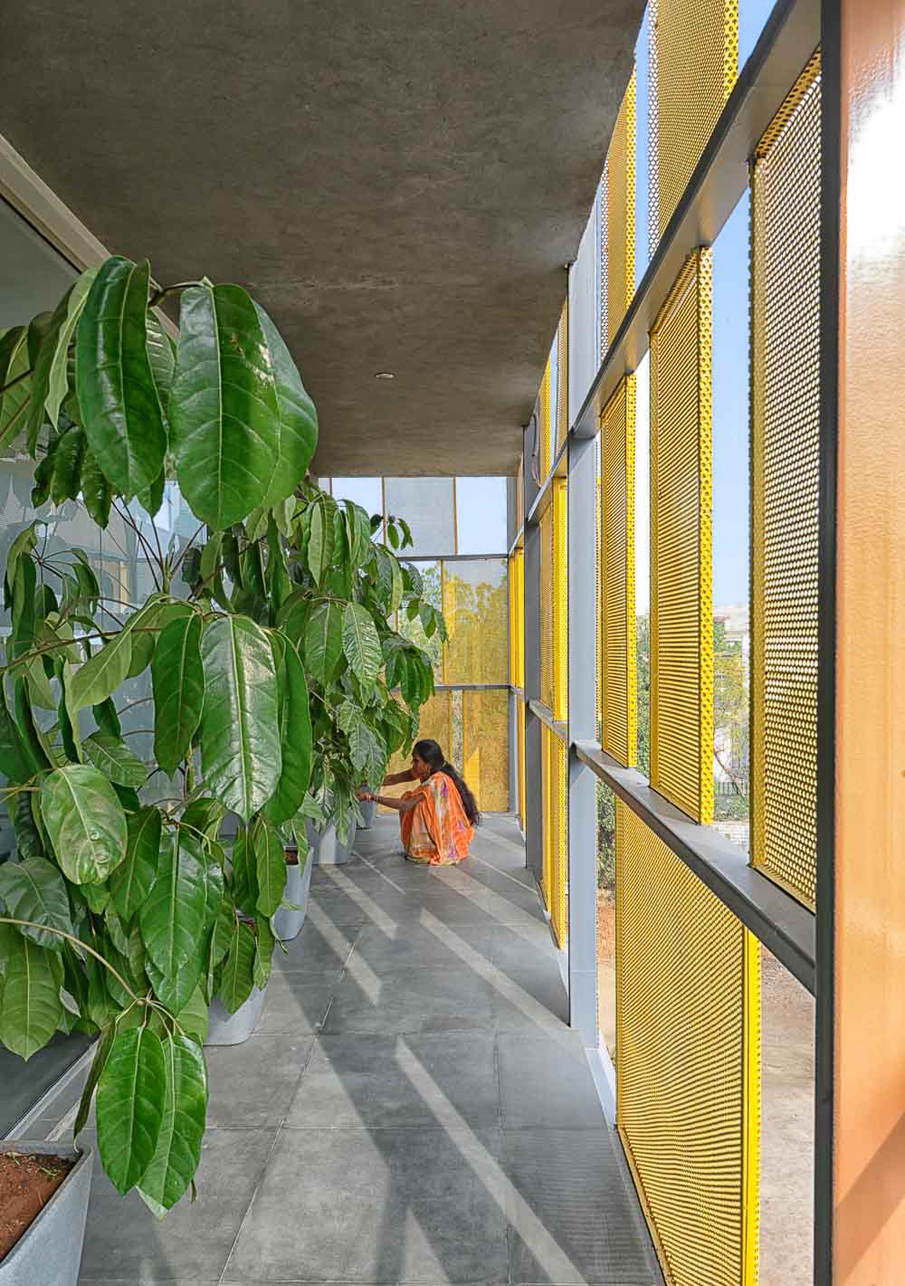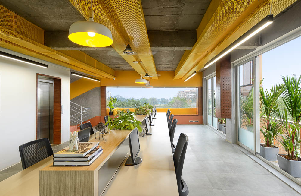 The balconies are populated with easy-maintenance plants and create a juxtaposition of green plants and yellow-orange screens behind them. All the windows and doors are operable making the balcony accessible from all the workspaces, enabling the opportunity to open the windows for cross ventilation. This also gives the users the option to reduce their dependency on air conditioning. The MGB headquarters transcends the most common approaches to deal with Hyderabad’s heat, and offers a method for passive cooling that benefits its occupants and as importantly, challenges the typical glass box typology of the office building.