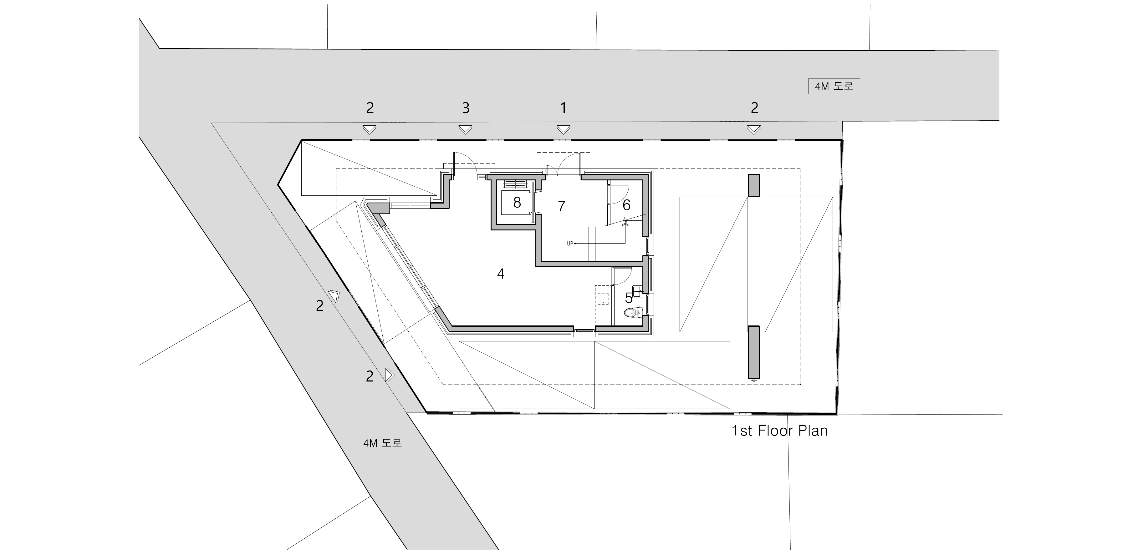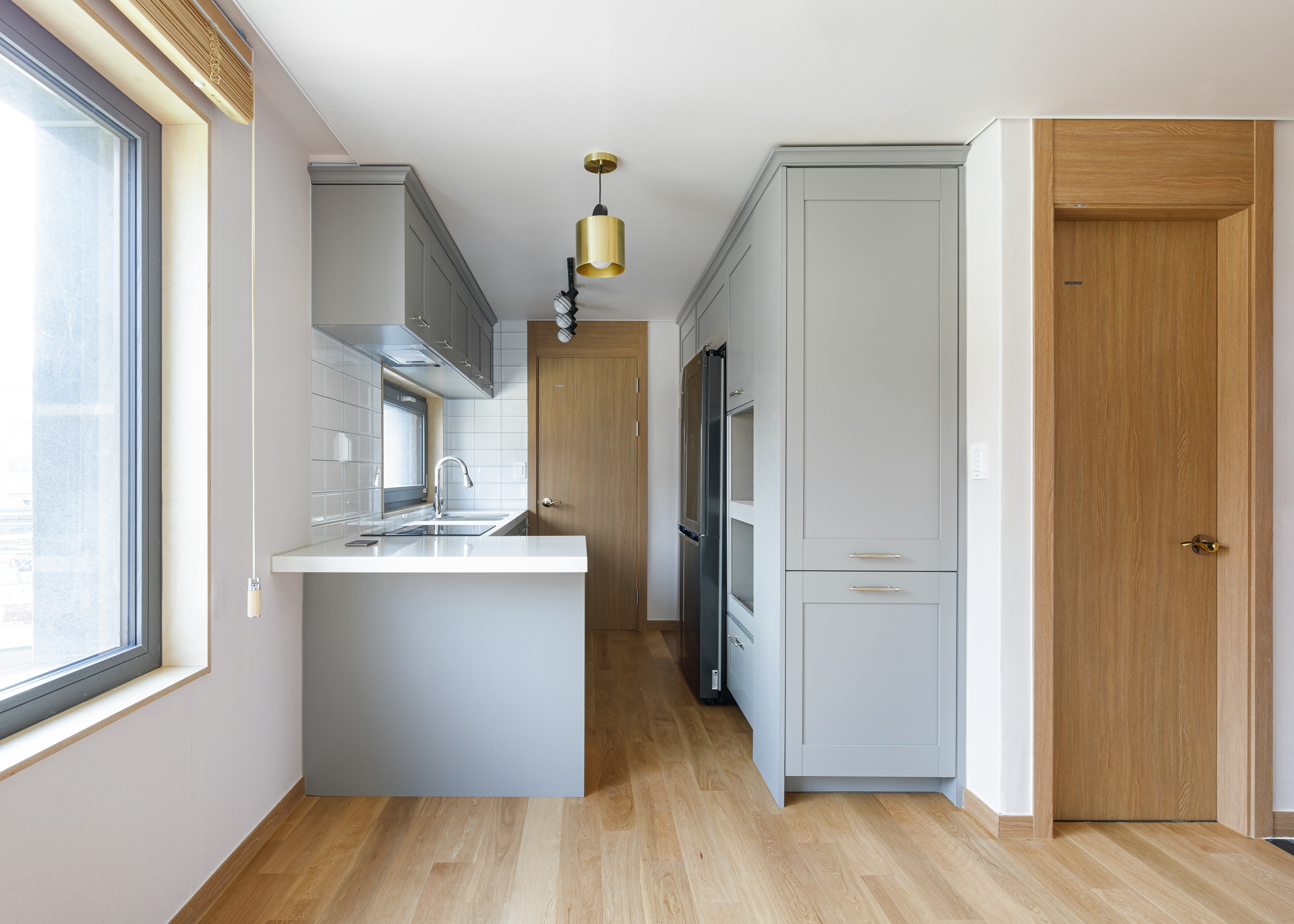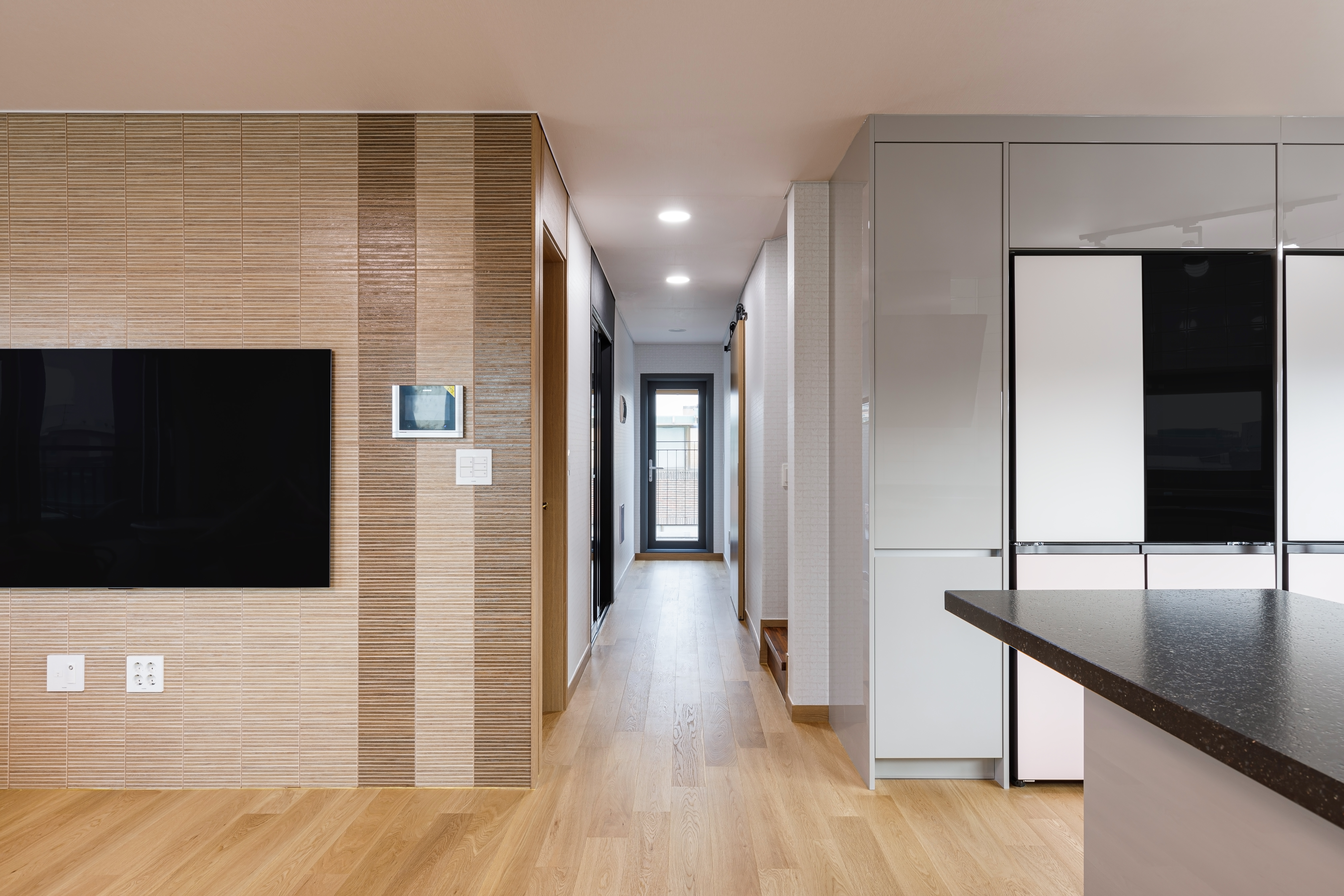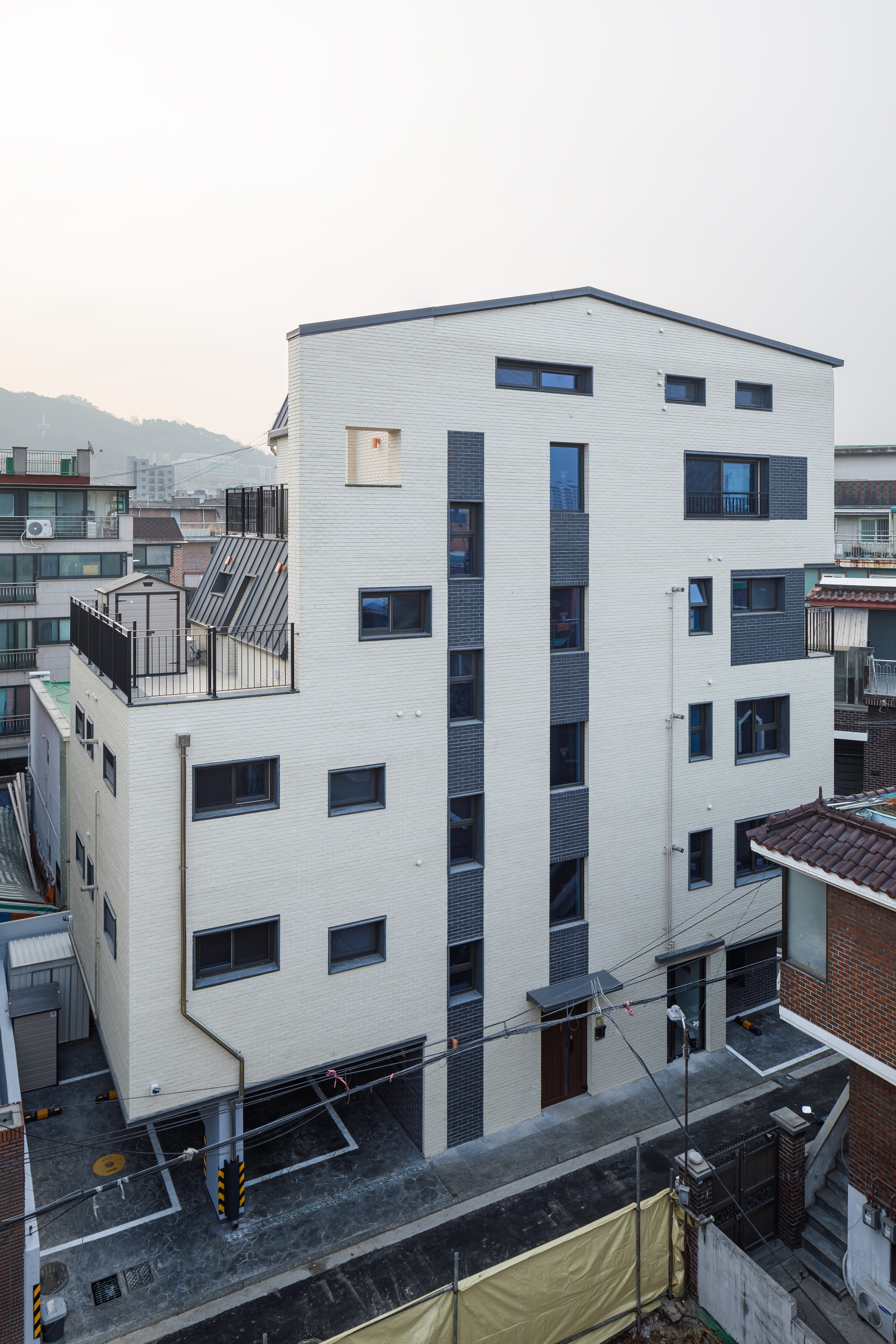 EO Sympathy is located in an old residential development areas in Junggok-dong, Gwangjin-gu, the house is a building that was formed by combining two small plots. It was designed with a commercial space on the first floor, and was planned as a multi-unit house where the client’s family and tenants can live. White bricks of facade were used as the exterior material, making it stand out more within the area among the old red brick houses, and the surrounding area’s image was attempted to be gently changed. The entrance of building is created the wood as if it have a warm energy. The terraces each were placed on the third, fourth and fifth floors to connect the both the inside and outside, and they can see as far as Yongmasan Mountain and the city center.