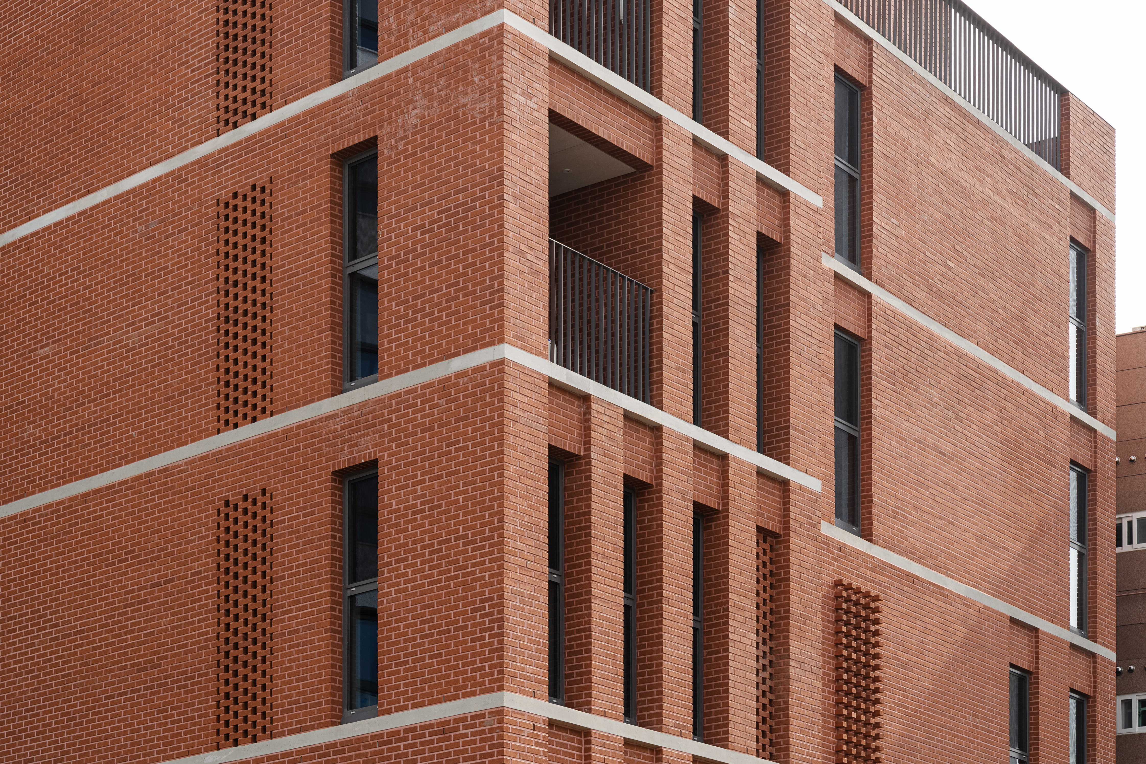 이러한 ‘거주민-프랜들리’의 공간계획 개념을 외관의 정체성으로 풀어내기 위해, 가장 친숙하고 담백한 디자인과 재료를 선정했다. 다양한 구성으로 모아진 주택들은 각 유닛의 최적의 환경을 위한 자리에 배치되고, 이를 단순하게 쌓아 올렸다. 그 과정에서 크게 3개의 다발로 나누어진 볼륨을 그들이 각자 향하고 있는 주변환경에 알맞게 열고 닫았다. 그렇게 만들어진 외관의 콘셉트를 보강할 수 있는 소소하지만 재미있는 디자인이 입면에 골고루 적용되어 단순하지만 지루하지 않은 얼굴을 갖게 되었다. 이러한 건축의 모습에 어울릴 만한 재료로서, 주택에 가장 친숙한 재료인 적벽돌과 콘크리트 노출을 조합했는데, 태생적으로 ‘쌓아’ 구축하는 벽돌의 성질을 받아들이고 이를 자연스럽게 구현하기 위해 층별로 얇은 콘크리트 띠를 내밀어 벽돌을 받쳐 쌓았다.