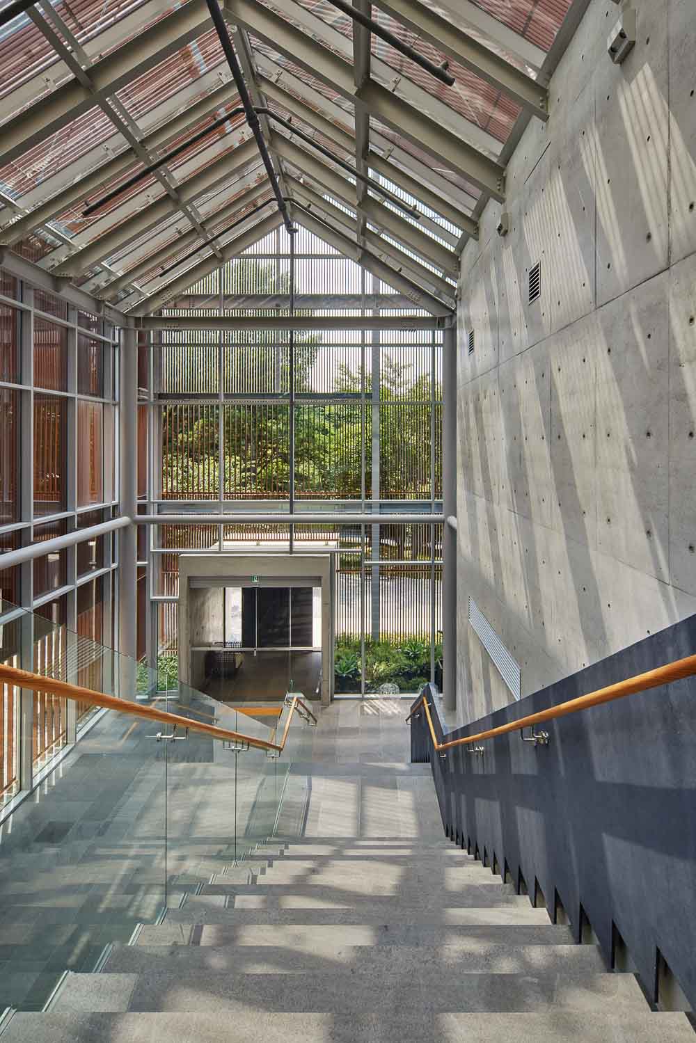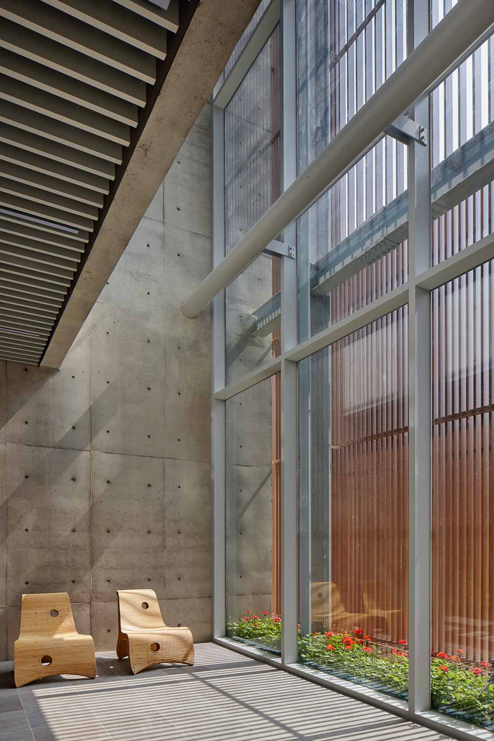 전체 매스는 루버를 통해서 빛과 그림자의 효과를 극대화 함으로 주변의 빛의 변화를 경험할 수 있게 해준다. 그러면서 동시에 주변의 자연을 시각적으로 연결해 줄 수 있게 된다. 이것은 자연과 건축물을 매개해 주는 물질로서 루버가 가지는 유연성이라고 할 수 있다.
