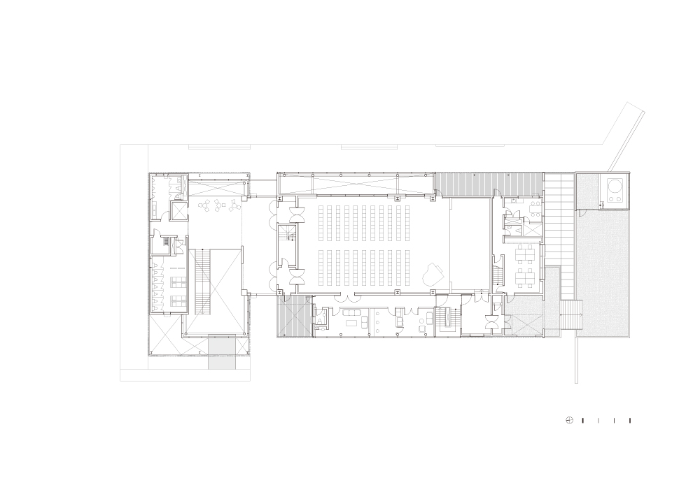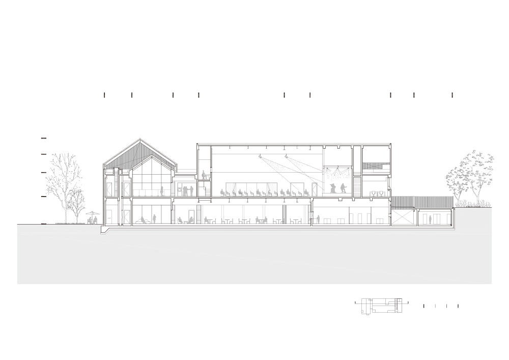 2층은 강연과 공연을 위한 공간이며 공연자(강연자)와 관객 동선이 겹치지 않게 공간을 구성했다. 그러면서도 공연자(강연자)와 관객을 위한 외부 공간을 곳곳에 만들어 주변의 자연을 경험할 수 있도록 구성했다. 건물의 외부 공간은 자연과 건물이 만나는 중간지대로서 의미를 가지게 된다.