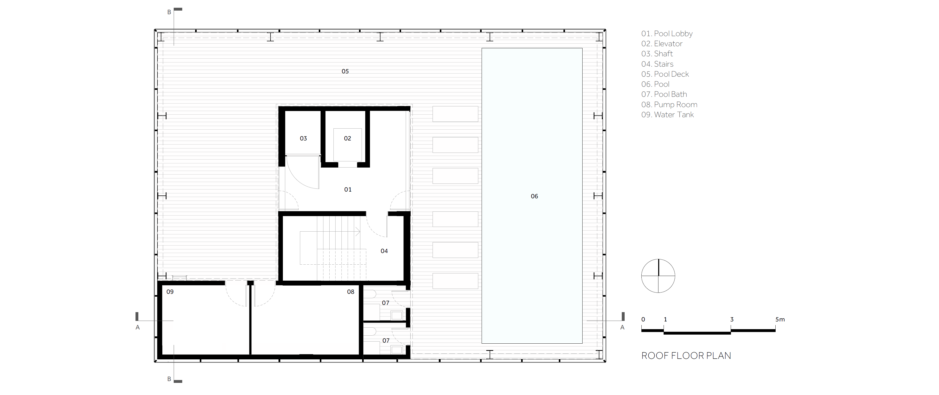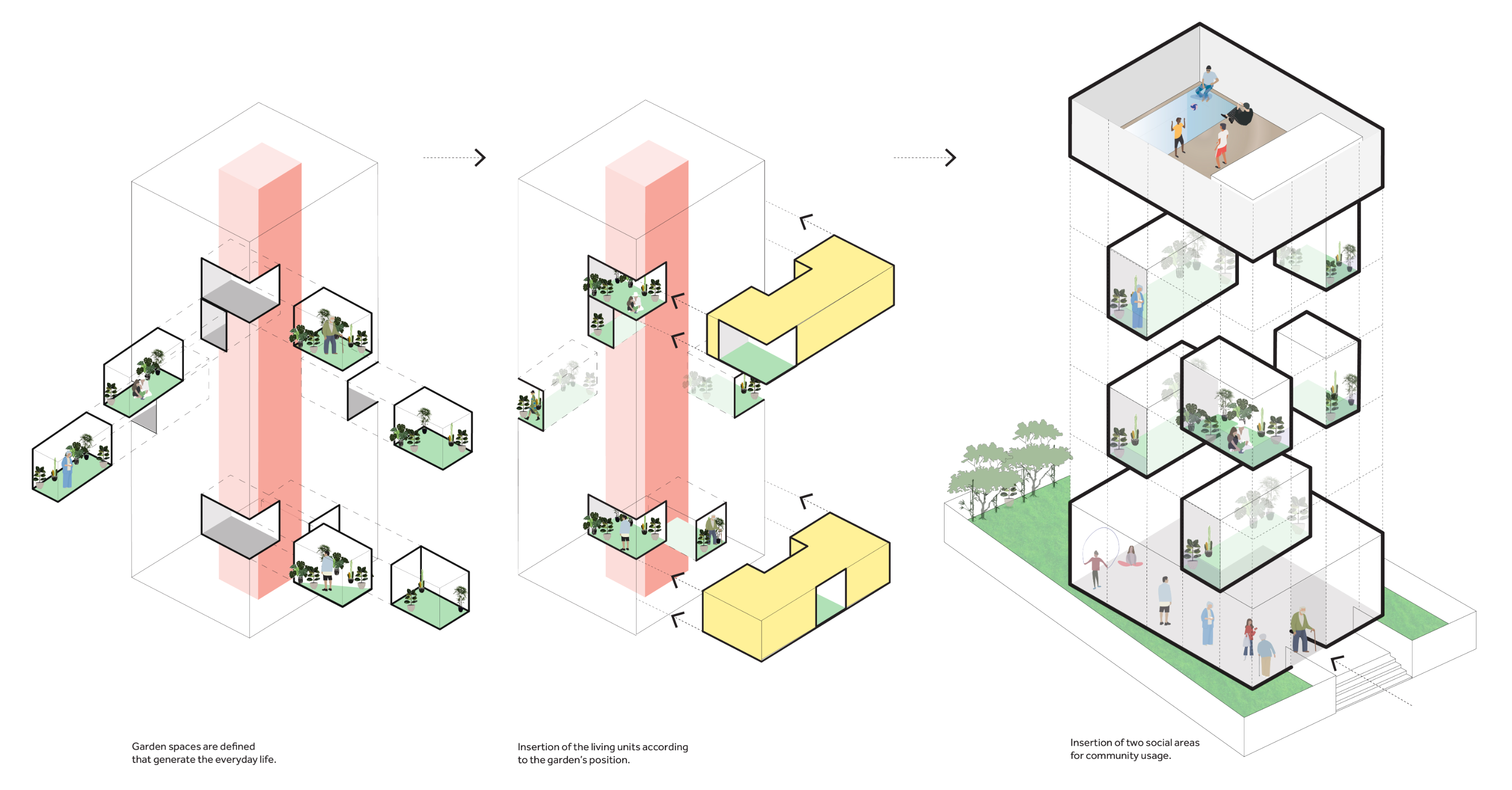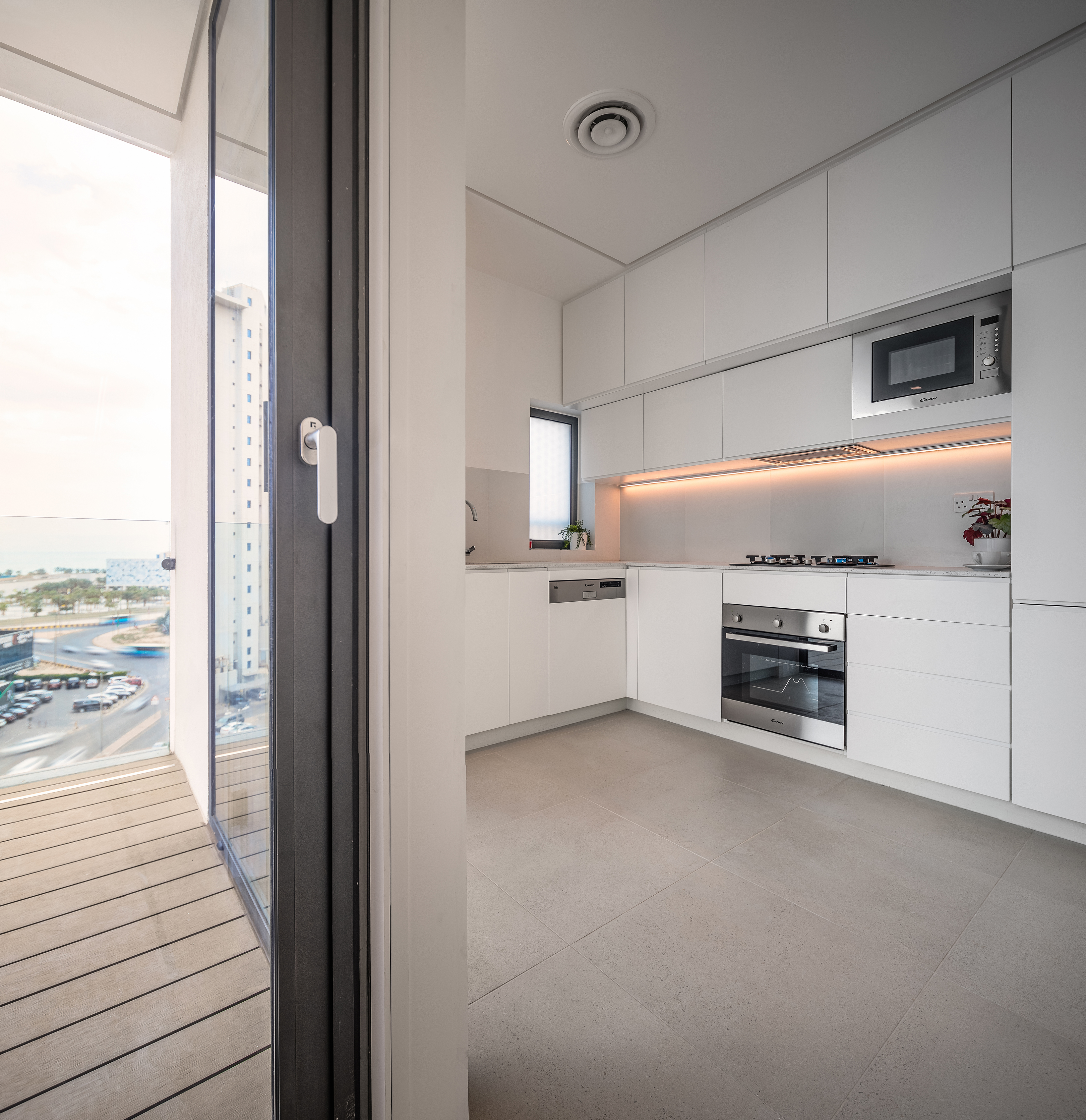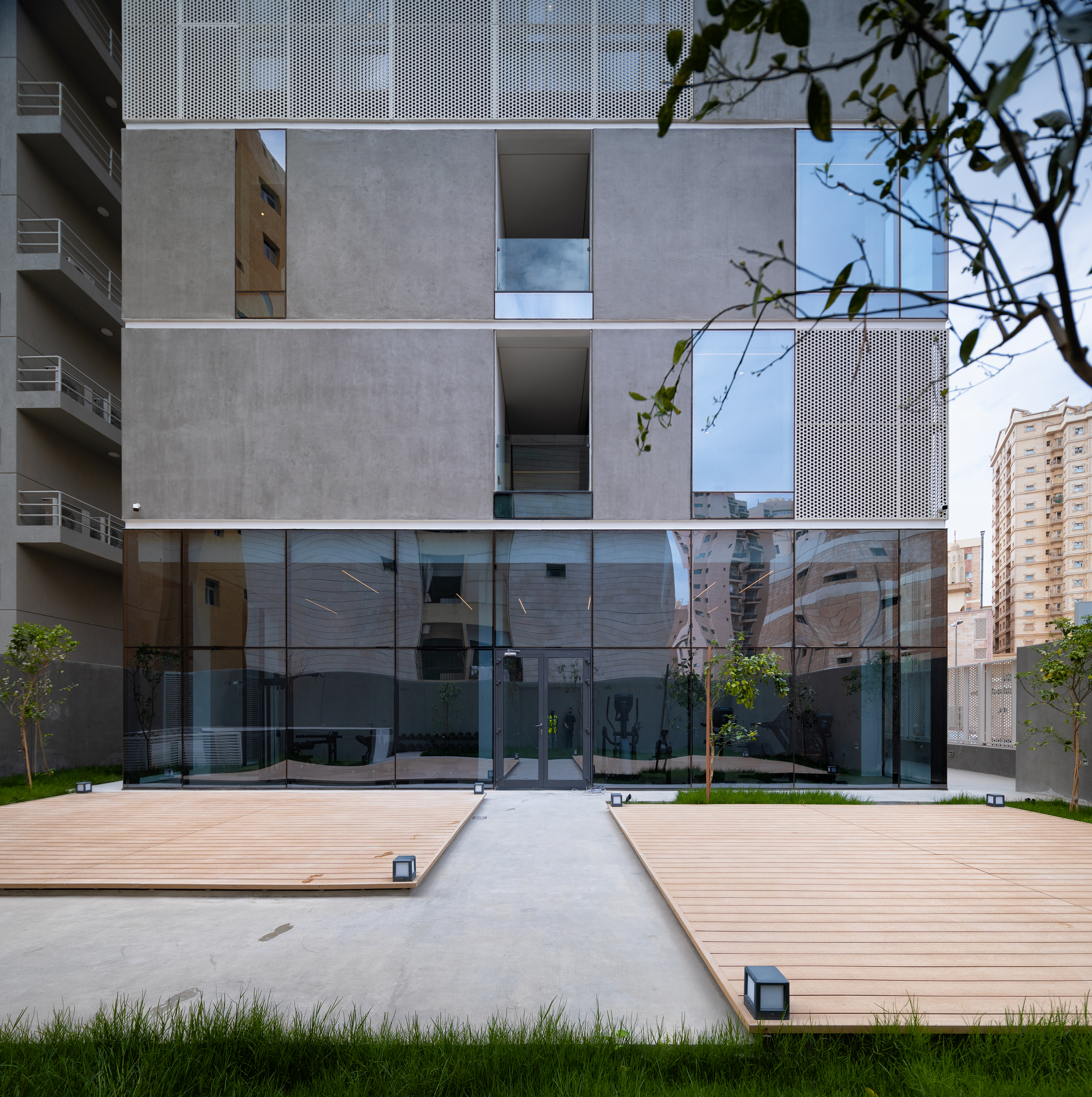 Jade is a midrise multi-unit residential building in Salmiya, Kuwait, that houses 20 independent residential units spread over 10 floors, a double-basement parking, an open plan ground floor with a gym and kids play area, a rooftop social space with a pool and barbeque area. The exterior envelope is a composite skin of light concrete, perforated aluminum panels and high-performance glass panels. The design of the building aims to facilitate an urban and sustainable way of living for young families. The building occupies a compact urban lot in a high - density area with close proximity to neighboring buildings. The placement of the building is determined by the existing plot constraints. Pedestrian access and lobby face the broad avenue, while services are accessed through the side street. North and west facades are privileged for their open views and urban relation defining the building's image. The living units are organized around the access core with interior gardens connecting different living spaces. Social spaces face the main avenue and the sea, while private areas turn to the southeast side. Through the variation of patio and balcony positions, different floorplans are achieved. The individuality expressed in the floorplans translates into the facades creating a staggered composition that brings lightness to the tower. A careful analysis of the sun movements with the height of surrounding buildings helped develop the facade by employing strategic subtractive operations. The perforated metal cladding provides adequate thermal protection along with the insulated concrete panels, to withstand the harsh desert climate. Jade is designed to be a housing project that goes against the grain amongst the chaotic urban density. It successfully solves the crucial issues in Kuwait's current multi-unit housing typology - lack of identity, natural lighting, accessible green and communal spaces, without compromising the original qualities combating extreme weather typical in Kuwait.