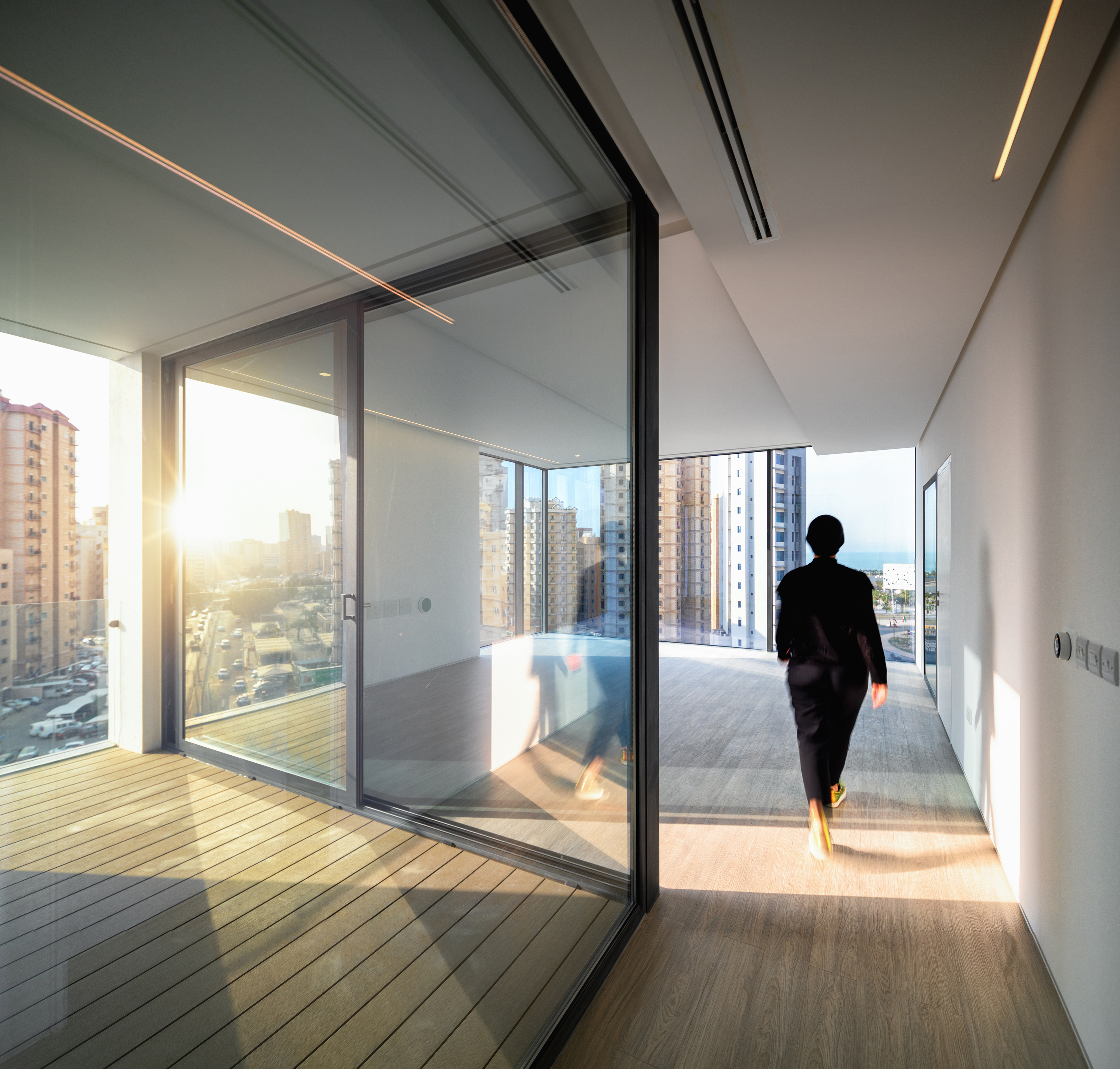 Jade is a midrise multi-unit residential building in Salmiya, Kuwait, that houses 20 independent residential units spread over 10 floors, a double-basement parking, an open plan ground floor with a gym and kids play area, a rooftop social space with a pool and barbeque area. The exterior envelope is a composite skin of light concrete, perforated aluminum panels and high-performance glass panels. The design of the building aims to facilitate an urban and sustainable way of living for young families. The building occupies a compact urban lot in a high - density area with close proximity to neighboring buildings. The placement of the building is determined by the existing plot constraints. Pedestrian access and lobby face the broad avenue, while services are accessed through the side street. North and west facades are privileged for their open views and urban relation defining the building's image. The living units are organized around the access core with interior gardens connecting different living spaces. Social spaces face the main avenue and the sea, while private areas turn to the southeast side. Through the variation of patio and balcony positions, different floorplans are achieved. The individuality expressed in the floorplans translates into the facades creating a staggered composition that brings lightness to the tower. A careful analysis of the sun movements with the height of surrounding buildings helped develop the facade by employing strategic subtractive operations. The perforated metal cladding provides adequate thermal protection along with the insulated concrete panels, to withstand the harsh desert climate. Jade is designed to be a housing project that goes against the grain amongst the chaotic urban density. It successfully solves the crucial issues in Kuwait's current multi-unit housing typology - lack of identity, natural lighting, accessible green and communal spaces, without compromising the original qualities combating extreme weather typical in Kuwait.