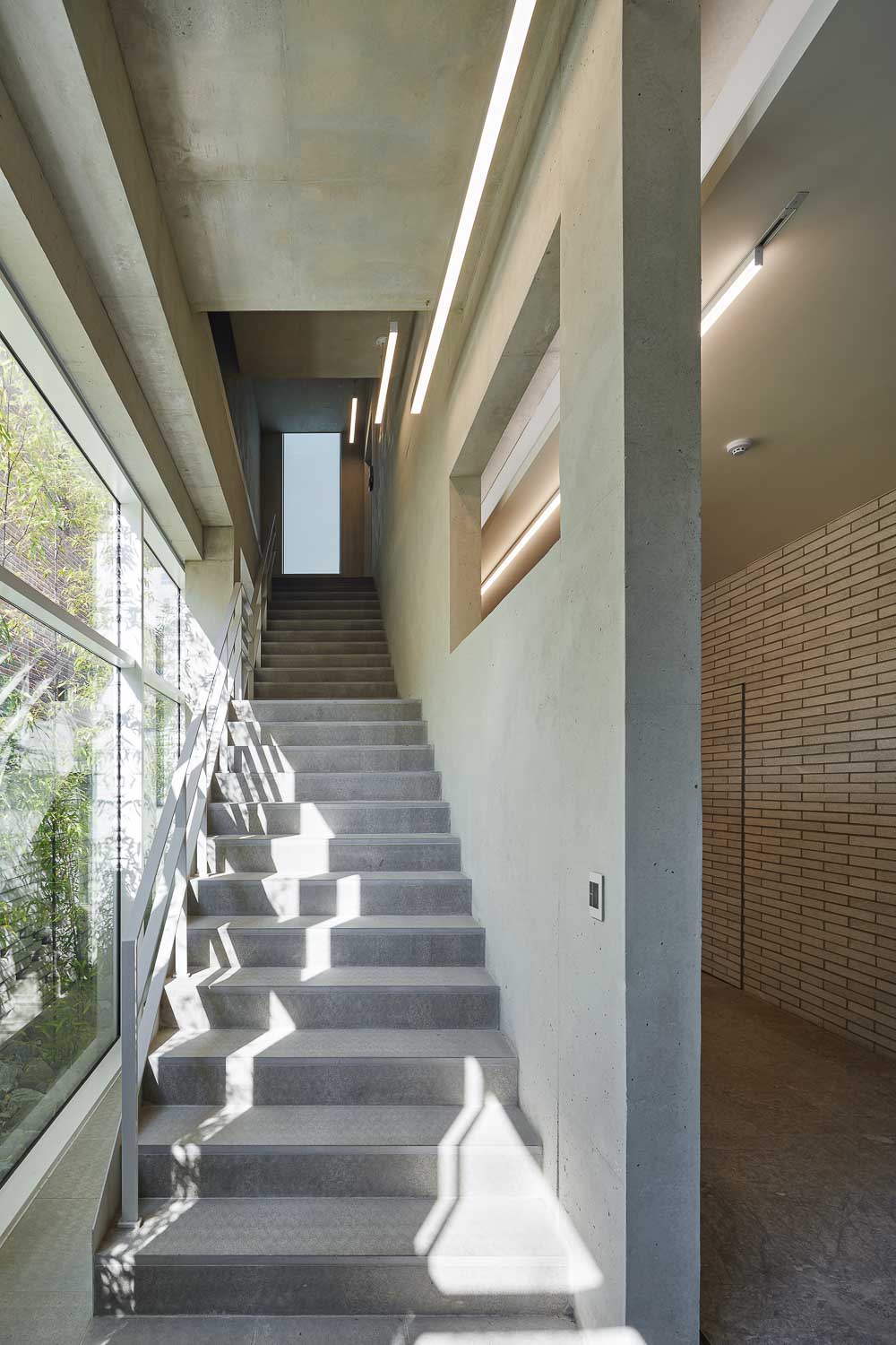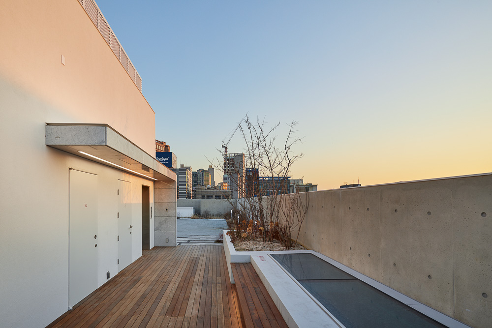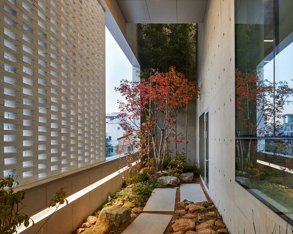 건축물 내부에 만든 외부공간은 도시와 일상의 복잡함으로부터 분리시켜 서로 전혀 다른 느낌을 가진 두 개의 공간으로 만들었다. 하나의 공간은 원시적인 자연을 표현한 돌과 물을 바탕으로 한 정원 그리고 다른 하나는 나무데크와 정형화된 금속 플랜트 박스로 구성한 공간으로 이루어졌다. 이것은 한 건축물 안에 다른 형태의 외부공간을 통해, 자연이 만들어낸 변화에 대한 낯섦, 기대, 설렘, 공감과 같은 다양한 감정을 불러일으킬 수 있길 의도한 것이다.