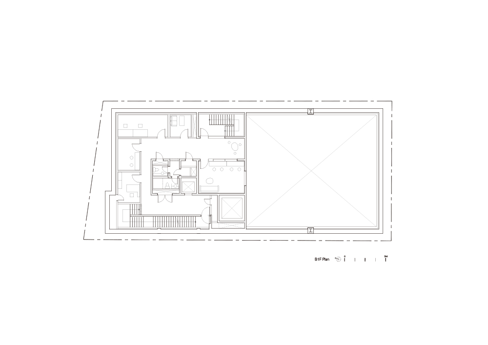 This building was designed as a work space for advertising people. For the purpose of securing functional efficiency and avoiding the overlapping of paths of employees and visitors during shooting, the studio and dressing room are located on the underground floor while office areas for employees are placed on the floors above ground level. At the same time, it needed to design outside spaces for people to take a rest or host an outdoor event.