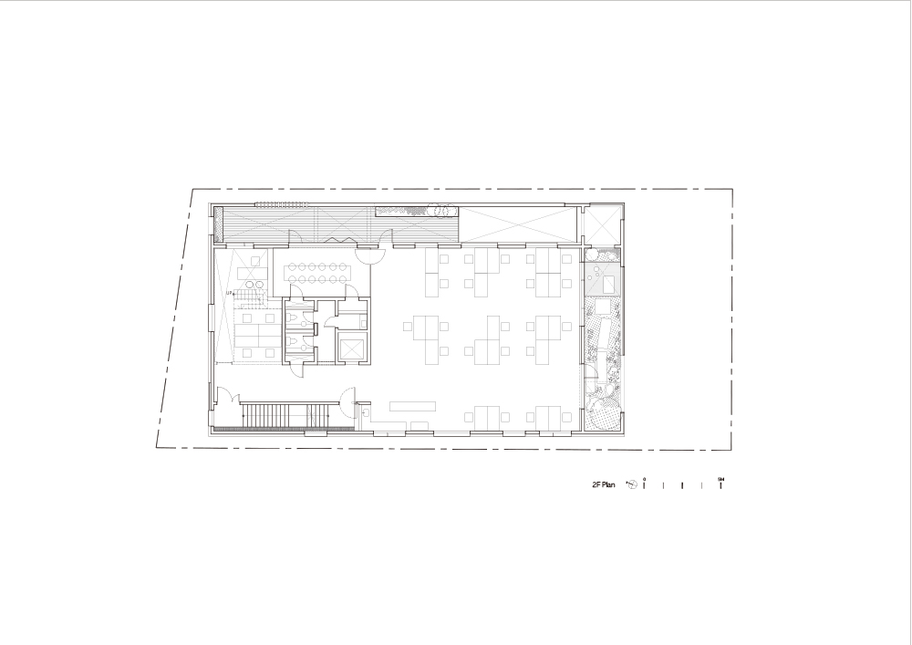 Two outside spaces giving impression that is utterly different from each other being separated from the complexity of cities and everyday life, were created inside the building. One space is a garden that mainly consists of stones and water representing primitive nature, and the other is a space composed of a wooden deck and standardized metal plant boxes, wishing for giving rise to various emotions through outdoor areas with different shapes inside a building. Unfamiliarity, expectation, excitement, empathy… of changes caused by nature.
