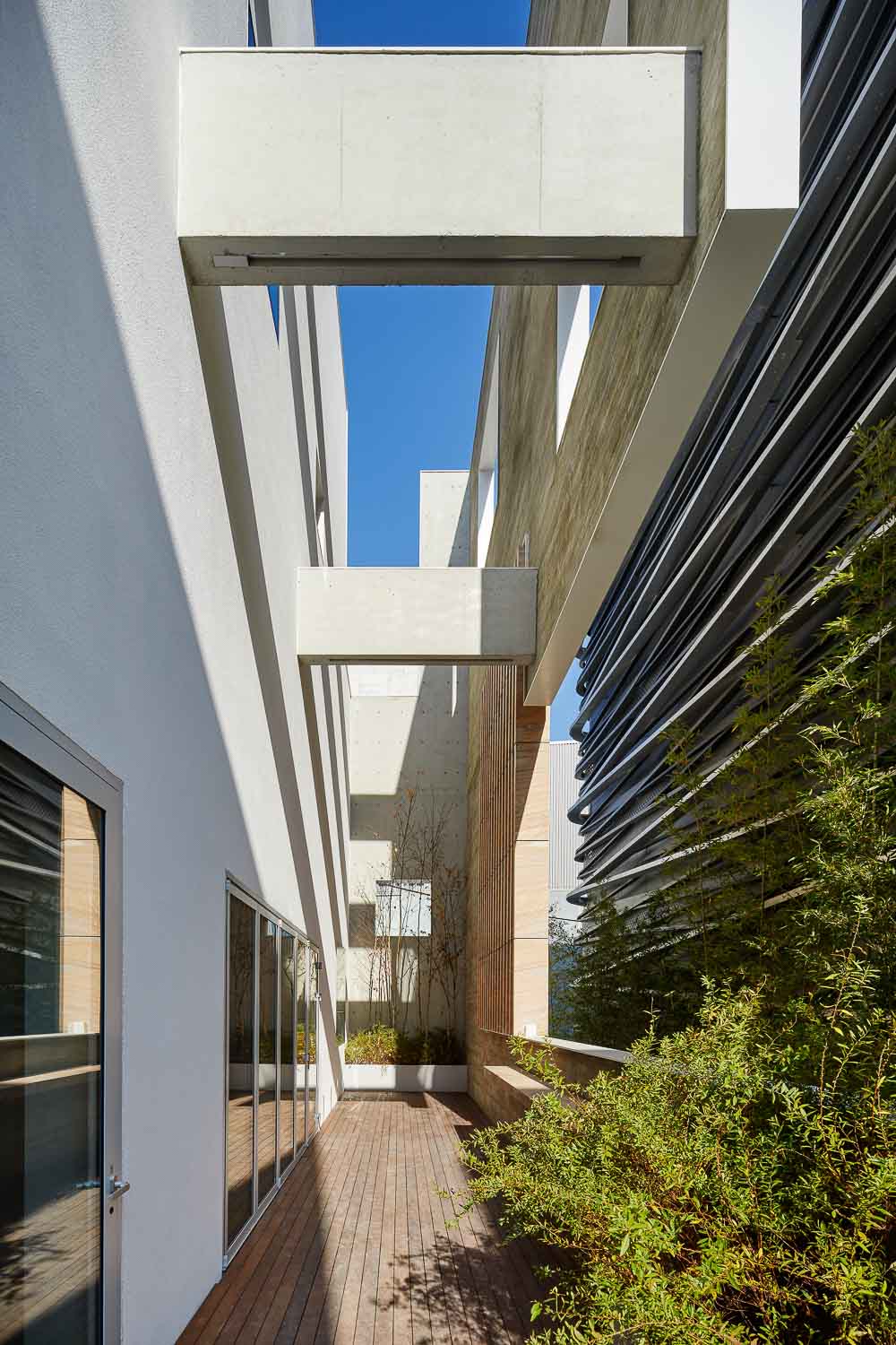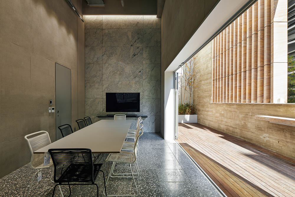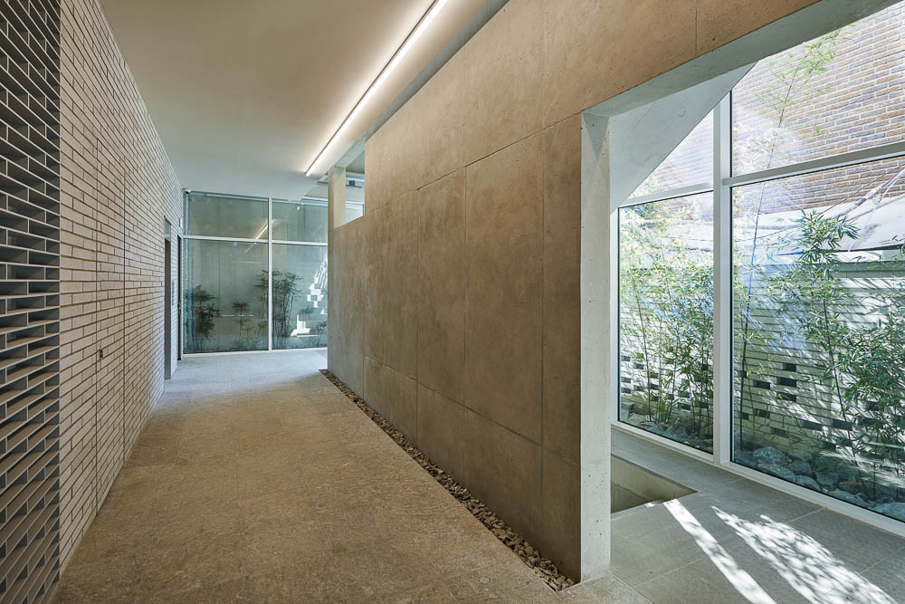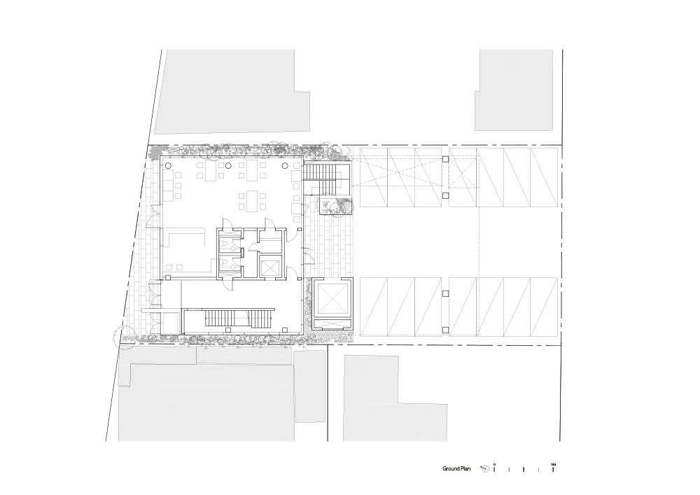 This building was designed as a work space for advertising people. For the purpose of securing functional efficiency and avoiding the overlapping of paths of employees and visitors during shooting, the studio and dressing room are located on the underground floor while office areas for employees are placed on the floors above ground level. At the same time, it needed to design outside spaces for people to take a rest or host an outdoor event.