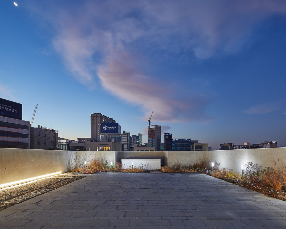 건축물 내부에 만든 외부공간은 도시와 일상의 복잡함으로부터 분리시켜 서로 전혀 다른 느낌을 가진 두 개의 공간으로 만들었다. 하나의 공간은 원시적인 자연을 표현한 돌과 물을 바탕으로 한 정원 그리고 다른 하나는 나무데크와 정형화된 금속 플랜트 박스로 구성한 공간으로 이루어졌다. 이것은 한 건축물 안에 다른 형태의 외부공간을 통해, 자연이 만들어낸 변화에 대한 낯섦, 기대, 설렘, 공감과 같은 다양한 감정을 불러일으킬 수 있길 의도한 것이다.