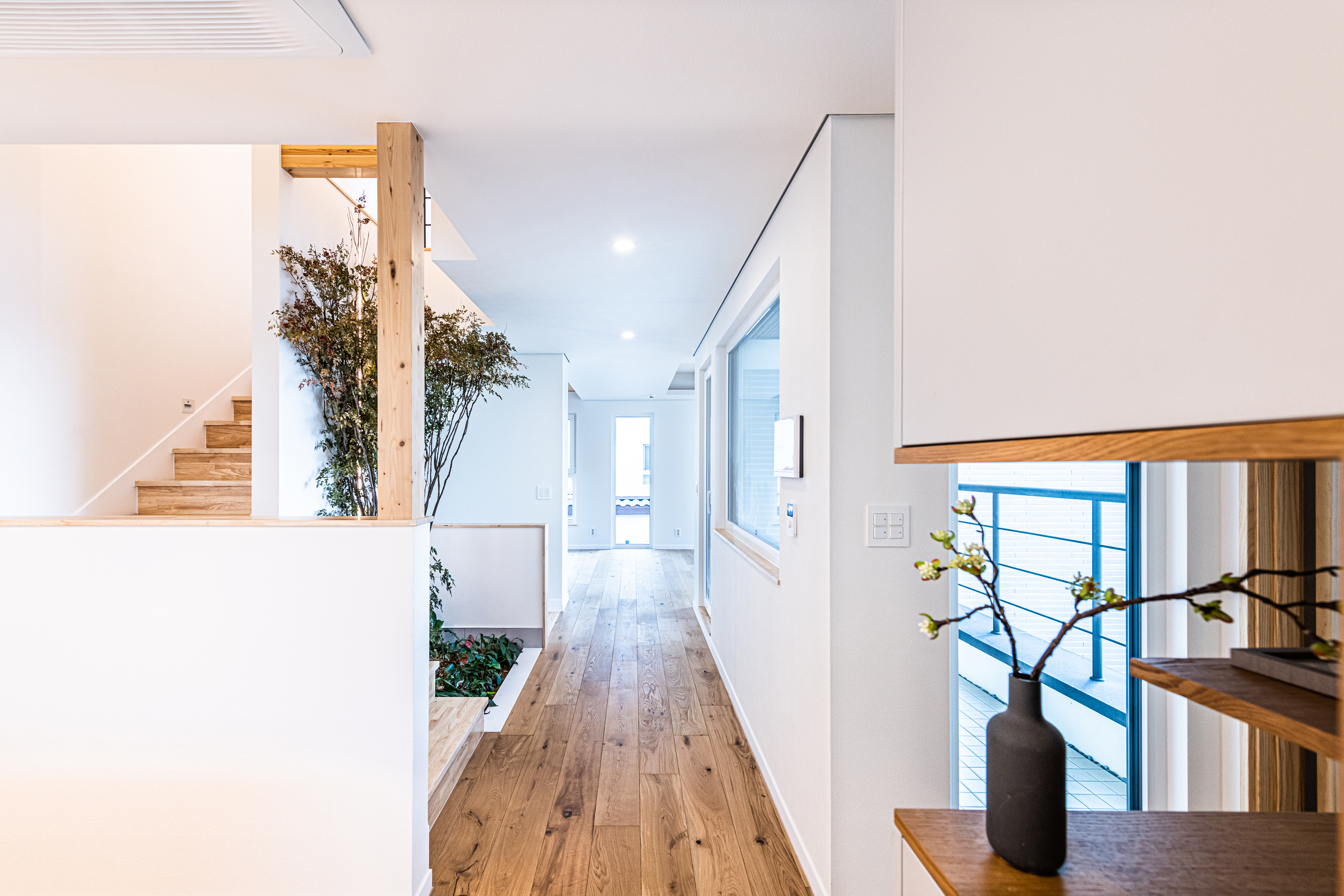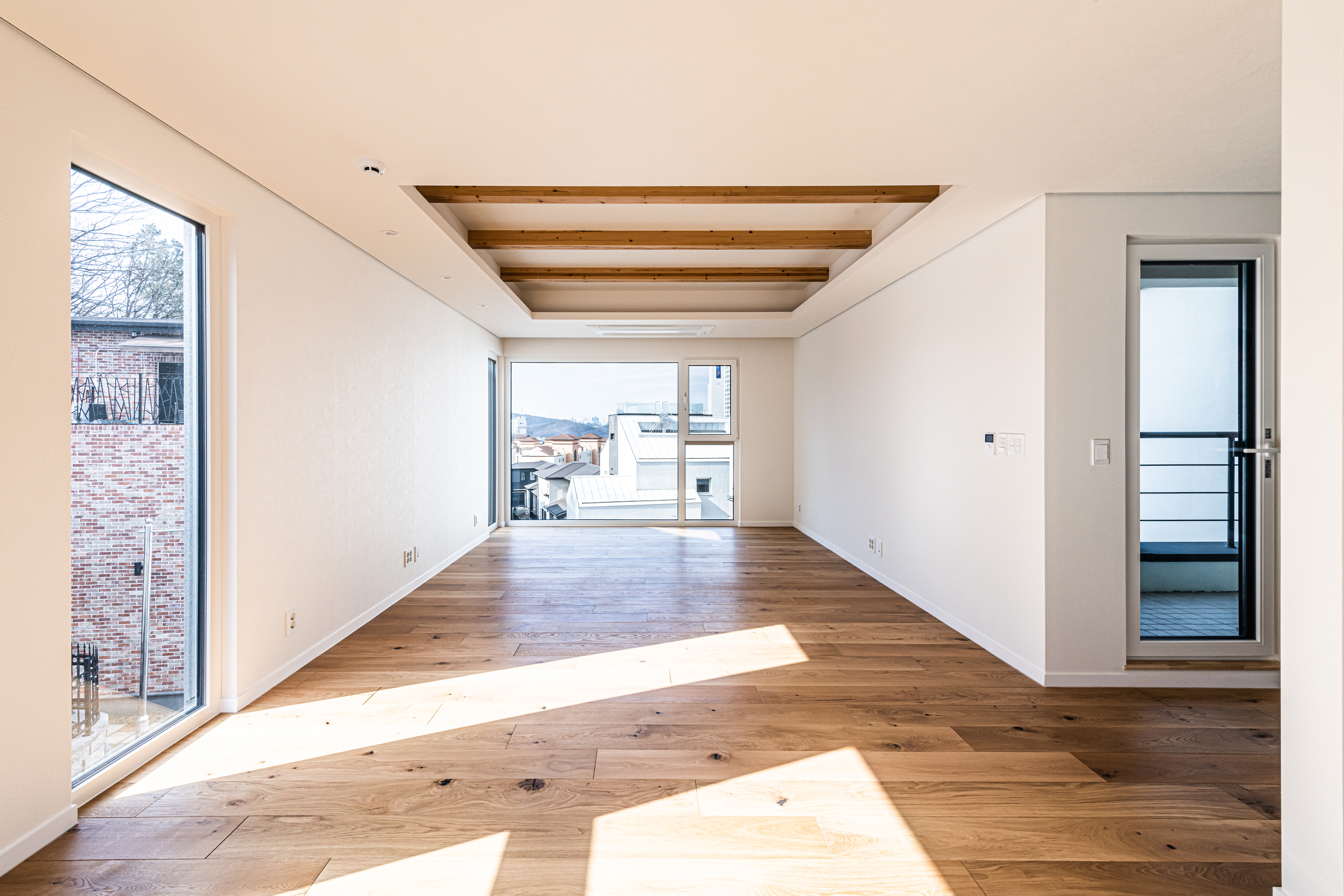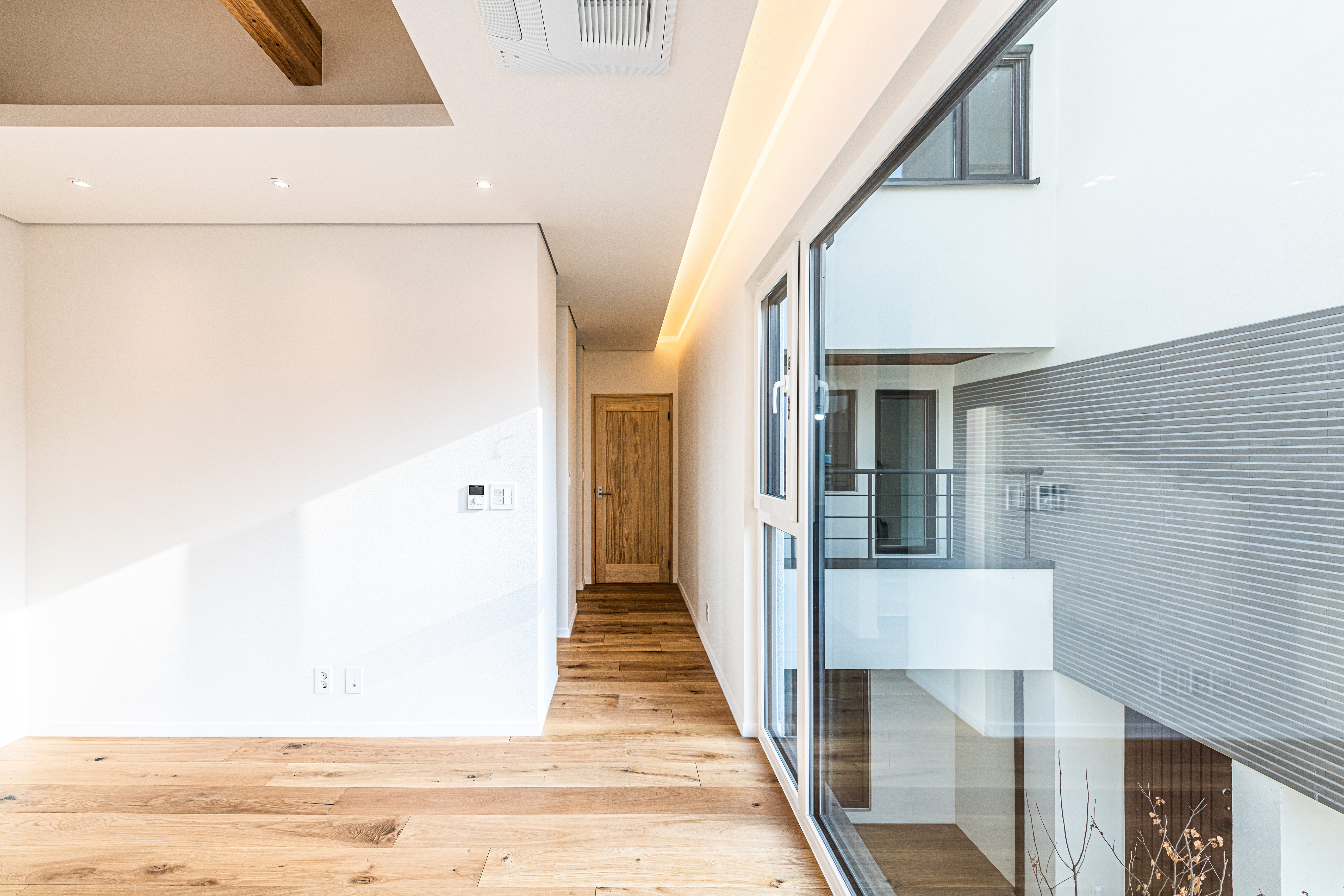 The main rooms, the living room, kitchen, dining room, and couple's bedroom, were placed on the second floor. The reason is to consider blocking the line of sight on the road and to have a view of Mt. Bora and the city center at the same time. A balcony was installed in the courtyard of the U-shaped mass, and trees were planted right in front. The architect planned the psychological stability and connection with the outside by making it possible to feel nature even on the second floor and invisible from the outside. This part is also usefully used when caring for plants. The flower garden inside the open part of the stairs is also connected to this balcony, and you can water it comfortably by taking care of drainage and waterproofing. It can be said that the architect's special consideration was given to creating a natural landscaping space even on the second floor, which was cut off from the site, and to establish a relationship between the inside and outside. The children's rooms on the 3rd floor facing south were designed to let in the warm sunlight through large windows. The roof garden, formed naturally due to the restriction of the direct north sunlight, allows you to enjoy nature and the sky through the gaps in the surrounding houses. It is also connected naturally with the laundry room.