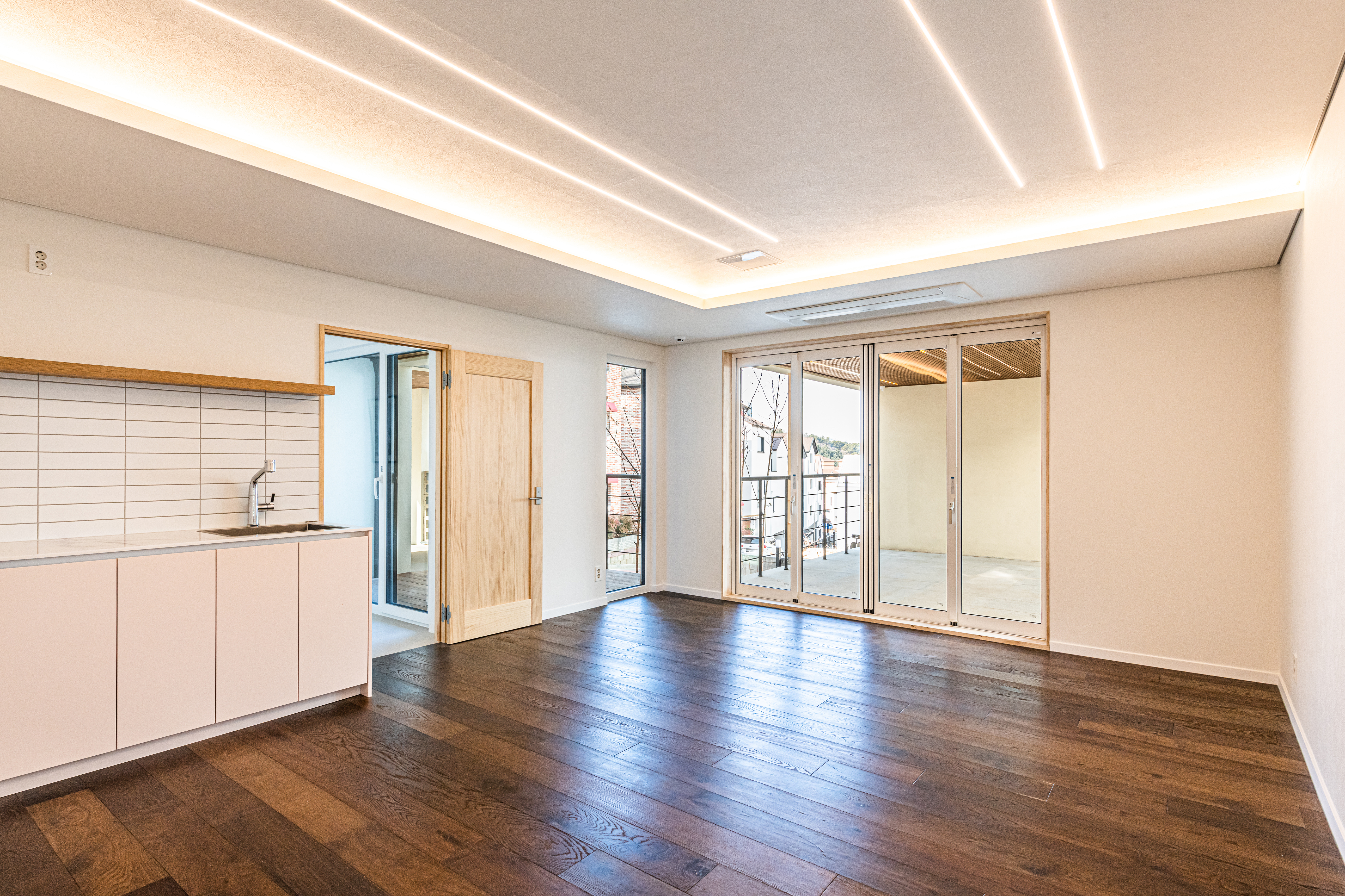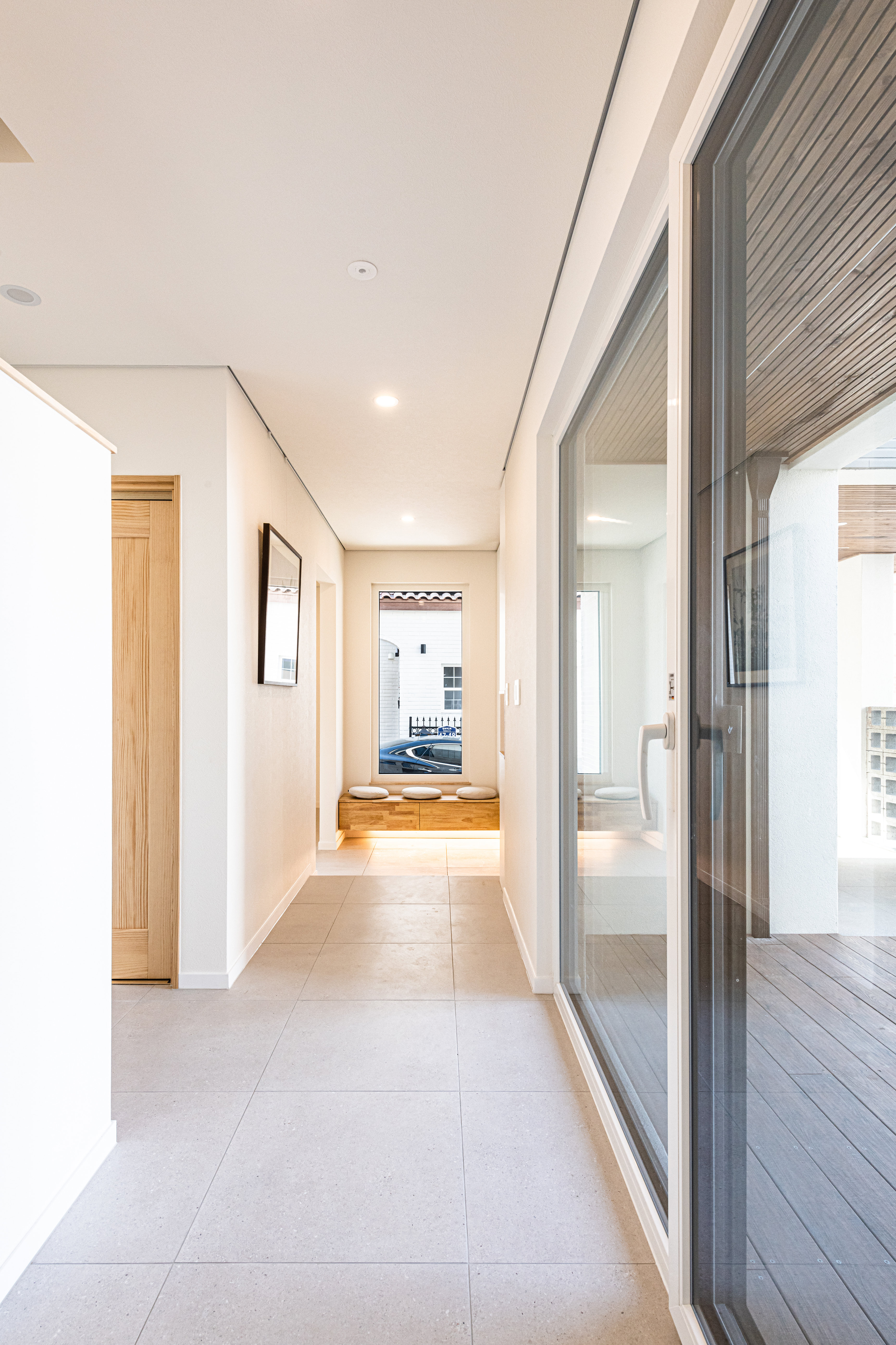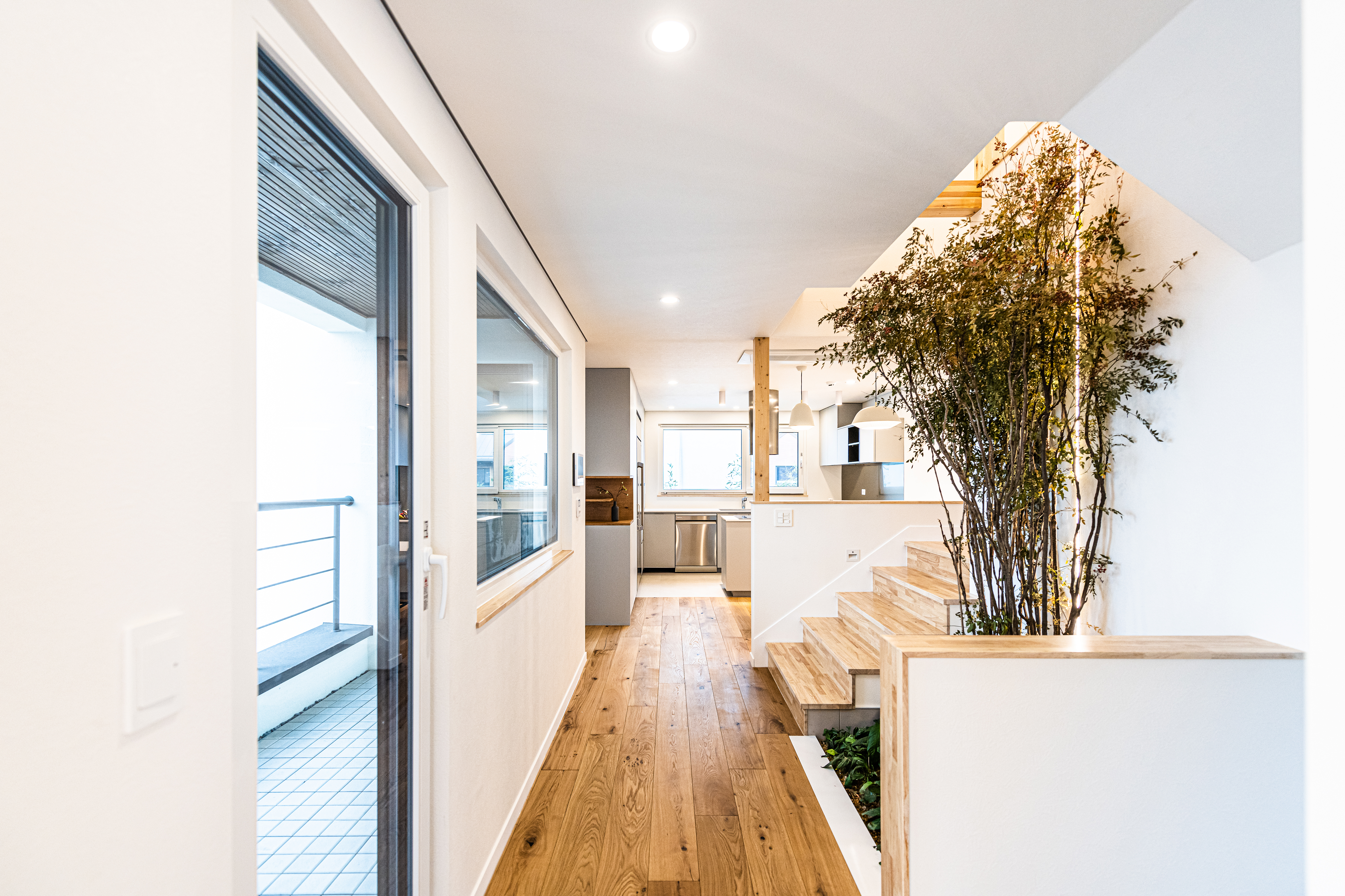 The main rooms, the living room, kitchen, dining room, and couple's bedroom, were placed on the second floor. The reason is to consider blocking the line of sight on the road and to have a view of Mt. Bora and the city center at the same time. A balcony was installed in the courtyard of the U-shaped mass, and trees were planted right in front. The architect planned the psychological stability and connection with the outside by making it possible to feel nature even on the second floor and invisible from the outside. This part is also usefully used when caring for plants. The flower garden inside the open part of the stairs is also connected to this balcony, and you can water it comfortably by taking care of drainage and waterproofing. It can be said that the architect's special consideration was given to creating a natural landscaping space even on the second floor, which was cut off from the site, and to establish a relationship between the inside and outside. The children's rooms on the 3rd floor facing south were designed to let in the warm sunlight through large windows. The roof garden, formed naturally due to the restriction of the direct north sunlight, allows you to enjoy nature and the sky through the gaps in the surrounding houses. It is also connected naturally with the laundry room.