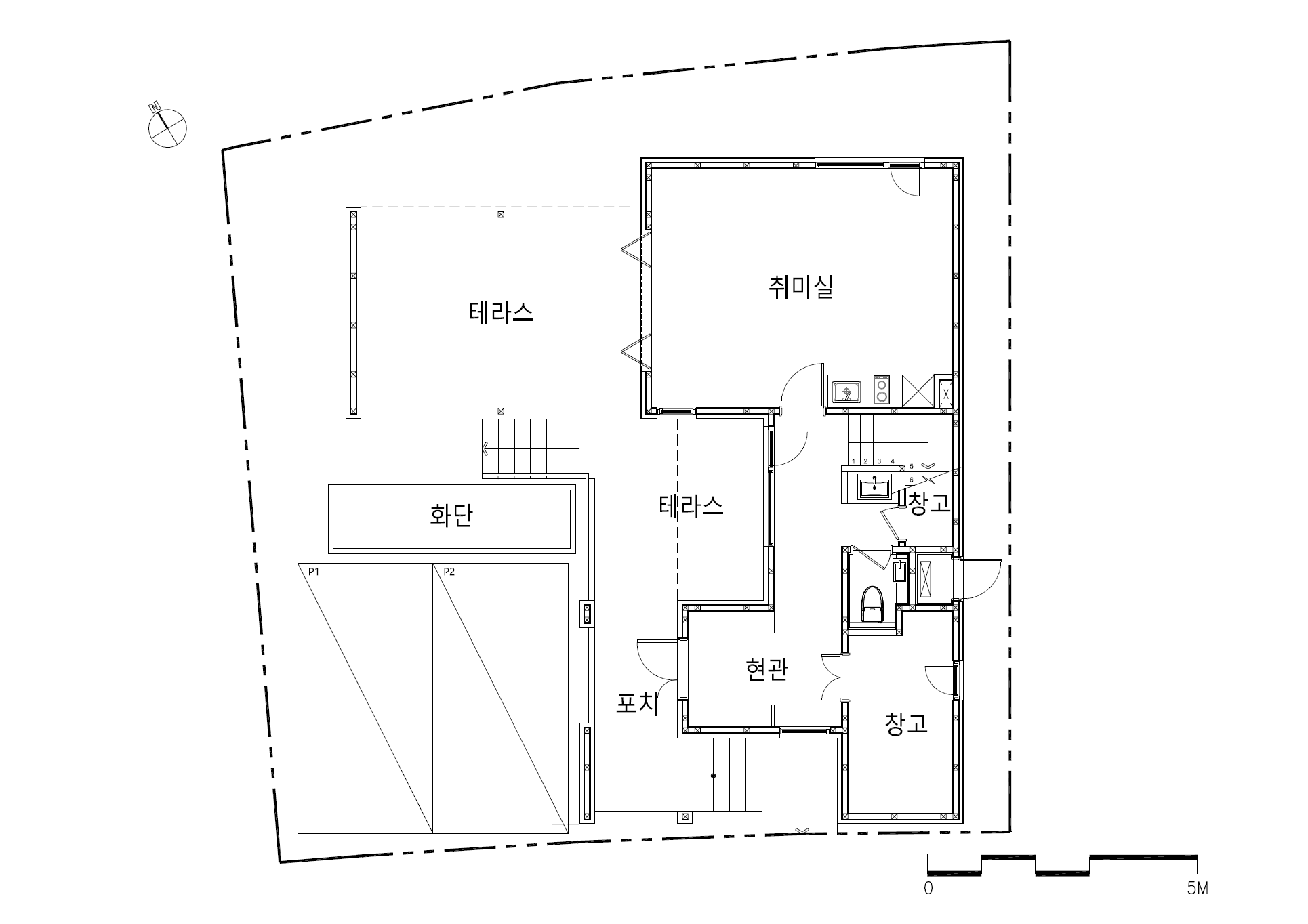 주요 실들인 거실, 주방, 식당, 부부침실은 2층에 배치했다. 그 이유는 도로에서의 시선 차단을 고려하고 보라산과 도심의 조망을 한꺼번에 가질 수 있도록 하기 위함이다. ㄷ자 매스의 중정에는 발코니를 설치하고 바로 앞에 교목을 식재했다. 건축가는 2층 내부에서도 자연을 느낄 수 있고 외부에서는 잘 보이지 않게 함으로써 심리적 안정감과 외부와의 연결을 계획한 것이다. 이 부분은 식물을 가꿀 때도 유용하게 활용된다. 대지와 단절된 2층에서도 자연스러운 조경공간을 만들어 내외부의 관계 맺기를 고려한 부분은 건축가의 특별한 배려라고 할 수 있다. 3층 남향에 배치된 자녀 방들은 커다란 창호로 따뜻한 햇살을 한껏 받아들이게 계획했다. 정북일조 사선제한으로 자연스럽게 형성된 옥상 정원은 주변 주택의 틈새로 자연과 하늘을 누릴 수 있다. 세탁실과도 자연스럽게 연계된다.