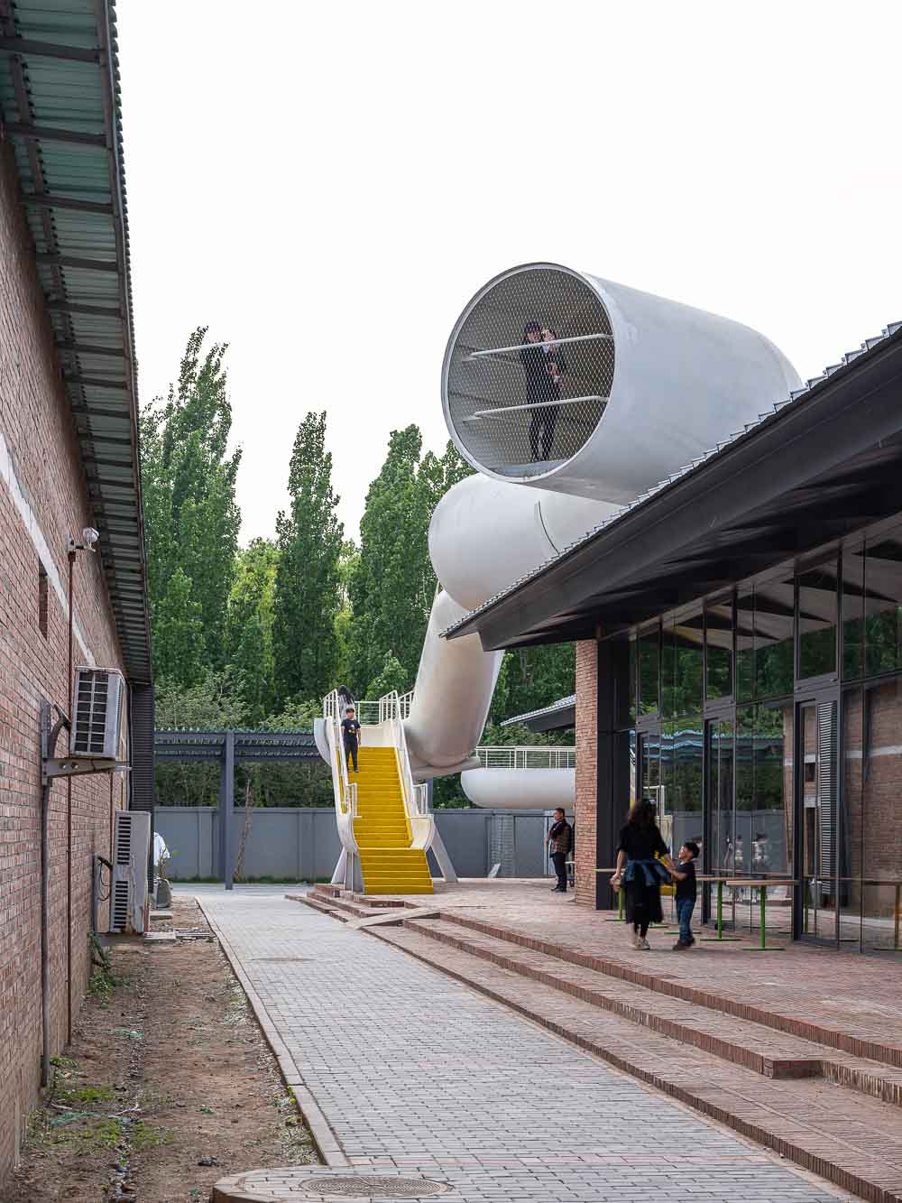 '더 플레이스케이프'는 베이징 북부에 있던 산업 단지의 내부를 바꾼 프로젝트로, 기존 건물은 1970년대의 운송시설이 지원하는 곡물 저장 창고 단지였다. 건축주는 다양한 연령대의 움직임과 관련해 아이들의 발달을 관찰하고 지원하는 전문 의료 관계자다. ‘더 플레이스케이프’는 아이들이 균형과 자기 몸을 인식하는 감각을 발달시키고 꿈을 꾸게 하면서 학습을 촉진하는 도구다. 균형은 도전을 받을 때까지 당연하게 여겨진다. 건축가는 환경과 인식에 대한 감정적 반응을 기반으로 하는 활동들이 활용되기를 바랐다. 아동 발달에서 조절 능력을 키우는 데 도움이 되도록 건물을 보강했다. 건물 단지는 안뜰을 둘러싼 창고들로 형성되어 있었다. 남쪽 건물과 옥상 테라스를 연결하는 공중 다리를 두어 분리됐던 건물을 다시 연결했다. 이러한 접근은 가까운 유치원으로 가는 전용 동선이 되며, 가까운 공원으로 갈 수도 있다. 기존의 단지에서는 3개의 실내 놀이공간을 제공했다.